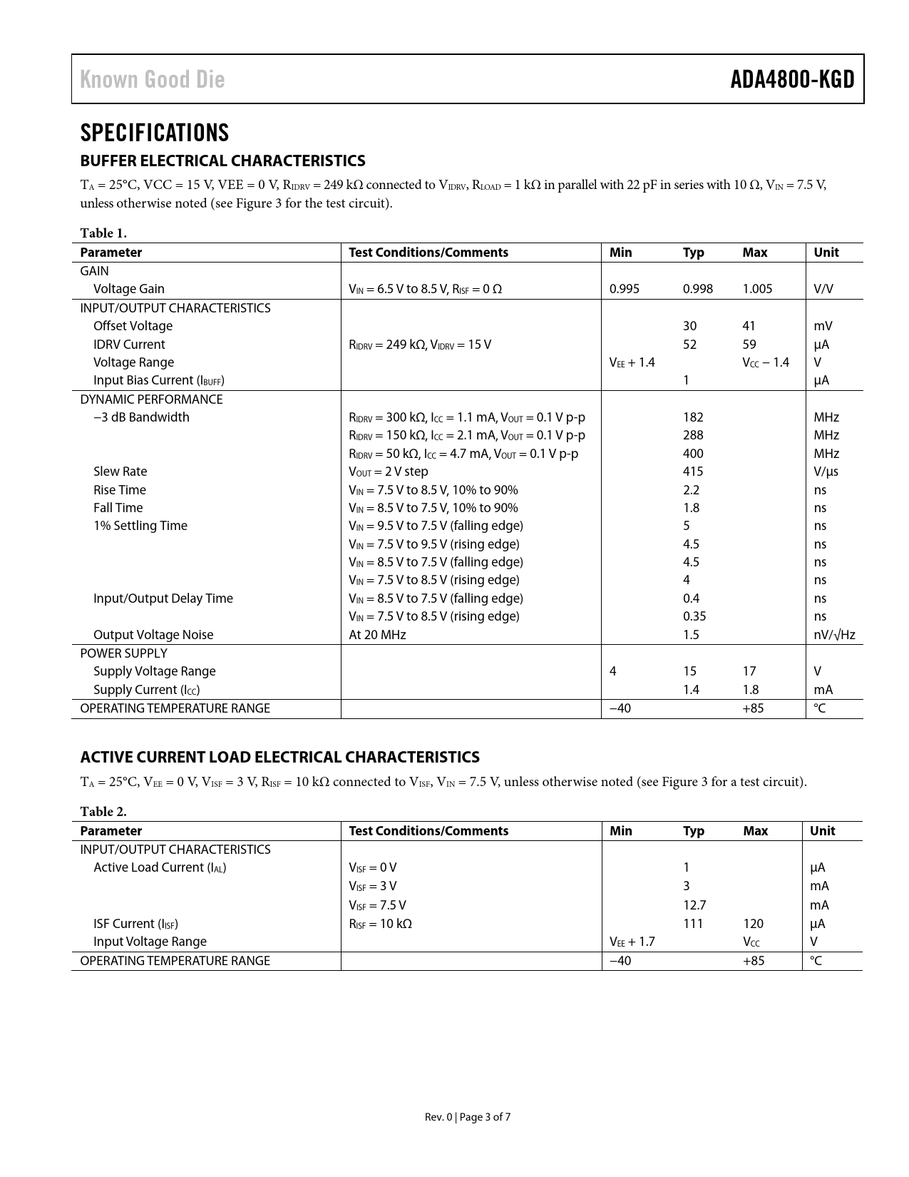 Pages / Page7 / 3 — Known Good Die. ADA4800-KGD. SPECIFICATIONS BUFFER ELECTRICAL …