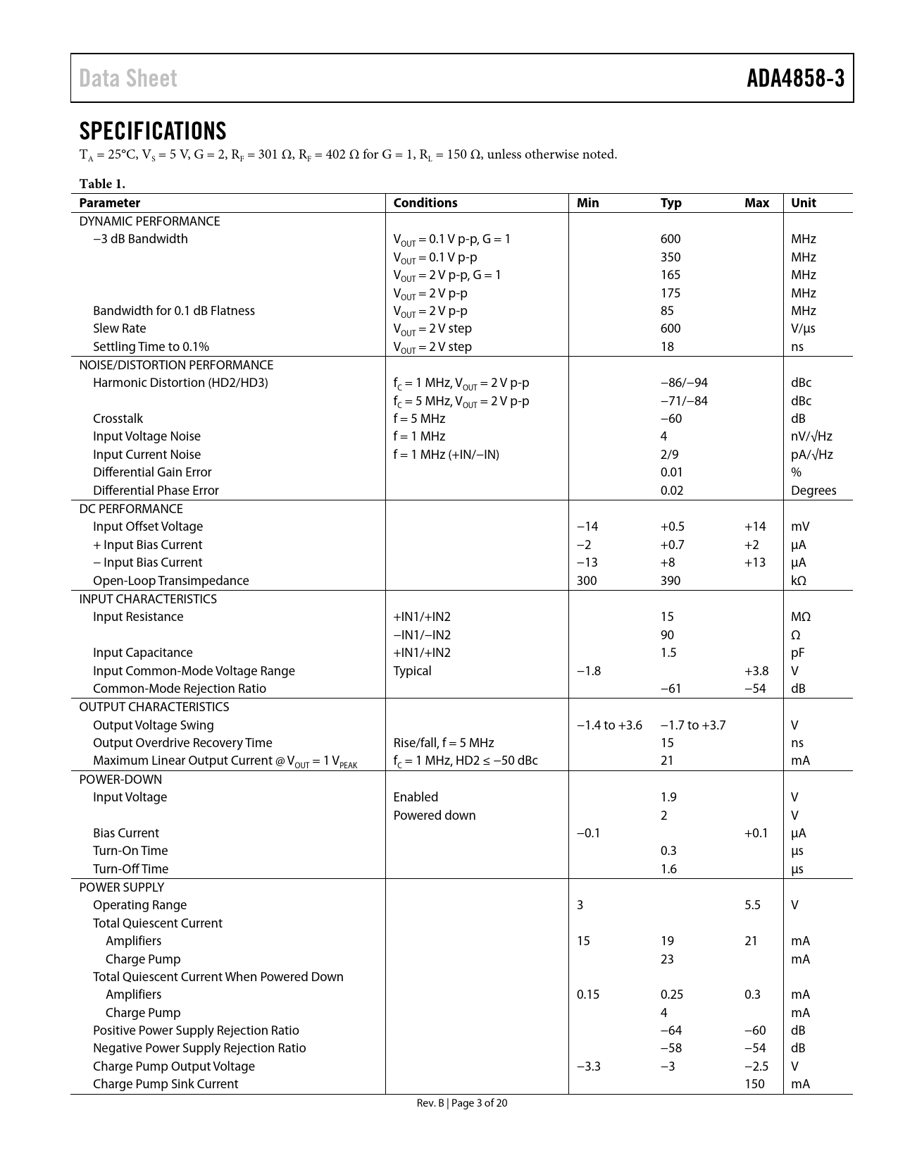 Data Sheet. ADA4858-3. SPECIFICATIONS. Table 1. Parameter. Conditions. Min. Typ. Max. Unit