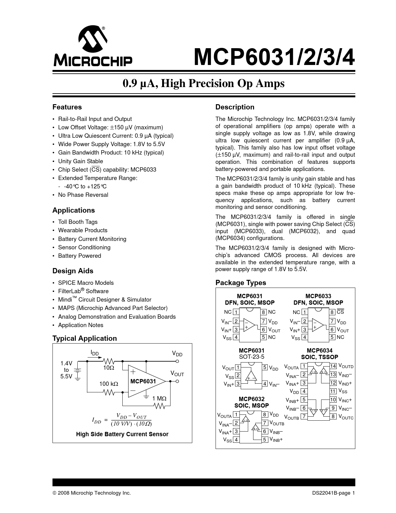 MCP6031/2/3/4. 0.9 µA, High Precision Op Amps. Features. Description. Applications. Design Aids. Package Types. MCP6031. MCP6033