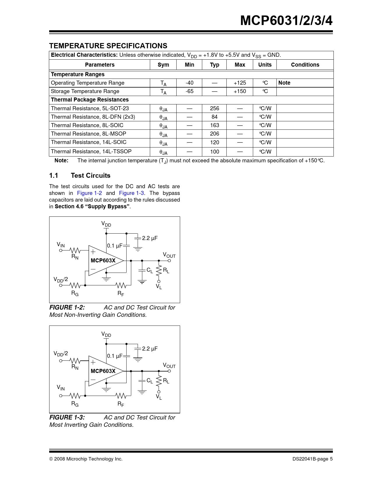 Model Line for this Datasheet Text Version of Document link to page 5 link to page 5 link to page 5 link to page 16MCP6031/2/3/4 TEMPERATURE SPECIFICATIONS Electrical Characteristics: Unless otherwise indicated, VDD = +1.8V to +5.5V and VSS = GND.Parameters Sym Min Typ Max Units Conditions Temperature Ranges Operating Temperature Range TA -40 — +125 °CNote Storage Temperature Range TA -65 — +150 °CThermal Package Resistances Thermal Resistance, 5L-SOT-23 θJA — 256 — °C/W Thermal Resistance, 8L-DFN (2x3) θJA — 84 — °C/W Thermal Resistance, 8L-SOIC θJA — 163 — °C/W Thermal Resistance, 8L-MSOP θJA — 206 — °C/W Thermal Resistance, 14L-SOIC θJA — 120 — °C/W Thermal Resistance, 14L-TSSOP θJA — 100 — °C/WNote: The internal junction temperature (TJ) must not exceed the absolute maximum specification of +150°C.1.1 Test Circuits The test circuits used for the DC and AC tests are shown in Figure 1-2 and Figure 1-3. The bypass capacitors are laid out according to the rules discussed inSection 4.6 “Supply Bypass” . VDD 2.2 µF VIN 0.1 µF R V N OUTMCP603X CL RL VDD/2 VL RG RFFIGURE 1-2: AC and DC Test Circuit for Most Non-Inverting Gain Conditions. VDD 2.2 µF VDD/2 0.1 µF R V N OUTMCP603X CL RL VIN VL RG RFFIGURE 1-3: AC and DC Test Circuit for Most Inverting Gain Conditions. © 2008 Microchip Technology Inc. DS22041B-page 5 Document Outline 1.0 Electrical Characteristics FIGURE 1-1: Timing Diagram for the CS Pin on the MCP6033. 1.1 Test Circuits FIGURE 1-2: AC and DC Test Circuit for Most Non-Inverting Gain Conditions. FIGURE 1-3: AC and DC Test Circuit for Most Inverting Gain Conditions. 2.0 Typical Performance Curves FIGURE 2-1: Input Offset Voltage with VDD = 3.0V. FIGURE 2-2: Input Offset Voltage Drift with VDD = 3.0V and TA £ +85˚C. FIGURE 2-3: Input Offset Voltage Drift with VDD = 3.0V and TA ³ +85˚C. FIGURE 2-4: Input Offset Voltage vs. Common Mode Input Voltage with VDD = 5.5V. FIGURE 2-5: Input Offset Voltage vs. Common Mode Input Voltage with VDD = 1.8V. FIGURE 2-6: Input Offset Voltage vs. Output Voltage. FIGURE 2-7: Input Noise Voltage Density vs. Frequency. FIGURE 2-8: Input Noise Voltage Density vs. Common Mode Input Voltage. FIGURE 2-9: Common Mode Rejection Ratio, Power Supply Rejection Ratio vs. Frequency. FIGURE 2-10: Common Mode Rejection Ratio, Power Supply Rejection Ratio vs. Ambient Temperature. FIGURE 2-11: Input Bias, Offset Currents vs. Ambient Temperature. FIGURE 2-12: Input Bias Current vs. Common Mode Input Voltage. FIGURE 2-13: Quiescent Current vs Ambient Temperature. FIGURE 2-14: Quiescent Current vs. Power Supply Voltage with VCM = VDD. FIGURE 2-15: Quiescent Current vs. Power Supply Voltage with VCM = VSS. FIGURE 2-16: Open-Loop Gain, Phase vs. Frequency. FIGURE 2-17: DC Open-Loop Gain vs. Power Supply Voltage. FIGURE 2-18: DC Open-Loop Gain vs. Output Voltage Headroom. FIGURE 2-19: Channel-to-Channel Separation vs. Frequency ( MCP6032/4 only). FIGURE 2-20: Gain Bandwidth Product, Phase Margin vs. Common Mode Input Voltage. FIGURE 2-21: Gain Bandwidth Product, Phase Margin vs. Ambient Temperature. FIGURE 2-22: Gain Bandwidth Product, Phase Margin vs. Ambient Temperature. FIGURE 2-23: Ouput Short Circuit Current vs. Power Supply Voltage. FIGURE 2-24: Output Voltage Swing vs. Frequency. FIGURE 2-25: Output Voltage Headroom vs. Output Current. FIGURE 2-26: Output Voltage Headroom vs. Ambient Temperature. FIGURE 2-27: Slew Rate vs. Ambient Temperature. FIGURE 2-28: Small Signal Non-Inverting Pulse Response. FIGURE 2-29: Small Signal Inverting Pulse Response. FIGURE 2-30: Large Signal Non-Inverting Pulse Response. FIGURE 2-31: Large Signal Inverting Pulse Response. FIGURE 2-32: The MCP6031/2/3/4 family shows no phase reversal . FIGURE 2-33: Chip Select (CS) to Amplifier Output Response Time (MCP6033 only). FIGURE 2-34: Chip Select (CS) Hysteresis (MCP6033 only) with VDD = 5.5V. FIGURE 2-35: Chip Select (CS) Hysteresis (MCP6033 only) with VDD = 3.0V. FIGURE 2-36: Chip Select (CS) Hysteresis (MCP6033 only) with VDD = 1.8V. FIGURE 2-37: Closed Loop Output Impedance vs. Frequency. FIGURE 2-38: Measured Input Current vs. Input Voltage (below VSS). 3.0 Pin Descriptions TABLE 3-1: Pin Function Table 3.1 Analog Outputs 3.2 Analog Inputs 3.3 Chip Select Digital Input 3.4 Power Supply Pins 4.0 Application Information 4.1 Rail-to-Rail Input FIGURE 4-1: Simplified Analog Input ESD Structures. FIGURE 4-2: Protecting the Analog Inputs. 4.2 Rail-to-Rail Output 4.3 Output Loads and Battery Life 4.4 Capacitive Loads FIGURE 4-3: Output resistor, RISO stabilizes large capacitive loads. FIGURE 4-4: Recommended RISO values for Capacitive Loads. 4.5 MCP6033 Chip Select 4.6 Supply Bypass 4.7 Unused Op Amps FIGURE 4-5: Unused Op Amps. 4.8 PCB Surface Leakage FIGURE 4-6: Example Guard Ring Layout for Inverting Gain. 4.9 Application Circuits FIGURE 4-7: High Side Battery Current Sensor. FIGURE 4-8: Precision, Non-inverting Comparator. FIGURE 4-9: Driving the MCP3421 using an R-C Snubber. 5.0 Design Aids 5.1 SPICE Macro Model 5.2 FilterLab® Software 5.3 Mindi™ Circuit Designer & Simulator 5.4 MAPS (Microchip Advanced Part Selector) 5.5 Analog Demonstration and Evaluation Boards 5.6 Application Notes 6.0 Packaging Information 6.1 Package Marking Information
