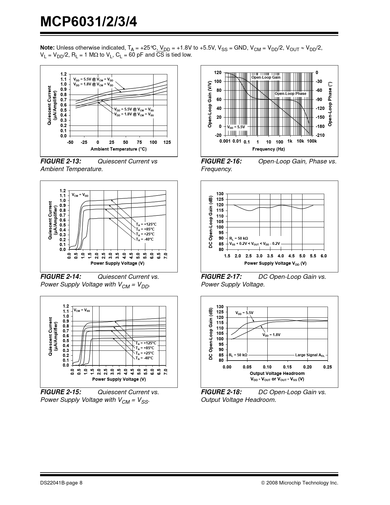 MCP6031/2/3/4. Note:. 1.2. 120. 1.1. Open-Loop Gain. DD = 5.5V @ VCM = VDD. ) 100. -30. 1.0. DD = 1.8V @ VCM = VDD. 0.9. -60. 0.8. Open-Loop Phase