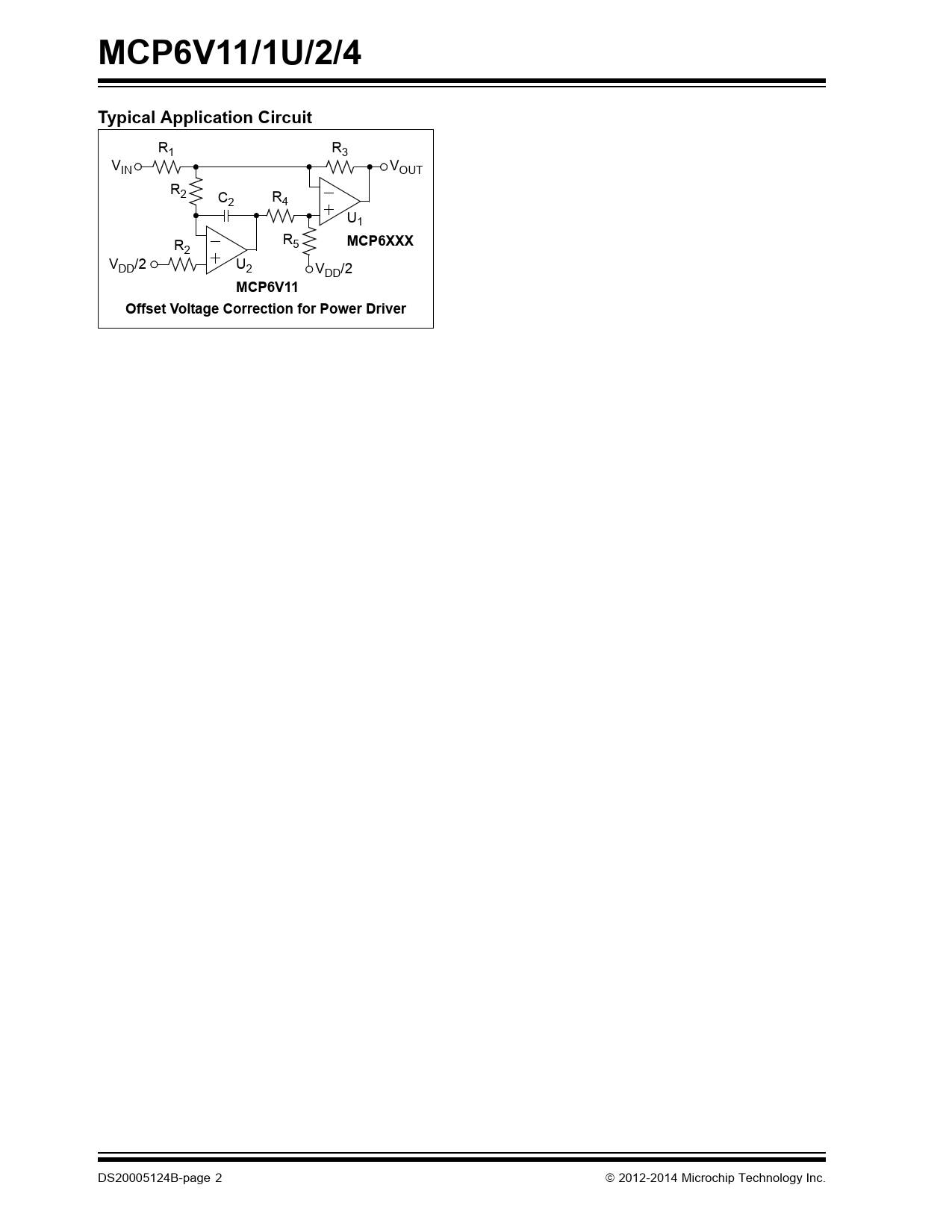 DS20005124B-page 2  2012-2014 Microchip Technology Inc. Document Outline 1.0 Electrical Characteristics 1.1 Absolute Maximum Ratings † 1.2 Specifications TABLE 1-1: DC Electrical Specifications TABLE 1-2: AC Electrical Specifications TABLE 1-3: Temperature Specifications 1.3 Timing Diagrams FIGURE 1-1: Amplifier Start Up. FIGURE 1-2: Offset Correction Settling Time. FIGURE 1-3: Output Overdrive Recovery. 1.4 Test Circuits FIGURE 1-4: AC and DC Test Circuit for Most Non-Inverting Gain Conditions. FIGURE 1-5: AC and DC Test Circuit for Most Inverting Gain Conditions. FIGURE 1-6: Test Circuit for Dynamic Input Behavior. 2.0 Typical Performance Curves 2.1 DC Input Precision FIGURE 2-1: Input Offset Voltage. FIGURE 2-2: Input Offset Voltage Drift. FIGURE 2-3: Input Offset Voltage Quadratic Temp. Co. FIGURE 2-4: Input Offset Voltage vs. Power Supply Voltage with VCM = VCML. FIGURE 2-5: Input Offset Voltage vs. Power Supply Voltage with VCM = VCMH. FIGURE 2-6: Input Offset Voltage vs. Output Voltage. FIGURE 2-7: Input Offset Voltage vs. Common Mode Voltage with VDD = 1.6V. FIGURE 2-8: Input Offset Voltage vs. Common Mode Voltage with VDD = 5.5V. FIGURE 2-9: CMRR. FIGURE 2-10: PSRR. FIGURE 2-11: DC Open-Loop Gain. FIGURE 2-12: CMRR and PSRR vs. Ambient Temperature. FIGURE 2-13: DC Open-Loop Gain vs. Ambient Temperature. FIGURE 2-14: Input Bias and Offset Currents vs. Common Mode Input Voltage with TA = +85°C. FIGURE 2-15: Input Bias and Offset Currents vs. Common Mode Input Voltage with TA = +125°C. FIGURE 2-16: Input Bias and Offset Currents vs. Ambient Temperature with VDD = +5.5V. FIGURE 2-17: Input Bias Current vs. Input Voltage (below VSS). 2.2 Other DC Voltages and Currents FIGURE 2-18: Input Common Mode Voltage Headroom (Range) vs. Ambient Temperature. FIGURE 2-19: Output Voltage Headroom vs. Output Current. FIGURE 2-20: Output Voltage Headroom vs. Ambient Temperature. FIGURE 2-21: Output Short Circuit Current vs. Power Supply Voltage. FIGURE 2-22: Supply Current vs. Power Supply Voltage. FIGURE 2-23: Power-on Reset Trip Voltage. FIGURE 2-24: Power-on Reset Voltage vs. Ambient Temperature. 2.3 Frequency Response FIGURE 2-25: CMRR and PSRR vs. Frequency. FIGURE 2-26: Open-Loop Gain vs. Frequency with VDD = 1.6V. FIGURE 2-27: Open-Loop Gain vs. Frequency with VDD = 5.5V. FIGURE 2-28: Gain Bandwidth Product and Phase Margin vs. Ambient Temperature. FIGURE 2-29: Gain Bandwidth Product and Phase Margin vs. Common Mode Input Voltage. FIGURE 2-30: Gain Bandwidth Product and Phase Margin vs. Output Voltage. FIGURE 2-31: Closed-Loop Output Impedance vs. Frequency with VDD = 1.6V. FIGURE 2-32: Closed-Loop Output Impedance vs. Frequency with VDD = 5.5V. FIGURE 2-33: Channel-to-Channel Separation vs. Frequency. FIGURE 2-34: Maximum Output Voltage Swing vs. Frequency. 2.4 Input Noise and Distortion FIGURE 2-35: Input Noise Voltage Density and Integrated Input Noise Voltage vs. Frequency. FIGURE 2-36: Input Noise Voltage Density vs. Input Common Mode Voltage. FIGURE 2-37: Inter-Modulation Distortion vs. Frequency with VCM Disturbance (see Figure 1-6). FIGURE 2-38: Inter-Modulation Distortion vs. Frequency with VDD Disturbance (see Figure 1-6). FIGURE 2-39: Input Noise vs. Time with 1 Hz and 10 Hz Filters and VDD =1.6V. FIGURE 2-40: Input Noise vs. Time with 1 Hz and 10 Hz Filters and VDD =5.5V. 2.5 Time Response FIGURE 2-41: Input Offset Voltage vs. Time with Temperature Change. FIGURE 2-42: Input Offset Voltage vs. Time at Power Up. FIGURE 2-43: The MCP6V11/1U/2/4 Family Shows No Input Phase Reversal with Overdrive. FIGURE 2-44: Non-inverting Small Signal Step Response. FIGURE 2-45: Non-inverting Large Signal Step Response. FIGURE 2-46: Inverting Small Signal Step Response. FIGURE 2-47: Inverting Large Signal Step Response. FIGURE 2-48: Slew Rate vs. Ambient Temperature. FIGURE 2-49: Output Overdrive Recovery vs. Time with G = -10 V/V. FIGURE 2-50: Output Overdrive Recovery Time vs. Inverting Gain. 3.0 Pin Descriptions TABLE 3-1: Pin Function Table 3.1 Analog Outputs 3.2 Analog Inputs 3.3 Power Supply Pins 3.4 Exposed Thermal Pad (EP) 4.0 Applications 4.1 Overview of Zero-Drift Operation FIGURE 4-1: Simplified Zero-Drift Op Amp Functional Diagram. FIGURE 4-2: First Chopping Clock Phase; Equivalent Amplifier Diagram. FIGURE 4-3: Second Chopping Clock Phase; Equivalent Amplifier Diagram. 4.2 Other Functional Blocks FIGURE 4-4: Simplified Analog Input ESD Structures. FIGURE 4-5: Protecting the Analog Inputs Against High Voltages. FIGURE 4-6: Protecting the Analog Inputs Against High Currents. 4.3 Application Tips FIGURE 4-7: Output Resistor, RISO, Stabilizes Capacitive Loads. FIGURE 4-8: Recommended RISO Values for Capacitive Loads. FIGURE 4-9: Output Load. FIGURE 4-10: Amplifier with Parasitic Capacitance. 4.4 Typical Applications FIGURE 4-11: Simple Design. FIGURE 4-12: RTD Sensor. FIGURE 4-13: Offset Correction. FIGURE 4-14: Precision Comparator. 5.0 Design Aids 5.1 SPICE Macro Model 5.2 FilterLab® Software 5.3 Microchip Advanced Part Selector (MAPS) 5.4 Analog Demonstration and Evaluation Boards 5.5 Application Notes 6.0 Packaging Information 6.1 Package Marking Information Appendix A: Revision History Product ID System Trademarks Worldwide Sales and Service