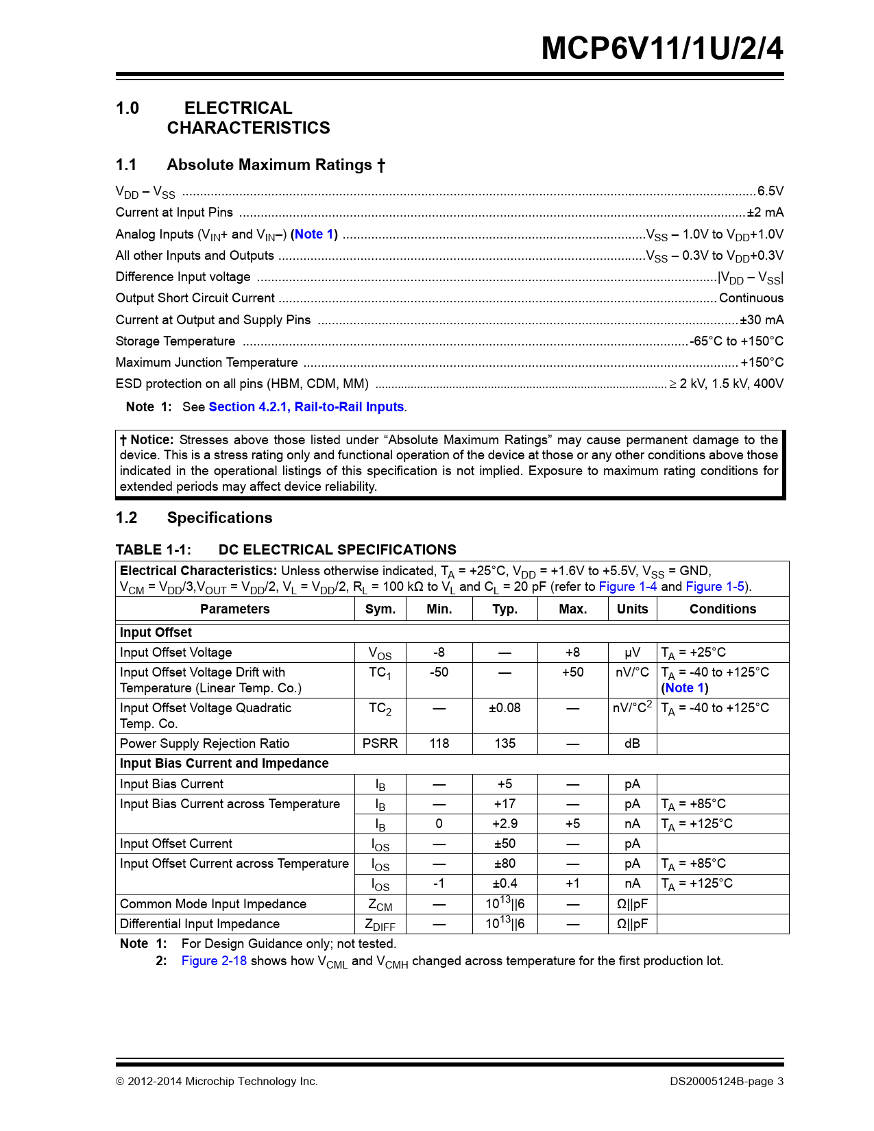 link to page 6 link to page 6 link to page 3 link to page 10 link to page 20 link to page 3 MCP6V11/1U/2/41.0ELECTRICALCHARACTERISTICS1.1Absolute Maximum Ratings † VDD – VSS ...6.5V Current at Input Pins ..±2 mA Analog Inputs (VIN+ and VIN–) (Note 1) ...VSS – 1.0V to VDD+1.0V All other Inputs and Outputs ...VSS – 0.3V to VDD+0.3V Difference Input voltage ...|VDD – VSS| Output Short Circuit Current ... Continuous Current at Output and Supply Pins ..±30 mA Storage Temperature ...-65°C to +150°C Maximum Junction Temperature .. +150°C ESD protection on all pins (HBM, CDM, MM) 2 kV, 1.5 kV, 400V Note 1: See Section 4.2.1, Rail-to-Rail Inputs . † Notice: Stresses above those listed under “Absolute Maximum Ratings” may cause permanent damage to the device. This is a stress rating only and functional operation of the device at those or any other conditions above those indicated in the operational listings of this specification is not implied. Exposure to maximum rating conditions for extended periods may affect device reliability. 1.2SpecificationsTABLE 1-1:DC ELECTRICAL SPECIFICATIONSElectrical Characteristics: Unless otherwise indicated, TA = +25°C, VDD = +1.6V to +5.5V, VSS = GND, VCM = VDD/3,VOUT = VDD/2, VL = VDD/2, RL = 100 kΩ to VL and CL = 20 pF (refer to Figure 1-4 and Figure 1-5). ParametersSym.Min.Typ.Max.UnitsConditionsInput Offset Input Offset Voltage VOS -8 — +8 µV TA = +25°C Input Offset Voltage Drift with TC1 -50 — +50 nV/°C TA = -40 to +125°C Temperature (Linear Temp. Co.) (Note 1) Input Offset Voltage Quadratic TC2 — ±0.08 — nV/°C2 TA = -40 to +125°C Temp. Co. Power Supply Rejection Ratio PSRR 118 135 — dB Input Bias Current and Impedance Input Bias Current IB — +5 — pA Input Bias Current across Temperature IB — +17 — pA TA = +85°C IB 0 +2.9 +5 nA TA = +125°C Input Offset Current IOS — ±50 — pA Input Offset Current across Temperature IOS — ±80 — pA TA = +85°C IOS -1 ±0.4 +1 nA TA = +125°C Common Mode Input Impedance ZCM — 1013||6 — Ω||pF Differential Input Impedance ZDIFF — 1013||6 — Ω||pF Note 1: For Design Guidance only; not tested. 2: Figure 2-18 shows how VCML and VCMH changed across temperature for the first production lot. 2012-2014 Microchip Technology Inc. DS20005124B-page 3 Document Outline 1.0 Electrical Characteristics 1.1 Absolute Maximum Ratings † 1.2 Specifications TABLE 1-1: DC Electrical Specifications TABLE 1-2: AC Electrical Specifications TABLE 1-3: Temperature Specifications 1.3 Timing Diagrams FIGURE 1-1: Amplifier Start Up. FIGURE 1-2: Offset Correction Settling Time. FIGURE 1-3: Output Overdrive Recovery. 1.4 Test Circuits FIGURE 1-4: AC and DC Test Circuit for Most Non-Inverting Gain Conditions. FIGURE 1-5: AC and DC Test Circuit for Most Inverting Gain Conditions. FIGURE 1-6: Test Circuit for Dynamic Input Behavior. 2.0 Typical Performance Curves 2.1 DC Input Precision FIGURE 2-1: Input Offset Voltage. FIGURE 2-2: Input Offset Voltage Drift. FIGURE 2-3: Input Offset Voltage Quadratic Temp. Co. FIGURE 2-4: Input Offset Voltage vs. Power Supply Voltage with VCM = VCML. FIGURE 2-5: Input Offset Voltage vs. Power Supply Voltage with VCM = VCMH. FIGURE 2-6: Input Offset Voltage vs. Output Voltage. FIGURE 2-7: Input Offset Voltage vs. Common Mode Voltage with VDD = 1.6V. FIGURE 2-8: Input Offset Voltage vs. Common Mode Voltage with VDD = 5.5V. FIGURE 2-9: CMRR. FIGURE 2-10: PSRR. FIGURE 2-11: DC Open-Loop Gain. FIGURE 2-12: CMRR and PSRR vs. Ambient Temperature. FIGURE 2-13: DC Open-Loop Gain vs. Ambient Temperature. FIGURE 2-14: Input Bias and Offset Currents vs. Common Mode Input Voltage with TA = +85°C. FIGURE 2-15: Input Bias and Offset Currents vs. Common Mode Input Voltage with TA = +125°C. FIGURE 2-16: Input Bias and Offset Currents vs. Ambient Temperature with VDD = +5.5V. FIGURE 2-17: Input Bias Current vs. Input Voltage (below VSS). 2.2 Other DC Voltages and Currents FIGURE 2-18: Input Common Mode Voltage Headroom (Range) vs. Ambient Temperature. FIGURE 2-19: Output Voltage Headroom vs. Output Current. FIGURE 2-20: Output Voltage Headroom vs. Ambient Temperature. FIGURE 2-21: Output Short Circuit Current vs. Power Supply Voltage. FIGURE 2-22: Supply Current vs. Power Supply Voltage. FIGURE 2-23: Power-on Reset Trip Voltage. FIGURE 2-24: Power-on Reset Voltage vs. Ambient Temperature. 2.3 Frequency Response FIGURE 2-25: CMRR and PSRR vs. Frequency. FIGURE 2-26: Open-Loop Gain vs. Frequency with VDD = 1.6V. FIGURE 2-27: Open-Loop Gain vs. Frequency with VDD = 5.5V. FIGURE 2-28: Gain Bandwidth Product and Phase Margin vs. Ambient Temperature. FIGURE 2-29: Gain Bandwidth Product and Phase Margin vs. Common Mode Input Voltage. FIGURE 2-30: Gain Bandwidth Product and Phase Margin vs. Output Voltage. FIGURE 2-31: Closed-Loop Output Impedance vs. Frequency with VDD = 1.6V. FIGURE 2-32: Closed-Loop Output Impedance vs. Frequency with VDD = 5.5V. FIGURE 2-33: Channel-to-Channel Separation vs. Frequency. FIGURE 2-34: Maximum Output Voltage Swing vs. Frequency. 2.4 Input Noise and Distortion FIGURE 2-35: Input Noise Voltage Density and Integrated Input Noise Voltage vs. Frequency. FIGURE 2-36: Input Noise Voltage Density vs. Input Common Mode Voltage. FIGURE 2-37: Inter-Modulation Distortion vs. Frequency with VCM Disturbance (see Figure 1-6). FIGURE 2-38: Inter-Modulation Distortion vs. Frequency with VDD Disturbance (see Figure 1-6). FIGURE 2-39: Input Noise vs. Time with 1 Hz and 10 Hz Filters and VDD =1.6V. FIGURE 2-40: Input Noise vs. Time with 1 Hz and 10 Hz Filters and VDD =5.5V. 2.5 Time Response FIGURE 2-41: Input Offset Voltage vs. Time with Temperature Change. FIGURE 2-42: Input Offset Voltage vs. Time at Power Up. FIGURE 2-43: The MCP6V11/1U/2/4 Family Shows No Input Phase Reversal with Overdrive. FIGURE 2-44: Non-inverting Small Signal Step Response. FIGURE 2-45: Non-inverting Large Signal Step Response. FIGURE 2-46: Inverting Small Signal Step Response. FIGURE 2-47: Inv