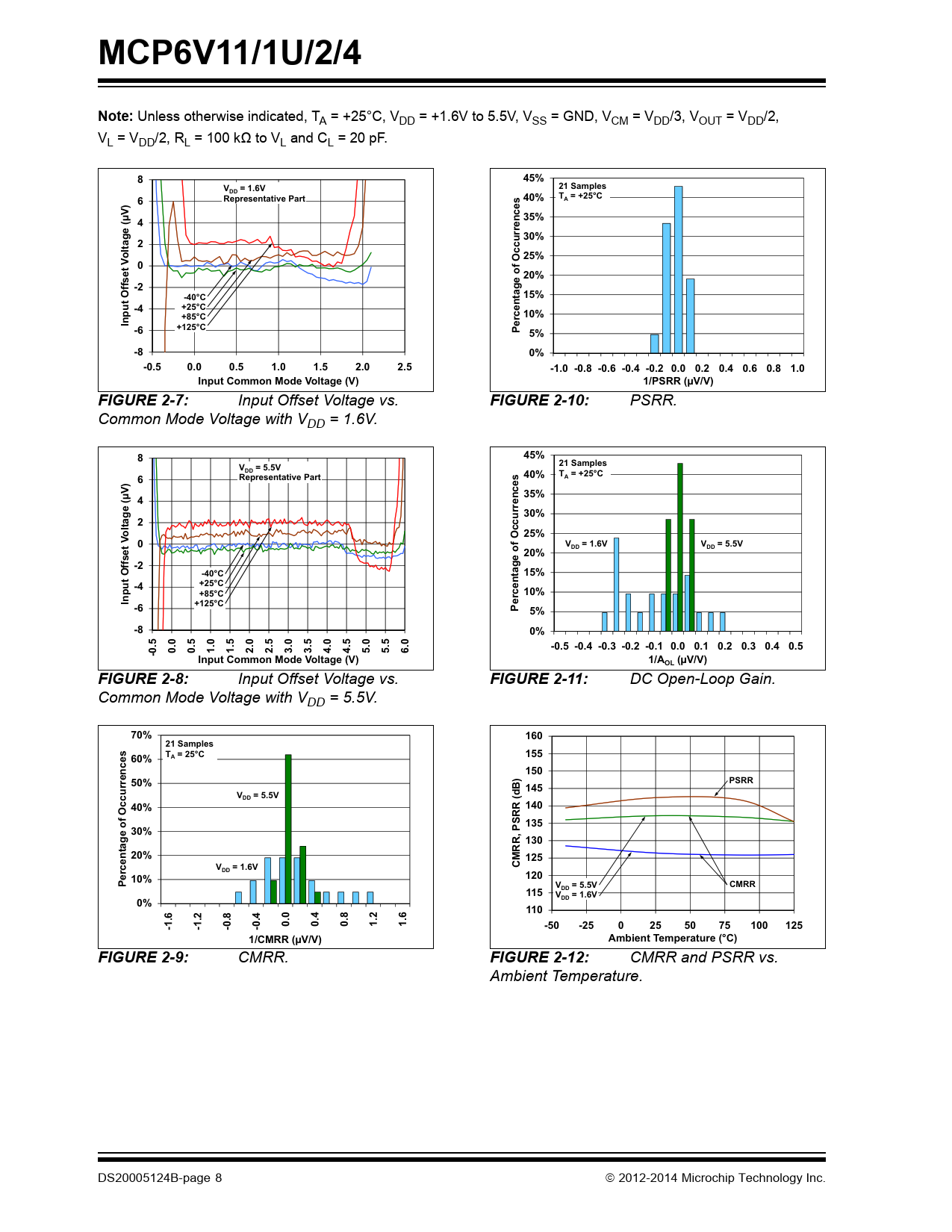 MCP6V11/1U/2/4Note: Unless otherwise indicated, TA = +25°C, VDD = +1.6V to 5.5V, VSS = GND, VCM = VDD/3, VOUT = VDD/2, VL = VDD/2, RL = 100 kΩ to VL and CL = 20 pF. 845%V= 1.6V21 SamplesDDT = +25°C6Representative Part640%sAs35%(µV) 4errence 30%2oltag25%VOccu020%ffset -2ge ofOa-40°C°15%-4+25°C +85°C10%rcentInpute+125°C-6+125°P 5%-80%-0.50.00.51.01.52.02.5-1.0 -0.8 -0.6 -0.4 -0.2 0.0 0.2 0.4 0.6 0.8 1.0Input Common Mode Voltage (V)1/PSRR (µV/V)FIGURE 2-7: Input Offset Voltage vs. FIGURE 2-10: PSRR. Common Mode Voltage with VDD = 1.6V. 845%21 SamplesV= 5.5VDD40%T = +25°C6Representative Part6sAs35%(µV) 4errence 30%2oltag25%VOccu0V= 1.6V6VV= 5.5V5VDDDD20%ffset -2ge ofOa-40°C15%-4+25°C +85°C10%rcentInput+125°Ce-6+125 CP5%-80%-0.5 -0.4 -0.3 -0.2 -0.1 0.0 0.1 0.2 0.3 0.4 0.5-0.50.00.51.01.52.02.53.03.54.04.55.05.56.0Input Common Mode Voltage (V)1/A(µV/V)OLFIGURE 2-8: Input Offset Voltage vs. FIGURE 2-11: DC Open-Loop Gain. Common Mode Voltage with VDD = 5.5V. 70%16021 Samples T = 25°C15560%A15050%PSRRB) 145V= 5.5VDD40%140RR (d S 13530%130tage of OccurrencesRR, P20%125V= 1.6VCMDD10%120PercenV= 5.5V5VCMRRDD115V= 1.6VDD0%110-1.6-1.2-0.8-0.40.00.40.81.21.6-50-2502550751001251/CMRR (µV/V)Ambient Temperature (°C)FIGURE 2-9: CMRR. FIGURE 2-12: CMRR and PSRR vs. Ambient Temperature. DS20005124B-page 8 2012-2014 Microchip Technology Inc. Document Outline 1.0 Electrical Characteristics 1.1 Absolute Maximum Ratings † 1.2 Specifications TABLE 1-1: DC Electrical Specifications TABLE 1-2: AC Electrical Specifications TABLE 1-3: Temperature Specifications 1.3 Timing Diagrams FIGURE 1-1: Amplifier Start Up. FIGURE 1-2: Offset Correction Settling Time. FIGURE 1-3: Output Overdrive Recovery. 1.4 Test Circuits FIGURE 1-4: AC and DC Test Circuit for Most Non-Inverting Gain Conditions. FIGURE 1-5: AC and DC Test Circuit for Most Inverting Gain Conditions. FIGURE 1-6: Test Circuit for Dynamic Input Behavior. 2.0 Typical Performance Curves 2.1 DC Input Precision FIGURE 2-1: Input Offset Voltage. FIGURE 2-2: Input Offset Voltage Drift. FIGURE 2-3: Input Offset Voltage Quadratic Temp. Co. FIGURE 2-4: Input Offset Voltage vs. Power Supply Voltage with VCM = VCML. FIGURE 2-5: Input Offset Voltage vs. Power Supply Voltage with VCM = VCMH. FIGURE 2-6: Input Offset Voltage vs. Output Voltage. FIGURE 2-7: Input Offset Voltage vs. Common Mode Voltage with VDD = 1.6V. FIGURE 2-8: Input Offset Voltage vs. Common Mode Voltage with VDD = 5.5V. FIGURE 2-9: CMRR. FIGURE 2-10: PSRR. FIGURE 2-11: DC Open-Loop Gain. FIGURE 2-12: CMRR and PSRR vs. Ambient Temperature. FIGURE 2-13: DC Open-Loop Gain vs. Ambient Temperature. FIGURE 2-14: Input Bias and Offset Currents vs. Common Mode Input Voltage with TA = +85°C. FIGURE 2-15: Input Bias and Offset Currents vs. Common Mode Input Voltage with TA = +125°C. FIGURE 2-16: Input Bias and Offset Currents vs. Ambient Temperature with VDD = +5.5V. FIGURE 2-17: Input Bias Current vs. Input Voltage (below VSS). 2.2 Other DC Voltages and Currents FIGURE 2-18: Input Common Mode Voltage Headroom (Range) vs. Ambient Temperature. FIGURE 2-19: Output Voltage Headroom vs. Output Current. FIGURE 2-20: Output Voltage Headroom vs. Ambient Temperature. FIGURE 2-21: Output Short Circuit Current vs. Power Supply Voltage. FIGURE 2-22: Supply Current vs. Power Supply Voltage. FIGURE 2-23: Power-on Reset Trip Voltage. FIGURE 2-24: Power-on Reset Voltage vs. Ambient Temperature. 2.3 Frequency Response FIGURE 2-25: CMRR and PSRR vs. Frequency. FIGURE 2-26: Open-Loop Gain vs. Frequency with VDD = 1.6V. FIGURE 2-27: Open-Loop Gain vs. Frequency with VDD = 5.5V. FIGURE 2-28: Gain Bandwidth Product and Phase Margin vs. Ambient Temperature. FIGURE 2-29: Gain Bandwidth Product and Phase Margin vs. Common Mode Input Voltage. FIGURE 2-30: Gain Bandwidth Product and Phase Margin vs. Output Voltage. FIGURE 2-31: Closed-Loop Output Impedance vs. Frequency with VDD = 1.6V. FIGURE 2-32: Closed-Loop Output Impedance vs. Frequency with VDD = 5.5V. FIGURE 2-33: Channel-to-Channel Separation vs. Frequency. FIGURE 2-34: Maximum Output Voltage Swing vs. Frequency. 2.4 Input Noise and Distortion FIGURE 2-35: Input Noise Voltage Density and Integrated Input Noise Voltage vs. Frequency. FIGURE 2-36: Input Noise Voltage Density vs. Input Common Mode Voltage. FIGURE 2-37: Inter-Modulation Distortion vs. Frequency with VCM Disturbance (see Figure 1-6). FIGURE 2-38: Inter-Modulation Distortion vs. Frequency with VDD Disturbance (see Figure 1-6). FIGURE 2-39: Input Noise vs. Time with 1 Hz and 10 Hz Filters and VDD =1.6V. FIGURE 2-40: Input Noise vs. Time with 1 Hz and 10 Hz Filters and VDD =5.5V. 2.5 Time Response FIGURE 2-41: Input Offset Voltage vs. Time with Temperature Change. FIGURE 2-42: Input Offset Voltage vs. Time at Power Up. FIGURE 2-43: The MCP6V11/1U/2/4 Family Shows No Input Phase Reversal with Overdrive. FIGURE 2-44: Non-inverting Small Signal Step Response. FIGURE 2-45: Non-inverting Large Signal Step Response. FIGURE 2-46: Inverting Small Signal Step Response. FIGURE 2-47: Inverting Large Signal Step Response. FIGURE 2-48: Slew Rate vs. Ambient Temperature. FIGURE 2-49: Output Overdrive Recovery vs. Time with G = -10 V/V. FIGURE 2-50: Output Overdrive Recovery Time vs. Inverting Gain. 3.0 Pin Descriptions TABLE 3-1: Pin Function Table 3.1 Analog Outputs 3.2 Analog Inputs 3.3 Power Supply Pins 3.4 Exposed Thermal Pad (EP) 4.0 Applications 4.1 Overview of Zero-Drift Operation FIGURE 4-1: Simplified Zero-Drift Op Amp Functional Diagram. FIGURE 4-2: First Chopping Clock Phase; Equivalent Amplifier Diagram. FIGURE 4-3: Second Chopping Clock Phase; Equivalent Amplifier Diagram. 4.2 Other Functional Blocks FIGURE 4-4: Simplified Analog Input ESD Structures. FIGURE 4-5: Protecting the Analog Inputs Against High Voltages. FIGURE 4-6: Protecting the Analog Inputs Against High Currents. 4.3 Application Tips FIGURE 4-7: Output Resistor, RISO, Stabilizes Capacitive Loads. FIGURE 4-8: Recommended RISO Values for Ca