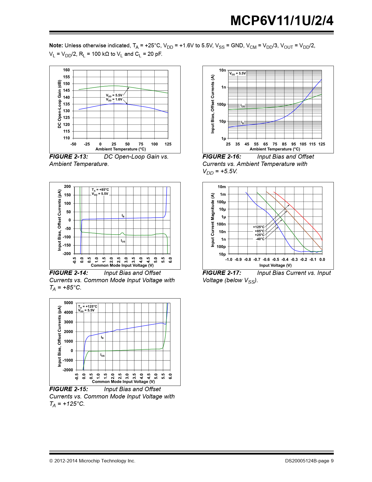 MCP6V11/1U/2/4Note: Unless otherwise indicated, TA = +25°C, VDD = +1.6V to 5.5V, VSS = GND, VCM = VDD/3, VOUT = VDD/2, VL = VDD/2, RL = 100 kΩ to VL and CL = 20 pF. 1601000010n)V= 5.5VDD155A150(dB)10001nn 145rents (V= 5.5V140DDp GaiV= 1.6VDDt Curoe135100100pIOS130n-Lo e, Offs s1251010pC OpI120BDut Bia115Inp11011p-50-2502550751001252535455565758595 105 115 125Ambient Temperature (°C)Ambient Temperature (°C)FIGURE 2-13: DC Open-Loop Gain vs. FIGURE 2-16: Input Bias and Offset Ambient Temperature. Currents vs. Ambient Temperature with VDD = +5.5V. 2001.E-0210mT = +85°CA)A)p 150V= 5.5VDD1501.E-03A1mA1001.E-04100µents (ude (1.E-0510µ50t CurrIB1.E-06agnit1µe0M1.E-07100n-50+125°C, Offsrrents1u E. -08-+85°C10n+25°C-1001.E-091n-40°Ct BiaIuOSuput C-1501.E-10In 100pInp-2001.E-1110p-1.0 -0.9 -0.8 -0.7 -0.6 -0.5 -0.4 -0.3 -0.2 -0.1 0.0-0.50.00.51.01.52.02.53.03.54.04.55.05.56.0Common Mode Input Voltage (V)Input Voltage (V)FIGURE 2-14: Input Bias and Offset FIGURE 2-17: Input Bias Current vs. Input Currents vs. Common Mode Input Voltage with Voltage (below VSS). TA = +85°C. 5000T = +125°CA)ApV= 5.5VpV4000DD4000ents ( 30002000t Curr eIB1000, Offs s0It BiaOSu 1000-Inp-2000-0.50.00.51.01.52.02.53.03.54.04.55.05.56.0Common Mode Input Voltage (V)FIGURE 2-15: Input Bias and Offset Currents vs. Common Mode Input Voltage with TA = +125°C. 2012-2014 Microchip Technology Inc. DS20005124B-page 9 Document Outline 1.0 Electrical Characteristics 1.1 Absolute Maximum Ratings † 1.2 Specifications TABLE 1-1: DC Electrical Specifications TABLE 1-2: AC Electrical Specifications TABLE 1-3: Temperature Specifications 1.3 Timing Diagrams FIGURE 1-1: Amplifier Start Up. FIGURE 1-2: Offset Correction Settling Time. FIGURE 1-3: Output Overdrive Recovery. 1.4 Test Circuits FIGURE 1-4: AC and DC Test Circuit for Most Non-Inverting Gain Conditions. FIGURE 1-5: AC and DC Test Circuit for Most Inverting Gain Conditions. FIGURE 1-6: Test Circuit for Dynamic Input Behavior. 2.0 Typical Performance Curves 2.1 DC Input Precision FIGURE 2-1: Input Offset Voltage. FIGURE 2-2: Input Offset Voltage Drift. FIGURE 2-3: Input Offset Voltage Quadratic Temp. Co. FIGURE 2-4: Input Offset Voltage vs. Power Supply Voltage with VCM = VCML. FIGURE 2-5: Input Offset Voltage vs. Power Supply Voltage with VCM = VCMH. FIGURE 2-6: Input Offset Voltage vs. Output Voltage. FIGURE 2-7: Input Offset Voltage vs. Common Mode Voltage with VDD = 1.6V. FIGURE 2-8: Input Offset Voltage vs. Common Mode Voltage with VDD = 5.5V. FIGURE 2-9: CMRR. FIGURE 2-10: PSRR. FIGURE 2-11: DC Open-Loop Gain. FIGURE 2-12: CMRR and PSRR vs. Ambient Temperature. FIGURE 2-13: DC Open-Loop Gain vs. Ambient Temperature. FIGURE 2-14: Input Bias and Offset Currents vs. Common Mode Input Voltage with TA = +85°C. FIGURE 2-15: Input Bias and Offset Currents vs. Common Mode Input Voltage with TA = +125°C. FIGURE 2-16: Input Bias and Offset Currents vs. Ambient Temperature with VDD = +5.5V. FIGURE 2-17: Input Bias Current vs. Input Voltage (below VSS). 2.2 Other DC Voltages and Currents FIGURE 2-18: Input Common Mode Voltage Headroom (Range) vs. Ambient Temperature. FIGURE 2-19: Output Voltage Headroom vs. Output Current. FIGURE 2-20: Output Voltage Headroom vs. Ambient Temperature. FIGURE 2-21: Output Short Circuit Current vs. Power Supply Voltage. FIGURE 2-22: Supply Current vs. Power Supply Voltage. FIGURE 2-23: Power-on Reset Trip Voltage. FIGURE 2-24: Power-on Reset Voltage vs. Ambient Temperature. 2.3 Frequency Response FIGURE 2-25: CMRR and PSRR vs. Frequency. FIGURE 2-26: Open-Loop Gain vs. Frequency with VDD = 1.6V. FIGURE 2-27: Open-Loop Gain vs. Frequency with VDD = 5.5V. FIGURE 2-28: Gain Bandwidth Product and Phase Margin vs. Ambient Temperature. FIGURE 2-29: Gain Bandwidth Product and Phase Margin vs. Common Mode Input Voltage. FIGURE 2-30: Gain Bandwidth Product and Phase Margin vs. Output Voltage. FIGURE 2-31: Closed-Loop Output Impedance vs. Frequency with VDD = 1.6V. FIGURE 2-32: Closed-Loop Output Impedance vs. Frequency with VDD = 5.5V. FIGURE 2-33: Channel-to-Channel Separation vs. Frequency. FIGURE 2-34: Maximum Output Voltage Swing vs. Frequency. 2.4 Input Noise and Distortion FIGURE 2-35: Input Noise Voltage Density and Integrated Input Noise Voltage vs. Frequency. FIGURE 2-36: Input Noise Voltage Density vs. Input Common Mode Voltage. FIGURE 2-37: Inter-Modulation Distortion vs. Frequency with VCM Disturbance (see Figure 1-6). FIGURE 2-38: Inter-Modulation Distortion vs. Frequency with VDD Disturbance (see Figure 1-6). FIGURE 2-39: Input Noise vs. Time with 1 Hz and 10 Hz Filters and VDD =1.6V. FIGURE 2-40: Input Noise vs. Time with 1 Hz and 10 Hz Filters and VDD =5.5V. 2.5 Time Response FIGURE 2-41: Input Offset Voltage vs. Time with Temperature Change. FIGURE 2-42: Input Offset Voltage vs. Time at Power Up. FIGURE 2-43: The MCP6V11/1U/2/4 Family Shows No Input Phase Reversal with Overdrive. FIGURE 2-44: Non-inverting Small Signal Step Response. FIGURE 2-45: Non-inverting Large Signal Step Response. FIGURE 2-46: Inverting Small Signal Step Response. FIGURE 2-47: Inverting Large Signal Step Response. FIGURE 2-48: Slew Rate vs. Ambient Temperature. FIGURE 2-49: Output Overdrive Recovery vs. Time with G = -10 V/V. FIGURE 2-50: Output Overdrive Recovery Time vs. Inverting Gain. 3.0 Pin Descriptions TABLE 3-1: Pin Function Table 3.1 Analog Outputs 3.2 Analog Inputs 3.3 Power Supply Pins 3.4 Exposed Thermal Pad (EP) 4.0 Applications 4.1 Overview of Zero-Drift Operation FIGURE 4-1: Simplified Zero-Drift Op Amp Functional Diagram. FIGURE 4-2: First Chopping Clock Phase; Equivalent Amplifier Diagram. FIGURE 4-3: Second Chopping Clock Phase; Equivalent Amplifier Diagram. 4.2 Other Functional Blocks FIGURE 4-4: Simplified Analog Input ESD Structures. FIGURE 4-5: Protecting the Analog Inputs Against High Voltages. FIGURE 4-6: Protecting the Analog Inputs Against High Currents. 4.3 Application Tips FIGURE 4-7: Output Resistor, RISO, Stabilizes Capacitive Load