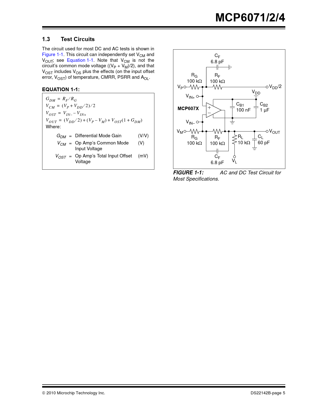 | Pages / Page | 40 / 5 — MCP6071/2/4. 1.3. Test Circuits. EQUATION 1-1:. MCP607X. FIGURE 1-1: |