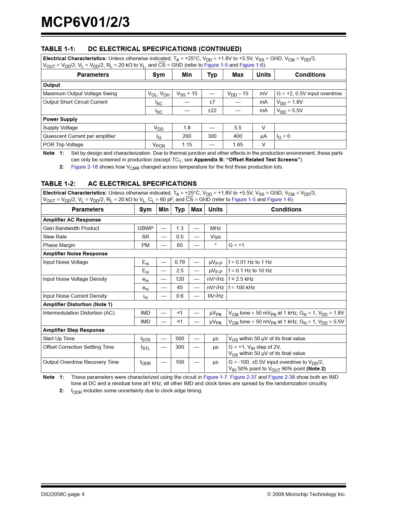 | Pages / Page | 44 / 4 — MCP6V01/2/3. TABLE 1-1:. DC ELECTRICAL SPECIFICATIONS (CONTINUED). … |