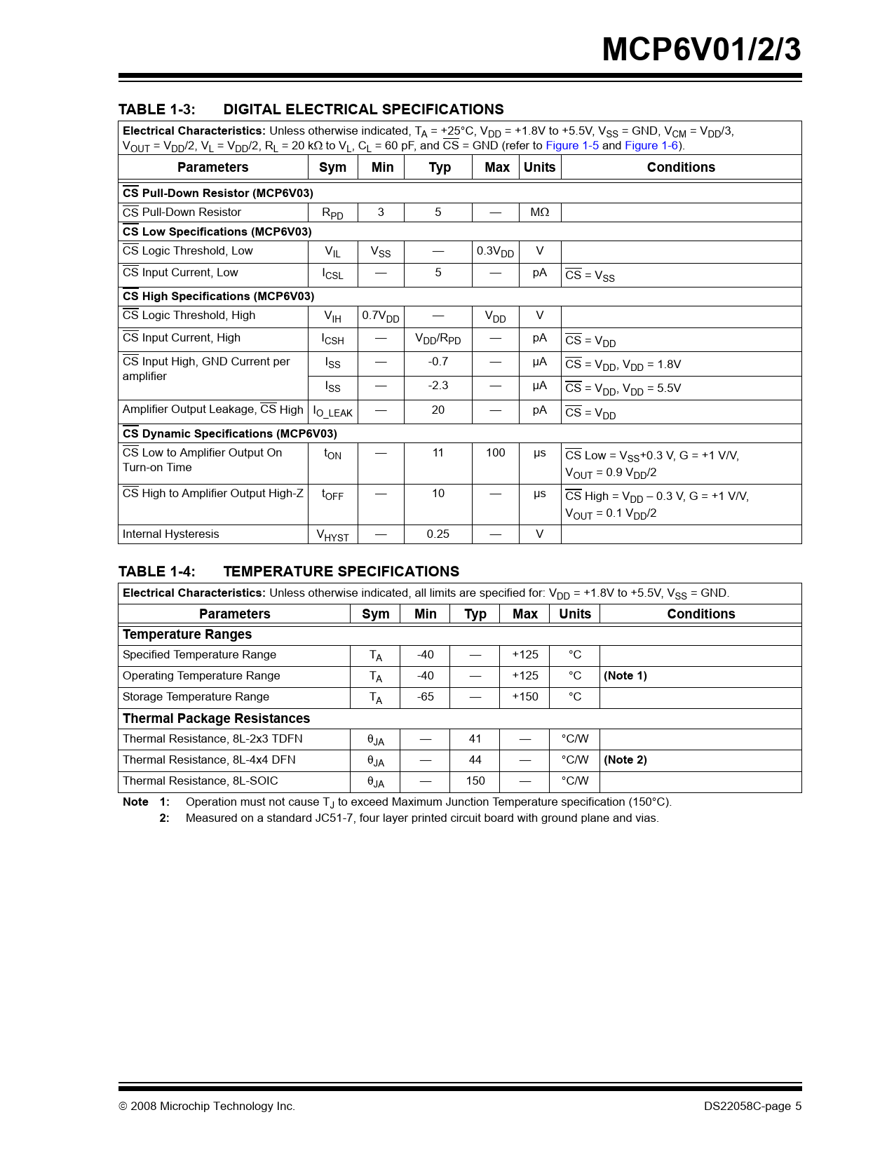 | Pages / Page | 44 / 5 — MCP6V01/2/3. TABLE 1-3:. DIGITAL ELECTRICAL SPECIFICATIONS. Electrical … |