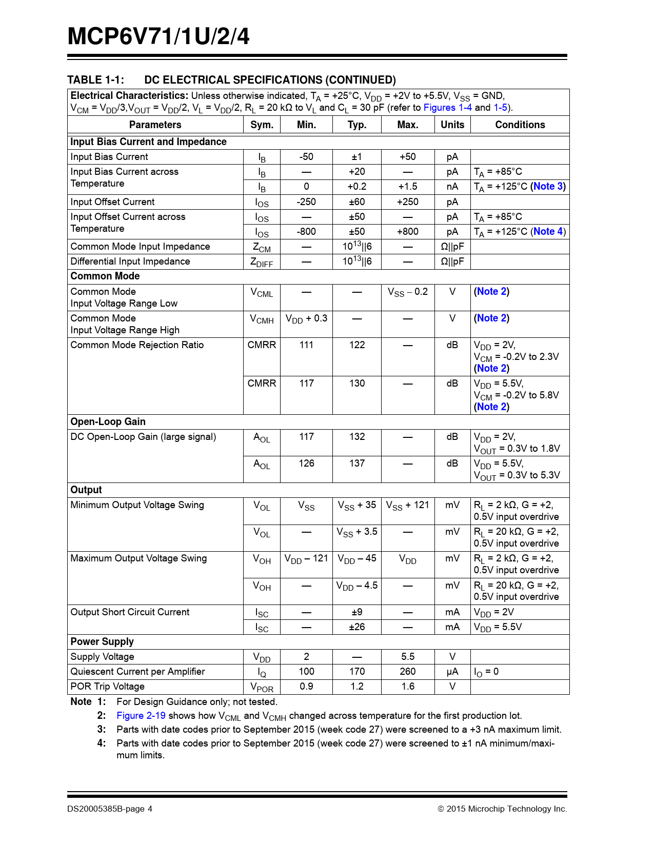 Parts with date codes prior to September 2015 (week code 27) were screened to ±1 nA minimum/maxi- mum limits. DS20005385B-page 4  2015 Microchip Technology Inc. Document Outline Features Typical Applications Design Aids Related Parts Description Package Types Typical Application Circuit 1.0 Electrical Characteristics 1.1 Absolute Maximum Ratings † 1.2 Specifications TABLE 1-1: DC Electrical Specifications (Continued) TABLE 1-2: AC Electrical Specifications TABLE 1-3: Temperature Specifications 1.3 Timing Diagrams FIGURE 1-1: Amplifier Start Up. FIGURE 1-2: Offset Correction Settling Time. FIGURE 1-3: Output Overdrive Recovery. 1.4 Test Circuits FIGURE 1-4: AC and DC Test Circuit for Most Noninverting Gain Conditions. FIGURE 1-5: AC and DC Test Circuit for Most Inverting Gain Conditions. FIGURE 1-6: Test Circuit for Dynamic Input Behavior. 2.0 Typical Performance Curves 2.1 DC Input Precision FIGURE 2-1: Input Offset Voltage. FIGURE 2-2: Input Offset Voltage Drift. FIGURE 2-3: Input Offset Voltage Quadratic Temp. Co. FIGURE 2-4: Input Offset Voltage vs. Power Supply Voltage with VCM = VCML. FIGURE 2-5: Input Offset Voltage vs. Power Supply Voltage with VCM = VCMH. FIGURE 2-6: Input Offset Voltage vs. Output Voltage with VDD = 2.0V. FIGURE 2-7: Input Offset Voltage vs. Output Voltage with VDD = 5.5V. FIGURE 2-8: Input Offset Voltage vs. Common Mode Voltage with VDD = 2V. FIGURE 2-9: Input Offset Voltage vs. Common Mode Voltage with VDD = 5.5V. FIGURE 2-10: Common Mode Rejection Ratio. FIGURE 2-11: Power Supply Rejection Ratio. FIGURE 2-12: DC Open-Loop Gain. FIGURE 2-13: CMRR and PSRR vs. Ambient Temperature. FIGURE 2-14: DC Open-Loop Gain vs. Ambient Temperature. FIGURE 2-15: Input Bias and Offset Currents vs. Common Mode Input Voltage with TA = +85°C. FIGURE 2-16: Input Bias and Offset Currents vs. Common Mode Input Voltage with TA = +125°C. FIGURE 2-17: Input Bias and Offset Currents vs. Ambient Temperature with VDD = +5.5V. FIGURE 2-18: Input Bias Current vs. Input Voltage (below VSS). 2.2 Other DC Voltages and Currents FIGURE 2-19: Input Common Mode Voltage Headroom (Range) vs. Ambient Temperature. FIGURE 2-20: Output Voltage Headroom vs. Output Current. FIGURE 2-21: Output Voltage Headroom vs. Ambient Temperature. FIGURE 2-22: Output Short Circuit Current vs. Power Supply Voltage. FIGURE 2-23: Supply Current vs. Power Supply Voltage. FIGURE 2-24: Power-On Reset Trip Voltage. FIGURE 2-25: Power-On Reset Voltage vs. Ambient Temperature. 2.3 Frequency Response FIGURE 2-26: CMRR and PSRR vs. Frequency. FIGURE 2-27: Open-Loop Gain vs. Frequency with VDD = 2V. FIGURE 2-28: Open-Loop Gain vs. Frequency with VDD = 5.5V. FIGURE 2-29: Gain Bandwidth Product and Phase Margin vs. Ambient Temperature. FIGURE 2-30: Gain Bandwidth Product and Phase Margin vs. Common Mode Input Voltage. FIGURE 2-31: Gain Bandwidth Product and Phase Margin vs. Output Voltage. FIGURE 2-32: Closed-Loop Output Impedance vs. Frequency with VDD = 2V. FIGURE 2-33: Closed-Loop Output Impedance vs. Frequency with VDD = 5.5V. FIGURE 2-34: Maximum Output Voltage Swing vs. Frequency. FIGURE 2-35: EMIRR vs Frequency. FIGURE 2-36: EMIRR vs RF Input Peak Voltage. FIGURE 2-37: Channel-to-Channel Separation vs. Frequency. 2.4 Input Noise and Distortion FIGURE 2-38: Input Noise Voltage Density and Integrated Input Noise Voltage vs. Frequency. FIGURE 2-39: Input Noise Voltage Density vs. Input Common Mode Voltage. FIGURE 2-40: Intermodulation Distortion vs. Frequency with VCM Disturbance (see Figure 1-6). FIGURE 2-41: Intermodulation Distortion vs. Frequency with VDD Disturbance (see Figure 1-6). FIGURE 2-42: Input Noise vs. Time with 1 Hz and 10 Hz Filters and VDD = 2V. FIGURE 2-43: Input Noise vs. Time with 1 Hz and 10 Hz Filters and VDD = 5.5V. 2.5 Time Response FIGURE 2-44: Input Offset Voltage vs. Time with Temperature Change. FIGURE 2-45: Input Offset Voltage vs. Time at Power-Up. FIGURE 2-46: The MCP6V71/1U/2/4 Family Shows No Input Phase Reversal with Overdrive. FIGURE 2-47: Non-inverting Small Signal Step Response. FIGURE 2-48: Non-inverting Large Signal Step Response. FIGURE 2-49: Inverting Small Signal Step Response. FIGURE 2-50: Inverting Large Signal Step Response. FIGURE 2-51: Slew Rate vs. Ambient Temperature. FIGURE 2-52: Output Overdrive Recovery vs. Time with G = -10 V/V. FIGURE 2-53: Output Overdrive Recovery Time vs. Inverting Gain. 3.0 Pin Descriptions TABLE 3-1: Pin Function Table 3.1 Analog Outputs 3.2 Analog Inputs 3.3 Power Supply Pins 3.4 Exposed Thermal Pad (EP) 4.0 Applications 4.1 Overview of Zero-Drift Operation FIGURE 4-1: Simplified Zero-Drift Op Amp Functional Diagram. FIGURE 4-2: First Chopping Clock Phase; Equivalent Amplifier Diagram. FIGURE 4-3: Second Chopping Clock Phase; Equivalent Amplifier Diagram. 4.2 Other Functional Blocks FIGURE 4-4: Simplified Analog Input ESD Structures. FIGURE 4-5: Protecting the Analog Inputs Against High Voltages. FIGURE 4-6: Protecting the Analog Inputs Against High Currents. 4.3 Application Tips FIGURE 4-7: Output Resistor, RISO, Stabilizes Capacitive Loads. FIGURE 4-8: Recommended RISO values for Capacitive Loads. FIGURE 4-9: Output Load. FIGURE 4-10: Amplifier with Parasitic Capacitance. 4.4 Typical Applications FIGURE 4-11: Simple Design. FIGURE 4-12: RTD Sensor. FIGURE 4-13: Offset Correction. FIGURE 4-14: Precision Comparator. 5.0 Design Aids 5.1 FilterLab® Software 5.2 Microchip Advanced Part Selector (MAPS) 5.3 Analog Demonstration and Evaluation Boards 5.4 Application Notes 6.0 Packaging Information 6.1 Package Marking Information 170 µA, 2 MHz Zero-Drift Op Amps Appendix A: Revision History Revision B (September 2015) Revision A (March 2015) Product Identification System AMERICAS ASIA/PACIFIC ASIA/PACIFIC EUROPE Worldwide Sales and Service