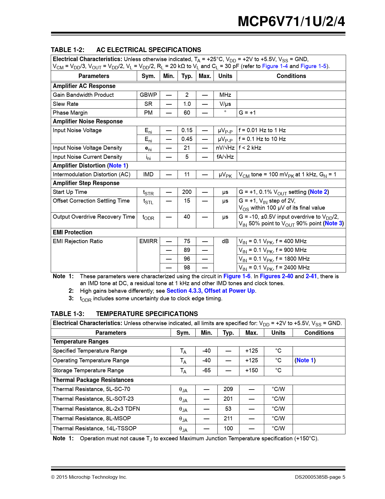 Operation must not cause TJ to exceed Maximum Junction Temperature specification (+150°C).  2015 Microchip Technology Inc. DS20005385B-page 5 Document Outline Features Typical Applications Design Aids Related Parts Description Package Types Typical Application Circuit 1.0 Electrical Characteristics 1.1 Absolute Maximum Ratings † 1.2 Specifications TABLE 1-1: DC Electrical Specifications (Continued) TABLE 1-2: AC Electrical Specifications TABLE 1-3: Temperature Specifications 1.3 Timing Diagrams FIGURE 1-1: Amplifier Start Up. FIGURE 1-2: Offset Correction Settling Time. FIGURE 1-3: Output Overdrive Recovery. 1.4 Test Circuits FIGURE 1-4: AC and DC Test Circuit for Most Noninverting Gain Conditions. FIGURE 1-5: AC and DC Test Circuit for Most Inverting Gain Conditions. FIGURE 1-6: Test Circuit for Dynamic Input Behavior. 2.0 Typical Performance Curves 2.1 DC Input Precision FIGURE 2-1: Input Offset Voltage. FIGURE 2-2: Input Offset Voltage Drift. FIGURE 2-3: Input Offset Voltage Quadratic Temp. Co. FIGURE 2-4: Input Offset Voltage vs. Power Supply Voltage with VCM = VCML. FIGURE 2-5: Input Offset Voltage vs. Power Supply Voltage with VCM = VCMH. FIGURE 2-6: Input Offset Voltage vs. Output Voltage with VDD = 2.0V. FIGURE 2-7: Input Offset Voltage vs. Output Voltage with VDD = 5.5V. FIGURE 2-8: Input Offset Voltage vs. Common Mode Voltage with VDD = 2V. FIGURE 2-9: Input Offset Voltage vs. Common Mode Voltage with VDD = 5.5V. FIGURE 2-10: Common Mode Rejection Ratio. FIGURE 2-11: Power Supply Rejection Ratio. FIGURE 2-12: DC Open-Loop Gain. FIGURE 2-13: CMRR and PSRR vs. Ambient Temperature. FIGURE 2-14: DC Open-Loop Gain vs. Ambient Temperature. FIGURE 2-15: Input Bias and Offset Currents vs. Common Mode Input Voltage with TA = +85°C. FIGURE 2-16: Input Bias and Offset Currents vs. Common Mode Input Voltage with TA = +125°C. FIGURE 2-17: Input Bias and Offset Currents vs. Ambient Temperature with VDD = +5.5V. FIGURE 2-18: Input Bias Current vs. Input Voltage (below VSS). 2.2 Other DC Voltages and Currents FIGURE 2-19: Input Common Mode Voltage Headroom (Range) vs. Ambient Temperature. FIGURE 2-20: Output Voltage Headroom vs. Output Current. FIGURE 2-21: Output Voltage Headroom vs. Ambient Temperature. FIGURE 2-22: Output Short Circuit Current vs. Power Supply Voltage. FIGURE 2-23: Supply Current vs. Power Supply Voltage. FIGURE 2-24: Power-On Reset Trip Voltage. FIGURE 2-25: Power-On Reset Voltage vs. Ambient Temperature. 2.3 Frequency Response FIGURE 2-26: CMRR and PSRR vs. Frequency. FIGURE 2-27: Open-Loop Gain vs. Frequency with VDD = 2V. FIGURE 2-28: Open-Loop Gain vs. Frequency with VDD = 5.5V. FIGURE 2-29: Gain Bandwidth Product and Phase Margin vs. Ambient Temperature. FIGURE 2-30: Gain Bandwidth Product and Phase Margin vs. Common Mode Input Voltage. FIGURE 2-31: Gain Bandwidth Product and Phase Margin vs. Output Voltage. FIGURE 2-32: Closed-Loop Output Impedance vs. Frequency with VDD = 2V. FIGURE 2-33: Closed-Loop Output Impedance vs. Frequency with VDD = 5.5V. FIGURE 2-34: Maximum Output Voltage Swing vs. Frequency. FIGURE 2-35: EMIRR vs Frequency. FIGURE 2-36: EMIRR vs RF Input Peak Voltage. FIGURE 2-37: Channel-to-Channel Separation vs. Frequency. 2.4 Input Noise and Distortion FIGURE 2-38: Input Noise Voltage Density and Integrated Input Noise Voltage vs. Frequency. FIGURE 2-39: Input Noise Voltage Density vs. Input Common Mode Voltage. FIGURE 2-40: Intermodulation Distortion vs. Frequency with VCM Disturbance (see Figure 1-6). FIGURE 2-41: Intermodulation Distortion vs. Frequency with VDD Disturbance (see Figure 1-6). FIGURE 2-42: Input Noise vs. Time with 1 Hz and 10 Hz Filters and VDD = 2V. FIGURE 2-43: Input Noise vs. Time with 1 Hz and 10 Hz Filters and VDD = 5.5V. 2.5 Time Response FIGURE 2-44: Input Offset Voltage vs. Time with Temperature Change. FIGURE 2-45: Input Offset Voltage vs. Time at Power-Up. FIGURE 2-46: The MCP6V71/1U/2/4 Family Shows No Input Phase Reversal with Overdrive. FIGURE 2-47: Non-inverting Small Signal Step Response. FIGURE 2-48: Non-inverting Large Signal Step Response. FIGURE 2-49: Inverting Small Signal Step Response. FIGURE 2-50: Inverting Large Signal Step Response. FIGURE 2-51: Slew Rate vs. Ambient Temperature. FIGURE 2-52: Output Overdrive Recovery vs. Time with G = -10 V/V. FIGURE 2-53: Output Overdrive Recovery Time vs. Inverting Gain. 3.0 Pin Descriptions TABLE 3-1: Pin Function Table 3.1 Analog Outputs 3.2 Analog Inputs 3.3 Power Supply Pins 3.4 Exposed Thermal Pad (EP) 4.0 Applications 4.1 Overview of Zero-Drift Operation FIGURE 4-1: Simplified Zero-Drift Op Amp Functional Diagram. FIGURE 4-2: First Chopping Clock Phase; Equivalent Amplifier Diagram. FIGURE 4-3: Second Chopping Clock Phase; Equivalent Amplifier Diagram. 4.2 Other Functional Blocks FIGURE 4-4: Simplified Analog Input ESD Structures. FIGURE 4-5: Protecting the Analog Inputs Against High Voltages. FIGURE 4-6: Protecting the Analog Inputs Against High Currents. 4.3 Application Tips FIGURE 4-7: Output Resistor, RISO, Stabilizes Capacitive Loads. FIGURE 4-8: Recommended RISO values for Capacitive Loads. FIGURE 4-9: Output Load. FIGURE 4-10: Amplifier with Parasitic Capacitance. 4.4 Typical Applications FIGURE 4-11: Simple Design. FIGURE 4-12: RTD Sensor. FIGURE 4-13: Offset Correction. FIGURE 4-14: Precision Comparator. 5.0 Design Aids 5.1 FilterLab® Software 5.2 Microchip Advanced Part Selector (MAPS) 5.3 Analog Demonstration and Evaluation Boards 5.4 Application Notes 6.0 Packaging Information 6.1 Package Marking Information 170 µA, 2 MHz Zero-Drift Op Amps Appendix A: Revision History Revision B (September 2015) Revision A (March 2015) Product Identification System AMERICAS ASIA/PACIFIC ASIA/PACIFIC EUROPE Worldwide Sales and Service