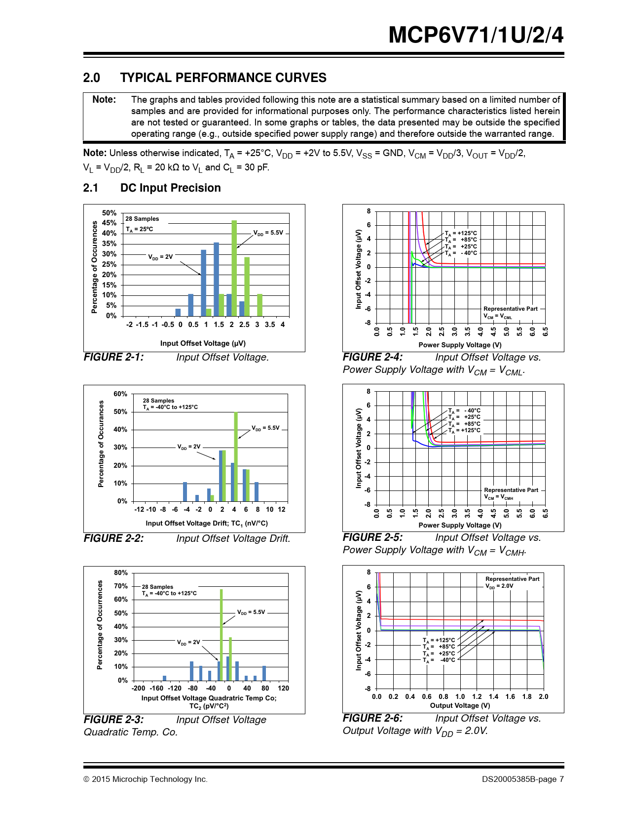 MCP6V71/1U/2/42.0TYPICAL PERFORMANCE CURVESNote: The graphs and tables provided following this note are a statistical summary based on a limited number of samples and are provided for informational purposes only. The performance characteristics listed herein are not tested or guaranteed. In some graphs or tables, the data presented may be outside the specified operating range (e.g., outside specified power supply range) and therefore outside the warranted range. Note: Unless otherwise indicated, TA = +25°C, VDD = +2V to 5.5V, VSS = GND, VCM = VDD/3, VOUT = VDD/2, VL = VDD/2, RL = 20 kΩ to VL and CL = 30 pF. 2.1DC Input Precision50%828 Samples45%6T = 25ºC40%AV= 5.5VDDT = +125°CA(µV) 4T = +85°C35%AT = +25°CA30%2T = - 40°CV= 2VAOccurencesDDltage25%o 020%-215%10%-45%Input Offset VPercentage of-6Representative Part0%V= VCMCML-2 -1.5 -1 -0.5 0 0.5 1 1.5 2 2.5 3 3.5 4-80.00.51.01.52.02.53.03.54.04.55.05.56.06.5Input Offset Voltage (µV)Power Supply Voltage (V)FIGURE 2-1: Input Offset Voltage. FIGURE 2-4: Input Offset Voltage vs. Power Supply Voltage with VCM = VCML. 60%828 Samples T = -40°C to +125°C650%AT = - 40°CA(µV) 4T = +25°CAT = +85°CA40%V= 5.5VDDT = +125°C2AOccurancesltage o30%V= 2VDD0-220%-410%Percentage ofInput Offset V -6Representative Part V= V0%CMCMH-8-12 -10 -8 -6 -4 -202468 10 120.00.51.01.52.02.53.03.54.04.55.05.56.06.5Input Offset Voltage Drift; TC (nV/°C)1Power Supply Voltage (V)FIGURE 2-2: Input Offset Voltage Drift. FIGURE 2-5: Input Offset Voltage vs. Power Supply Voltage with VCM = VCMH. 80%8Representative Part70%28 Samples6V= 2.0VDDT = -40°C to +125°CA60%(µV) 450%V= 5.5VDD2Occurrencesltage40%o030%V= 2VT = +125°CADD-2T = +85°CA20%T = +25°CA-4T = -40°CAPercentage of10%Input Offset V -60%-200 -160 -120 -80-4004080120-8Input Offset Voltage Quadratric Temp Co;0.00.20.40.60.81.01.21.41.61.82.0TC (pV/°C2)Output Voltage (V)2FIGURE 2-3: Input Offset Voltage FIGURE 2-6: Input Offset Voltage vs. Quadratic Temp. Co. Output Voltage with VDD = 2.0V. 2015 Microchip Technology Inc. DS20005385B-page 7 Document Outline Features Typical Applications Design Aids Related Parts Description Package Types Typical Application Circuit 1.0 Electrical Characteristics 1.1 Absolute Maximum Ratings † 1.2 Specifications TABLE 1-1: DC Electrical Specifications (Continued) TABLE 1-2: AC Electrical Specifications TABLE 1-3: Temperature Specifications 1.3 Timing Diagrams FIGURE 1-1: Amplifier Start Up. FIGURE 1-2: Offset Correction Settling Time. FIGURE 1-3: Output Overdrive Recovery. 1.4 Test Circuits FIGURE 1-4: AC and DC Test Circuit for Most Noninverting Gain Conditions. FIGURE 1-5: AC and DC Test Circuit for Most Inverting Gain Conditions. FIGURE 1-6: Test Circuit for Dynamic Input Behavior. 2.0 Typical Performance Curves 2.1 DC Input Precision FIGURE 2-1: Input Offset Voltage. FIGURE 2-2: Input Offset Voltage Drift. FIGURE 2-3: Input Offset Voltage Quadratic Temp. Co. FIGURE 2-4: Input Offset Voltage vs. Power Supply Voltage with VCM = VCML. FIGURE 2-5: Input Offset Voltage vs. Power Supply Voltage with VCM = VCMH. FIGURE 2-6: Input Offset Voltage vs. Output Voltage with VDD = 2.0V. FIGURE 2-7: Input Offset Voltage vs. Output Voltage with VDD = 5.5V. FIGURE 2-8: Input Offset Voltage vs. Common Mode Voltage with VDD = 2V. FIGURE 2-9: Input Offset Voltage vs. Common Mode Voltage with VDD = 5.5V. FIGURE 2-10: Common Mode Rejection Ratio. FIGURE 2-11: Power Supply Rejection Ratio. FIGURE 2-12: DC Open-Loop Gain. FIGURE 2-13: CMRR and PSRR vs. Ambient Temperature. FIGURE 2-14: DC Open-Loop Gain vs. Ambient Temperature. FIGURE 2-15: Input Bias and Offset Currents vs. Common Mode Input Voltage with TA = +85°C. FIGURE 2-16: Input Bias and Offset Currents vs. Common Mode Input Voltage with TA = +125°C. FIGURE 2-17: Input Bias and Offset Currents vs. Ambient Temperature with VDD = +5.5V. FIGURE 2-18: Input Bias Current vs. Input Voltage (below VSS). 2.2 Other DC Voltages and Currents FIGURE 2-19: Input Common Mode Voltage Headroom (Range) vs. Ambient Temperature. FIGURE 2-20: Output Voltage Headroom vs. Output Current. FIGURE 2-21: Output Voltage Headroom vs. Ambient Temperature. FIGURE 2-22: Output Short Circuit Current vs. Power Supply Voltage. FIGURE 2-23: Supply Current vs. Power Supply Voltage. FIGURE 2-24: Power-On Reset Trip Voltage. FIGURE 2-25: Power-On Reset Voltage vs. Ambient Temperature. 2.3 Frequency Response FIGURE 2-26: CMRR and PSRR vs. Frequency. FIGURE 2-27: Open-Loop Gain vs. Frequency with VDD = 2V. FIGURE 2-28: Open-Loop Gain vs. Frequency with VDD = 5.5V. FIGURE 2-29: Gain Bandwidth Product and Phase Margin vs. Ambient Temperature. FIGURE 2-30: Gain Bandwidth Product and Phase Margin vs. Common Mode Input Voltage. FIGURE 2-31: Gain Bandwidth Product and Phase Margin vs. Output Voltage. FIGURE 2-32: Closed-Loop Output Impedance vs. Frequency with VDD = 2V. FIGURE 2-33: Closed-Loop Output Impedance vs. Frequency with VDD = 5.5V. FIGURE 2-34: Maximum Output Voltage Swing vs. Frequency. FIGURE 2-35: EMIRR vs Frequency. FIGURE 2-36: EMIRR vs RF Input Peak Voltage. FIGURE 2-37: Channel-to-Channel Separation vs. Frequency. 2.4 Input Noise and Distortion FIGURE 2-38: Input Noise Voltage Density and Integrated Input Noise Voltage vs. Frequency. FIGURE 2-39: Input Noise Voltage Density vs. Input Common Mode Voltage. FIGURE 2-40: Intermodulation Distortion vs. Frequency with VCM Disturbance (see Figure 1-6). FIGURE 2-41: Intermodulation Distortion vs. Frequency with VDD Disturbance (see Figure 1-6). FIGURE 2-42: Input Noise vs. Time with 1 Hz and 10 Hz Filters and VDD = 2V. FIGURE 2-43: Input Noise vs. Time with 1 Hz and 10 Hz Filters and VDD = 5.5V. 2.5 Time Response FIGURE 2-44: Input Offset Voltage vs. Time with Temperature Change. FIGURE 2-45: Input Offset Voltage vs. Time at Power-Up. FIGURE 2-46: The MCP6V71/1U/2/4 Family Shows No Input Phase Reversal with Overdrive. FIGURE 2-47: Non-inverting Small Signal Step Response. FIGURE 2-48: Non-inverting Large Signal Step R