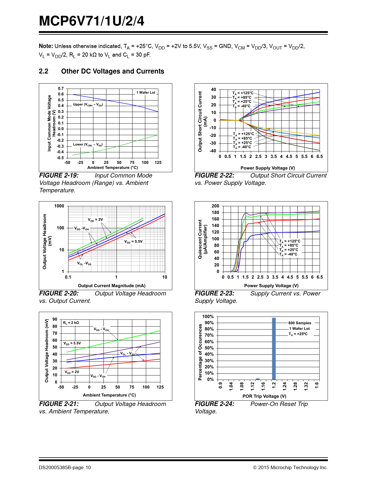 Power-On Reset Trip vs. Ambient Temperature. Voltage. DS20005385B-page 10  2015 Microchip Technology Inc. Document Outline Features Typical Applications Design Aids Related Parts Description Package Types Typical Application Circuit 1.0 Electrical Characteristics 1.1 Absolute Maximum Ratings † 1.2 Specifications TABLE 1-1: DC Electrical Specifications (Continued) TABLE 1-2: AC Electrical Specifications TABLE 1-3: Temperature Specifications 1.3 Timing Diagrams FIGURE 1-1: Amplifier Start Up. FIGURE 1-2: Offset Correction Settling Time. FIGURE 1-3: Output Overdrive Recovery. 1.4 Test Circuits FIGURE 1-4: AC and DC Test Circuit for Most Noninverting Gain Conditions. FIGURE 1-5: AC and DC Test Circuit for Most Inverting Gain Conditions. FIGURE 1-6: Test Circuit for Dynamic Input Behavior. 2.0 Typical Performance Curves 2.1 DC Input Precision FIGURE 2-1: Input Offset Voltage. FIGURE 2-2: Input Offset Voltage Drift. FIGURE 2-3: Input Offset Voltage Quadratic Temp. Co. FIGURE 2-4: Input Offset Voltage vs. Power Supply Voltage with VCM = VCML. FIGURE 2-5: Input Offset Voltage vs. Power Supply Voltage with VCM = VCMH. FIGURE 2-6: Input Offset Voltage vs. Output Voltage with VDD = 2.0V. FIGURE 2-7: Input Offset Voltage vs. Output Voltage with VDD = 5.5V. FIGURE 2-8: Input Offset Voltage vs. Common Mode Voltage with VDD = 2V. FIGURE 2-9: Input Offset Voltage vs. Common Mode Voltage with VDD = 5.5V. FIGURE 2-10: Common Mode Rejection Ratio. FIGURE 2-11: Power Supply Rejection Ratio. FIGURE 2-12: DC Open-Loop Gain. FIGURE 2-13: CMRR and PSRR vs. Ambient Temperature. FIGURE 2-14: DC Open-Loop Gain vs. Ambient Temperature. FIGURE 2-15: Input Bias and Offset Currents vs. Common Mode Input Voltage with TA = +85°C. FIGURE 2-16: Input Bias and Offset Currents vs. Common Mode Input Voltage with TA = +125°C. FIGURE 2-17: Input Bias and Offset Currents vs. Ambient Temperature with VDD = +5.5V. FIGURE 2-18: Input Bias Current vs. Input Voltage (below VSS). 2.2 Other DC Voltages and Currents FIGURE 2-19: Input Common Mode Voltage Headroom (Range) vs. Ambient Temperature. FIGURE 2-20: Output Voltage Headroom vs. Output Current. FIGURE 2-21: Output Voltage Headroom vs. Ambient Temperature. FIGURE 2-22: Output Short Circuit Current vs. Power Supply Voltage. FIGURE 2-23: Supply Current vs. Power Supply Voltage. FIGURE 2-24: Power-On Reset Trip Voltage. FIGURE 2-25: Power-On Reset Voltage vs. Ambient Temperature. 2.3 Frequency Response FIGURE 2-26: CMRR and PSRR vs. Frequency. FIGURE 2-27: Open-Loop Gain vs. Frequency with VDD = 2V. FIGURE 2-28: Open-Loop Gain vs. Frequency with VDD = 5.5V. FIGURE 2-29: Gain Bandwidth Product and Phase Margin vs. Ambient Temperature. FIGURE 2-30: Gain Bandwidth Product and Phase Margin vs. Common Mode Input Voltage. FIGURE 2-31: Gain Bandwidth Product and Phase Margin vs. Output Voltage. FIGURE 2-32: Closed-Loop Output Impedance vs. Frequency with VDD = 2V. FIGURE 2-33: Closed-Loop Output Impedance vs. Frequency with VDD = 5.5V. FIGURE 2-34: Maximum Output Voltage Swing vs. Frequency. FIGURE 2-35: EMIRR vs Frequency. FIGURE 2-36: EMIRR vs RF Input Peak Voltage. FIGURE 2-37: Channel-to-Channel Separation vs. Frequency. 2.4 Input Noise and Distortion FIGURE 2-38: Input Noise Voltage Density and Integrated Input Noise Voltage vs. Frequency. FIGURE 2-39: Input Noise Voltage Density vs. Input Common Mode Voltage. FIGURE 2-40: Intermodulation Distortion vs. Frequency with VCM Disturbance (see Figure 1-6). FIGURE 2-41: Intermodulation Distortion vs. Frequency with VDD Disturbance (see Figure 1-6). FIGURE 2-42: Input Noise vs. Time with 1 Hz and 10 Hz Filters and VDD = 2V. FIGURE 2-43: Input Noise vs. Time with 1 Hz and 10 Hz Filters and VDD = 5.5V. 2.5 Time Response FIGURE 2-44: Input Offset Voltage vs. Time with Temperature Change. FIGURE 2-45: Input Offset Voltage vs. Time at Power-Up. FIGURE 2-46: The MCP6V71/1U/2/4 Family Shows No Input Phase Reversal with Overdrive. FIGURE 2-47: Non-inverting Small Signal Step Response. FIGURE 2-48: Non-inverting Large Signal Step Response. FIGURE 2-49: Inverting Small Signal Step Response. FIGURE 2-50: Inverting Large Signal Step Response. FIGURE 2-51: Slew Rate vs. Ambient Temperature. FIGURE 2-52: Output Overdrive Recovery vs. Time with G = -10 V/V. FIGURE 2-53: Output Overdrive Recovery Time vs. Inverting Gain. 3.0 Pin Descriptions TABLE 3-1: Pin Function Table 3.1 Analog Outputs 3.2 Analog Inputs 3.3 Power Supply Pins 3.4 Exposed Thermal Pad (EP) 4.0 Applications 4.1 Overview of Zero-Drift Operation FIGURE 4-1: Simplified Zero-Drift Op Amp Functional Diagram. FIGURE 4-2: First Chopping Clock Phase; Equivalent Amplifier Diagram. FIGURE 4-3: Second Chopping Clock Phase; Equivalent Amplifier Diagram. 4.2 Other Functional Blocks FIGURE 4-4: Simplified Analog Input ESD Structures. FIGURE 4-5: Protecting the Analog Inputs Against High Voltages. FIGURE 4-6: Protecting the Analog Inputs Against High Currents. 4.3 Application Tips FIGURE 4-7: Output Resistor, RISO, Stabilizes Capacitive Loads. FIGURE 4-8: Recommended RISO values for Capacitive Loads. FIGURE 4-9: Output Load. FIGURE 4-10: Amplifier with Parasitic Capacitance. 4.4 Typical Applications FIGURE 4-11: Simple Design. FIGURE 4-12: RTD Sensor. FIGURE 4-13: Offset Correction. FIGURE 4-14: Precision Comparator. 5.0 Design Aids 5.1 FilterLab® Software 5.2 Microchip Advanced Part Selector (MAPS) 5.3 Analog Demonstration and Evaluation Boards 5.4 Application Notes 6.0 Packaging Information 6.1 Package Marking Information 170 µA, 2 MHz Zero-Drift Op Amps Appendix A: Revision History Revision B (September 2015) Revision A (March 2015) Product Identification System AMERICAS ASIA/PACIFIC ASIA/PACIFIC EUROPE Worldwide Sales and Service