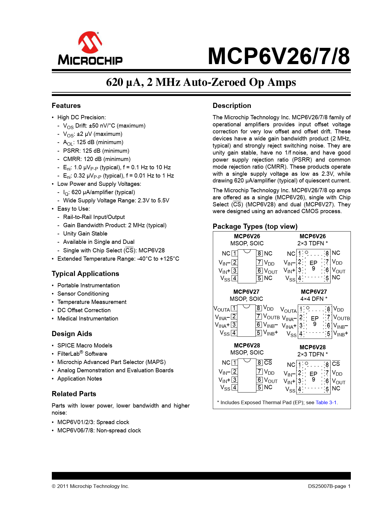 MCP6V26/7/8. 620 µA, 2 MHz Auto-Zeroed Op Amps. Features. Description. Package Types (top view). MCP6V26. Typical Applications