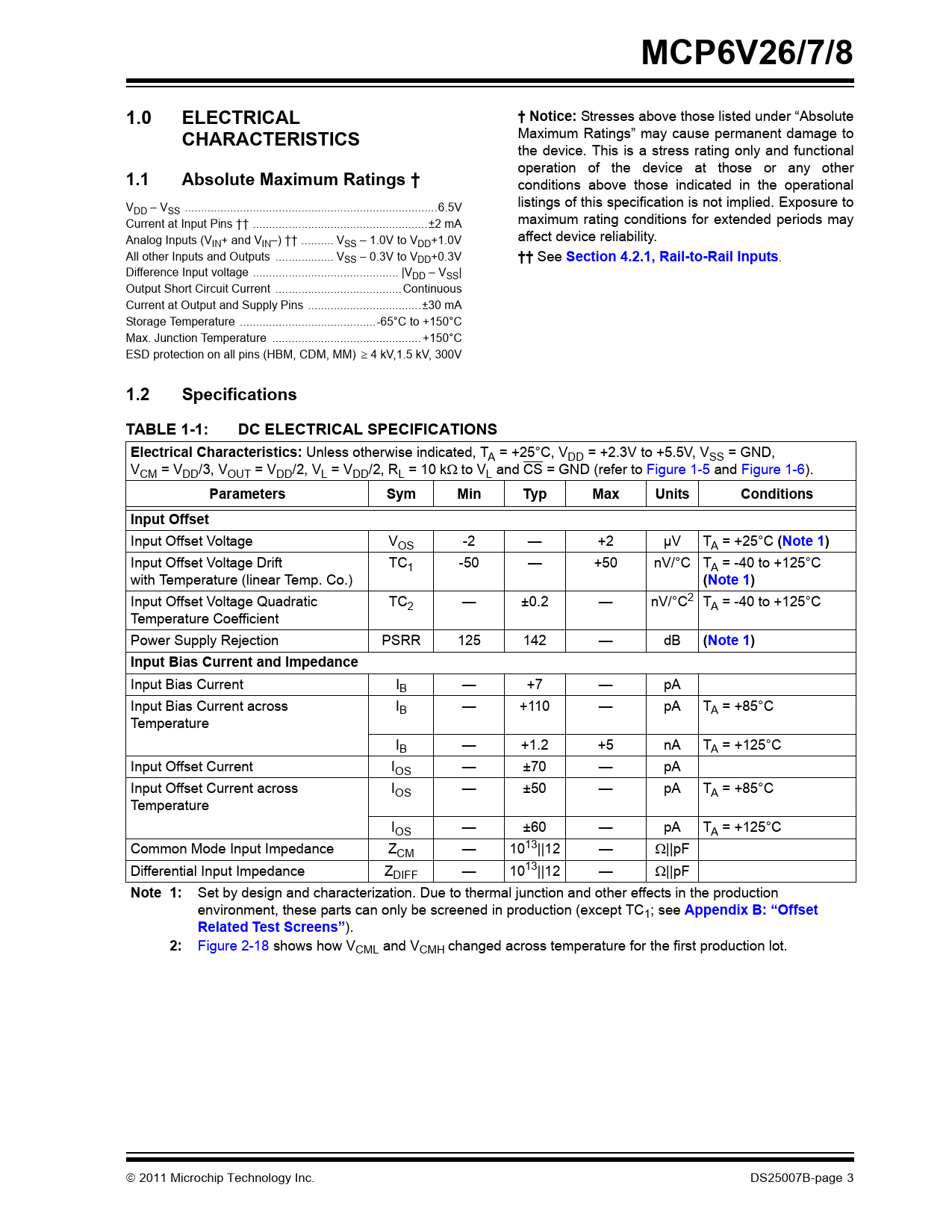| Pages / Page | 50 / 3 — MCP6V26/7/8. 1.0. ELECTRICAL. † Notice:. CHARACTERISTICS. 1.1. Absolute … |
