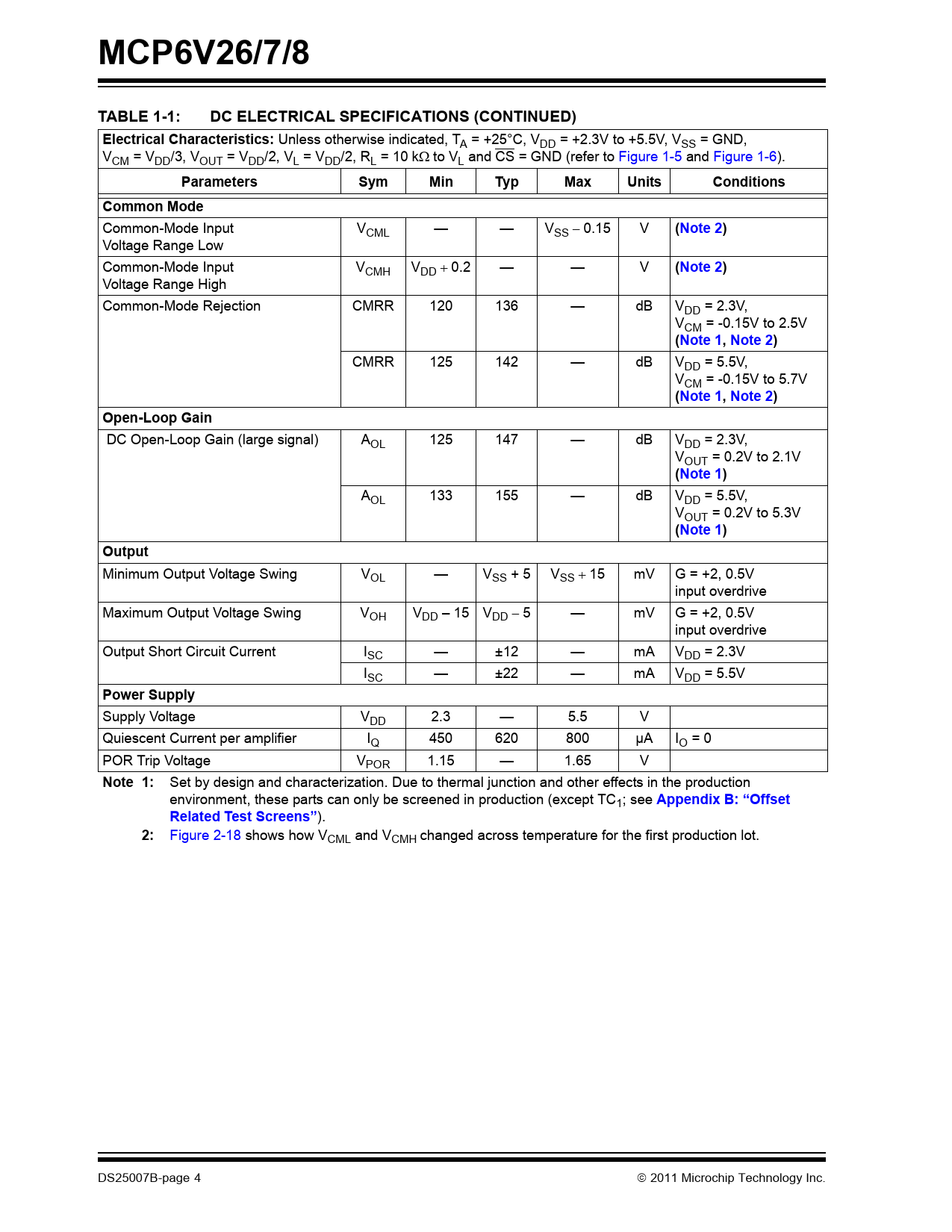 MCP6V26/7/8 TABLE 1-1: DC ELECTRICAL SPECIFICATIONS (CONTINUED) Electrical Characteristics: