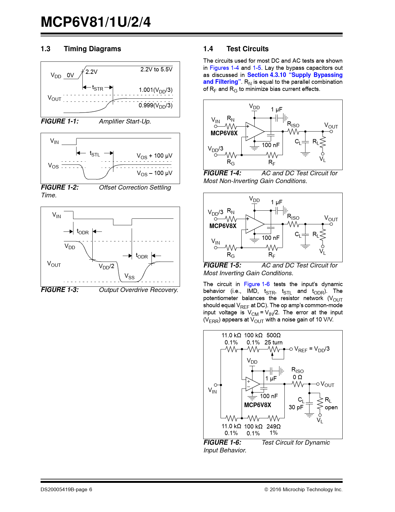 link to page 6 link to page 6 link to page 23 link to page 23 link to page 6 MCP6V81/1U/2/41.3Timing Diagrams1.4Test Circuits The circuits used for most DC and AC tests are shown in Figures 1-4 and 1-5. Lay the bypass capacitors out 2.2V to 5.5V V 2.2V 0V as discussed in Section 4.3.10 “Supply Bypassing DD and Filtering” . RN is equal to the parallel combination tSTR 1.001(V of R DD/3) F and RG to minimize bias current effects. VOUT 0.999(VDD/3) VDD 1 µF R FIGURE 1-1: Amplifier Start-Up. V N IN R + ISO VOUT MCP6V8X - VIN CL RL 100 nF V t DD/3 STL VOS + 100 µV V R L V G RF OS VOS – 100 µV FIGURE 1-4: AC and DC Test Circuit for Most Non-Inverting Gain Conditions. FIGURE 1-2: Offset Correction Settling Time. VDD 1 µF R V V N IN DD/3 R + ISO VOUT MCP6V8X t - ODR CL RL 100 nF V V IN DD V t L ODR RG RF VOUT V FIGURE 1-5: AC and DC Test Circuit for DD/2 Most Inverting Gain Conditions. VSS The circuit in Figure 1-6 tests the input’s dynamic FIGURE 1-3: Output Overdrive Recovery. behavior (i.e., IMD, tSTR, tSTL and tODR). The potentiometer balances the resistor network (VOUT should equal VREF at DC). The op amp’s common-mode input voltage is VCM = VIN/2. The error at the input (VERR) appears at VOUT with a noise gain of 10 V/V. 11.0 kΩ 100 kΩ 500Ω 0.1% 0.1% 25 turn VREF = VDD/3 VDD RISO 1 µF 0 Ω VOUT VIN 100 nF CL RL MCP6V8X 30 pF open VL 11.0 kΩ 100 kΩ 249Ω 0.1% 0.1% 1% FIGURE 1-6: Test Circuit for Dynamic Input Behavior. DS20005419B-page 6 2016 Microchip Technology Inc. Document Outline 5 MHz, 0.5 mA, Zero-Drift Op Amps Features Typical Applications Design Aids Related Parts Description Package Types Typical Application Circuit FIGURE 1: Input Offset Voltage vs. Ambient Temperature with VDD = 2.2V. FIGURE 2: Input Offset Voltage vs. Ambient Temperature with VDD = 5.5V. 1.0 Electrical Characteristics 1.1 Absolute Maximum Ratings † 1.2 Specifications TABLE 1-1: DC Electrical Specifications TABLE 1-2: AC Electrical Specifications TABLE 1-3: Temperature Specifications 1.3 Timing Diagrams FIGURE 1-1: Amplifier Start-Up. FIGURE 1-2: Offset Correction Settling Time. FIGURE 1-3: Output Overdrive Recovery. 1.4 Test Circuits FIGURE 1-4: AC and DC Test Circuit for Most Non-Inverting Gain Conditions. FIGURE 1-5: AC and DC Test Circuit for Most Inverting Gain Conditions. FIGURE 1-6: Test Circuit for Dynamic Input Behavior. 2.0 Typical Performance Curves 2.1 DC Input Precision FIGURE 2-1: Input Offset Voltage. FIGURE 2-2: Input Offset Voltage Drift. FIGURE 2-3: Input Offset Voltage Quadratic Temperature Coefficient. FIGURE 2-4: Input Offset Voltage vs. Power Supply Voltage with VCM = VCML. FIGURE 2-5: Input Offset Voltage vs. Power Supply Voltage with VCM = VCMH. FIGURE 2-6: Input Offset Voltage vs. Output Voltage with VDD = 2.2V. FIGURE 2-7: Input Offset Voltage vs. Output Voltage with VDD = 5.5V. FIGURE 2-8: Input Offset Voltage vs. Common-Mode Voltage with VDD = 2.2V. FIGURE 2-9: Input Offset Voltage vs. Common-Mode Voltage with VDD = 5.5V. FIGURE 2-10: Common-Mode Rejection Ratio. FIGURE 2-11: Power Supply Rejection Ratio. FIGURE 2-12: DC Open-Loop Gain. FIGURE 2-13: CMRR and PSRR vs. Ambient Temperature. FIGURE 2-14: DC Open-Loop Gain vs. Ambient Temperature. FIGURE 2-15: Input Bias and Offset Currents vs. Common-Mode Input Voltage with TA = +85°C. FIGURE 2-16: Input Bias and Offset Currents vs. Common-Mode Input Voltage with TA = +125°C. FIGURE 2-17: Input Bias and Offset Currents vs. Ambient Temperature with VDD = 5.5V. FIGURE 2-18: Input Bias Current vs. Input Voltage (Below VSS). 2.2 Other DC Voltages and Currents FIGURE 2-19: Input Common-Mode Voltage Headroom (Range) vs. Ambient Temperature. FIGURE 2-20: Output Voltage Headroom vs. Output Current. FIGURE 2-21: Output Voltage Headroom vs. Ambient Temperature. FIGURE 2-22: Output Short-Circuit Current vs. Power Supply Voltage. FIGURE 2-23: Supply Current vs. Power Supply Voltage. FIGURE 2-24: Power-on Reset Trip Voltage. FIGURE 2-25: Power-on Reset Voltage vs. Ambient Temperature. 2.3 Frequency Response FIGURE 2-26: CMRR and PSRR vs. Frequency. FIGURE 2-27: Open-Loop Gain vs. Frequency with VDD = 2.2V. FIGURE 2-28: Open-Loop Gain vs. Frequency with VDD = 5.5V. FIGURE 2-29: Gain Bandwidth Product and Phase Margin vs. Ambient Temperature. FIGURE 2-30: Gain Bandwidth Product and Phase Margin vs. Common-Mode Input Voltage. FIGURE 2-31: Gain Bandwidth Product and Phase Margin vs. Output Voltage. FIGURE 2-32: Closed-Loop Output Impedance vs. Frequency with VDD = 2.2V. FIGURE 2-33: Closed-Loop Output Impedance vs. Frequency with VDD = 5.5V. FIGURE 2-34: Maximum Output Voltage Swing vs. Frequency. FIGURE 2-35: EMIRR vs. Frequency. FIGURE 2-36: EMIRR vs. Input Voltage. FIGURE 2-37: Channel-to-Channel Separation vs. Frequency. 2.4 Input Noise and Distortion FIGURE 2-38: Input Noise Voltage Density and Integrated Input Noise Voltage vs. Frequency. FIGURE 2-39: Input Noise Voltage Density vs. Input Common-Mode Voltage. FIGURE 2-40: Intermodulation Distortion vs. Frequency with VCM Disturbance (see Figure 1-6). FIGURE 2-41: Intermodulation Distortion vs. Frequency with VDD Disturbance (see Figure 1-6). FIGURE 2-42: Input Noise vs. Time with 1 Hz and 10 Hz Filters and VDD = 2.2V. FIGURE 2-43: Input Noise vs. Time with 1 Hz and 10 Hz Filters and VDD = 5.5V. 2.5 Time Response FIGURE 2-44: Input Offset Voltage vs. Time with Temperature Change. FIGURE 2-45: Input Offset Voltage vs. Time at Power-Up. FIGURE 2-46: The MCP6V81/1U/2/4 Family Shows No Input Phase Reversal with Overdrive. FIGURE 2-47: Non-Inverting Small Signal Step Response. FIGURE 2-48: Non-Inverting Large Signal Step Response. FIGURE 2-49: Inverting Small Signal Step Response. FIGURE 2-50: Inverting Large Signal Step Response. FIGURE 2-51: Slew Rate vs. Ambient Temperature. FIGURE 2-52: Output Overdrive Recovery vs. Time with G = -10 V/V. FIGURE 2-53: Output Overdrive Recovery Time vs. Inverting Gain. 3.0 Pin Descriptions TABLE 3-1: Pin Function Table 3.1 Analog Outputs (VOUT, 