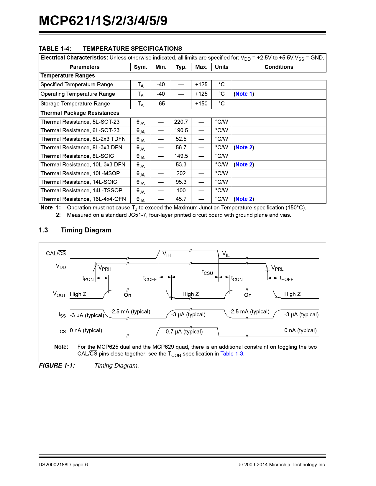 Timing Diagram. DS20002188D-page 6  2009-2014 Microchip Technology Inc. Document Outline 20 MHz, 200 µV Op Amps with mCal Features Typical Applications Design Aids Description Typical Application Circuit High Gain-Bandwidth Op Amp Portfolio Package Types 1.0 Electrical Characteristics 1.1 Absolute Maximum Ratings † 1.2 Specifications TABLE 1-1: DC Electrical Specifications TABLE 1-2: AC Electrical Specifications TABLE 1-3: Digital Electrical Specifications TABLE 1-4: Temperature Specifications 1.3 Timing Diagram FIGURE 1-1: Timing Diagram. 1.4 Test Circuits FIGURE 1-2: AC and DC Test Circuit for Most Specifications. 2.0 Typical Performance Curves 2.1 DC Signal Inputs FIGURE 2-1: Input Offset Voltage. FIGURE 2-2: Input Offset Voltage Drift. FIGURE 2-3: Input Offset Voltage Repeatability (repeated calibration). FIGURE 2-4: Input Offset Voltage vs. Power Supply Voltage. FIGURE 2-5: Input Offset Voltage vs. Output Voltage. FIGURE 2-6: Low Input Common Mode Voltage Headroom vs. Ambient Temperature. FIGURE 2-7: High Input Common Mode Voltage Headroom vs. Ambient Temperature. FIGURE 2-8: Input Offset Voltage vs. Common Mode Voltage with VDD = 2.5V. FIGURE 2-9: Input Offset Voltage vs. Common Mode Voltage with VDD = 5.5V. FIGURE 2-10: CMRR and PSRR vs. Ambient Temperature. FIGURE 2-11: DC Open-Loop Gain vs. Ambient Temperature. FIGURE 2-12: Input Bias and Offset Currents vs. Ambient Temperature with VDD = +5.5V. FIGURE 2-13: Input Bias and Offset Currents vs. Common Mode Input Voltage with TA = +85°C. FIGURE 2-14: Input Bias and Offset Currents vs. Common Mode Input Voltage with TA = +125°C. FIGURE 2-15: Input Bias Current vs. Input Voltage (below VSS). 2.2 Other DC Voltages and Currents FIGURE 2-16: Ratio of Output Voltage Headroom to Output Current. FIGURE 2-17: Output Voltage Headroom vs. Ambient Temperature. FIGURE 2-18: Output Short-Circuit Current vs. Power Supply Voltage. FIGURE 2-19: Supply Current vs. Power Supply Voltage. FIGURE 2-20: Supply Current vs. Common Mode Input Voltage. FIGURE 2-21: Power-On Reset Voltages vs. Ambient Temperature. FIGURE 2-22: Normalized Internal Calibration Voltage. FIGURE 2-23: VCAL Input Resistance vs. Temperature. 2.3 Frequency Response FIGURE 2-24: CMRR and PSRR vs. Frequency. FIGURE 2-25: Open-Loop Gain vs. Frequency. FIGURE 2-26: Gain Bandwidth Product and Phase Margin vs. Ambient Temperature. FIGURE 2-27: Gain Bandwidth Product and Phase Margin vs. Common Mode Input Voltage. FIGURE 2-28: Gain Bandwidth Product and Phase Margin vs. Output Voltage. FIGURE 2-29: Closed-Loop Output Impedance vs. Frequency. FIGURE 2-30: Gain Peaking vs. Normalized Capacitive Load. FIGURE 2-31: Channel-to-Channel Separation vs. Frequency. 2.4 Input Noise and Distortion FIGURE 2-32: Input Noise Voltage Density vs. Frequency. FIGURE 2-33: Input Noise Voltage Density vs. Input Common Mode Voltage with f = 100 Hz. FIGURE 2-34: Input Noise Voltage Density vs. Input Common Mode Voltage with f = 1 MHz. FIGURE 2-35: Input Noise plus Offset vs. Time with 0.1 Hz Filter. FIGURE 2-36: THD+N vs. Frequency. 2.5 Time Response FIGURE 2-37: Non-Inverting Small Signal Step Response. FIGURE 2-38: Non-Inverting Large Signal Step Response. FIGURE 2-39: Inverting Small Signal Step Response. FIGURE 2-40: Inverting Large Signal Step Response. FIGURE 2-41: The MCP621/1S/2/3/4/5/9 Family Shows No Input Phase Reversal with Overdrive. FIGURE 2-42: Slew Rate vs. Ambient Temperature. FIGURE 2-43: Maximum Output Voltage Swing vs. Frequency. 2.6 Calibration and Chip Select Response FIGURE 2-44: CAL/CS Current vs. Power Supply Voltage. FIGURE 2-45: CAL/CS Voltage, Output Voltage and Supply Current (for Side A) vs. Time with VDD = 2.5V. FIGURE 2-46: CAL/CS Voltage, Output Voltage and Supply Current (for Side A) vs. Time with VDD = 5.5V. FIGURE 2-47: CAL/CS Hysteresis vs. Ambient Temperature. FIGURE 2-48: CAL/CS Turn-On Time vs. Ambient Temperature. FIGURE 2-49: CAL/CS’s Pull-Down Resistor (RPD) vs. Ambient Temperature. FIGURE 2-50: Quiescent Current in Shutdown vs. Power Supply Voltage. FIGURE 2-51: Output Leakage Current vs. Output Voltage. 3.0 Pin Descriptions TABLE 3-1: Pin Function Table 3.1 Analog Outputs 3.2 Analog Inputs 3.3 Power Supply Pins 3.4 Calibration Common Mode Voltage Input 3.5 Calibrate/Chip Select Digital Input 3.6 Exposed Thermal Pad (EP) 4.0 Applications 4.1 Calibration and Chip Select FIGURE 4-1: Common-Mode Reference’s Input Circuitry. FIGURE 4-2: Setting VCM with External Resistors. 4.2 Input FIGURE 4-3: Simplified Analog Input ESD Structures. FIGURE 4-4: Protecting the Analog Inputs. FIGURE 4-5: Unity Gain Voltage Limitations for Linear Operation. 4.3 Rail-to-Rail Output FIGURE 4-6: Output Current. FIGURE 4-7: Diagram for Resistive Load Power Calculations. FIGURE 4-8: Diagram for Capacitive Load Power Calculations. 4.4 Improving Stability FIGURE 4-9: Output Resistor, RISO Stabilizes Large Capacitive Loads. FIGURE 4-10: Recommended RISO Values for Capacitive Loads. FIGURE 4-11: Amplifier with Parasitic Capacitance. FIGURE 4-12: Maximum Recommended RF vs. Gain. 4.5 Power Supply 4.6 High Speed PCB Layout 4.7 Typical Applications FIGURE 4-13: Power Driver. FIGURE 4-14: Transimpedance Amplifier for an Optical Detector. FIGURE 4-15: H-Bridge Driver. 5.0 Design Aids 5.1 SPICE Macro Model 5.2 FilterLab® Software 5.3 Microchip Advanced Part Selector (MAPS) 5.4 Analog Demonstration and Evaluation Boards 5.5 Application Notes 6.0 Packaging Information 6.1 Package Marking Information Appendix A: Revision History Product Identification System Trademarks Worldwide Sales and Service