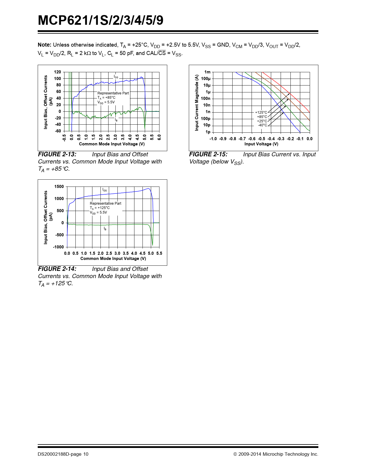 MCP621/1S/2/3/4/5/9Note: Unless otherwise indicated, TA = +25°C, VDD = +2.5V to 5.5V, VSS = GND, VCM = VDD/3, VOUT = VDD/2, VL = VDD/2, RL = 2 kto VL, CL = 50 pF, and CAL/CS = VSS. 1201.E-031ms)100 IOS 1.A E-04100µent rr801.E-0510µutude (C60 Representative Part 1.E-061µ) 40 T fsetA A = +85°C 1.agni E-07100n(p V 20 DD = 5.5V MOf1.E-0810n0ias,1.rrent E-091n +125°C Bu-20 +85°C I 1.C E-10100p B +25°C -4010p -40°C Input1.E-11-60Input1.E-121p50505050505050-0.0.0.1.1.2.2.3.3.4.4.5.5.6.-1.0 -0.9 -0.8 -0.7 -0.6 -0.5 -0.4 -0.3 -0.2 -0.1 0.0Common Mode Input Voltage (V)Input Voltage (V)FIGURE 2-13: Input Bias and Offset FIGURE 2-15: Input Bias Current vs. Input Currents vs. Common Mode Input Voltage with Voltage (below VSS). TA = +85°C. 1500s IOS nt1000rre u Representative Part C T 500 A = +125°C ) V fsetA DD = 5.5V (p, Of0ias IB B-500Input-10000.0 0.5 1.0 1.5 2.0 2.5 3.0 3.5 4.0 4.5 5.0 5.5Common Mode Input Voltage (V)FIGURE 2-14: Input Bias and Offset Currents vs. Common Mode Input Voltage with TA = +125°C. DS20002188D-page 10 2009-2014 Microchip Technology Inc. Document Outline 20 MHz, 200 µV Op Amps with mCal Features Typical Applications Design Aids Description Typical Application Circuit High Gain-Bandwidth Op Amp Portfolio Package Types 1.0 Electrical Characteristics 1.1 Absolute Maximum Ratings † 1.2 Specifications TABLE 1-1: DC Electrical Specifications TABLE 1-2: AC Electrical Specifications TABLE 1-3: Digital Electrical Specifications TABLE 1-4: Temperature Specifications 1.3 Timing Diagram FIGURE 1-1: Timing Diagram. 1.4 Test Circuits FIGURE 1-2: AC and DC Test Circuit for Most Specifications. 2.0 Typical Performance Curves 2.1 DC Signal Inputs FIGURE 2-1: Input Offset Voltage. FIGURE 2-2: Input Offset Voltage Drift. FIGURE 2-3: Input Offset Voltage Repeatability (repeated calibration). FIGURE 2-4: Input Offset Voltage vs. Power Supply Voltage. FIGURE 2-5: Input Offset Voltage vs. Output Voltage. FIGURE 2-6: Low Input Common Mode Voltage Headroom vs. Ambient Temperature. FIGURE 2-7: High Input Common Mode Voltage Headroom vs. Ambient Temperature. FIGURE 2-8: Input Offset Voltage vs. Common Mode Voltage with VDD = 2.5V. FIGURE 2-9: Input Offset Voltage vs. Common Mode Voltage with VDD = 5.5V. FIGURE 2-10: CMRR and PSRR vs. Ambient Temperature. FIGURE 2-11: DC Open-Loop Gain vs. Ambient Temperature. FIGURE 2-12: Input Bias and Offset Currents vs. Ambient Temperature with VDD = +5.5V. FIGURE 2-13: Input Bias and Offset Currents vs. Common Mode Input Voltage with TA = +85°C. FIGURE 2-14: Input Bias and Offset Currents vs. Common Mode Input Voltage with TA = +125°C. FIGURE 2-15: Input Bias Current vs. Input Voltage (below VSS). 2.2 Other DC Voltages and Currents FIGURE 2-16: Ratio of Output Voltage Headroom to Output Current. FIGURE 2-17: Output Voltage Headroom vs. Ambient Temperature. FIGURE 2-18: Output Short-Circuit Current vs. Power Supply Voltage. FIGURE 2-19: Supply Current vs. Power Supply Voltage. FIGURE 2-20: Supply Current vs. Common Mode Input Voltage. FIGURE 2-21: Power-On Reset Voltages vs. Ambient Temperature. FIGURE 2-22: Normalized Internal Calibration Voltage. FIGURE 2-23: VCAL Input Resistance vs. Temperature. 2.3 Frequency Response FIGURE 2-24: CMRR and PSRR vs. Frequency. FIGURE 2-25: Open-Loop Gain vs. Frequency. FIGURE 2-26: Gain Bandwidth Product and Phase Margin vs. Ambient Temperature. FIGURE 2-27: Gain Bandwidth Product and Phase Margin vs. Common Mode Input Voltage. FIGURE 2-28: Gain Bandwidth Product and Phase Margin vs. Output Voltage. FIGURE 2-29: Closed-Loop Output Impedance vs. Frequency. FIGURE 2-30: Gain Peaking vs. Normalized Capacitive Load. FIGURE 2-31: Channel-to-Channel Separation vs. Frequency. 2.4 Input Noise and Distortion FIGURE 2-32: Input Noise Voltage Density vs. Frequency. FIGURE 2-33: Input Noise Voltage Density vs. Input Common Mode Voltage with f = 100 Hz. FIGURE 2-34: Input Noise Voltage Density vs. Input Common Mode Voltage with f = 1 MHz. FIGURE 2-35: Input Noise plus Offset vs. Time with 0.1 Hz Filter. FIGURE 2-36: THD+N vs. Frequency. 2.5 Time Response FIGURE 2-37: Non-Inverting Small Signal Step Response. FIGURE 2-38: Non-Inverting Large Signal Step Response. FIGURE 2-39: Inverting Small Signal Step Response. FIGURE 2-40: Inverting Large Signal Step Response. FIGURE 2-41: The MCP621/1S/2/3/4/5/9 Family Shows No Input Phase Reversal with Overdrive. FIGURE 2-42: Slew Rate vs. Ambient Temperature. FIGURE 2-43: Maximum Output Voltage Swing vs. Frequency. 2.6 Calibration and Chip Select Response FIGURE 2-44: CAL/CS Current vs. Power Supply Voltage. FIGURE 2-45: CAL/CS Voltage, Output Voltage and Supply Current (for Side A) vs. Time with VDD = 2.5V. FIGURE 2-46: CAL/CS Voltage, Output Voltage and Supply Current (for Side A) vs. Time with VDD = 5.5V. FIGURE 2-47: CAL/CS Hysteresis vs. Ambient Temperature. FIGURE 2-48: CAL/CS Turn-On Time vs. Ambient Temperature. FIGURE 2-49: CAL/CS’s Pull-Down Resistor (RPD) vs. Ambient Temperature. FIGURE 2-50: Quiescent Current in Shutdown vs. Power Supply Voltage. FIGURE 2-51: Output Leakage Current vs. Output Voltage. 3.0 Pin Descriptions TABLE 3-1: Pin Function Table 3.1 Analog Outputs 3.2 Analog Inputs 3.3 Power Supply Pins 3.4 Calibration Common Mode Voltage Input 3.5 Calibrate/Chip Select Digital Input 3.6 Exposed Thermal Pad (EP) 4.0 Applications 4.1 Calibration and Chip Select FIGURE 4-1: Common-Mode Reference’s Input Circuitry. FIGURE 4-2: Setting VCM with External Resistors. 4.2 Input FIGURE 4-3: Simplified Analog Input ESD Structures. FIGURE 4-4: Protecting the Analog Inputs. FIGURE 4-5: Unity Gain Voltage Limitations for Linear Operation. 4.3 Rail-to-Rail Output FIGURE 4-6: Output Current. FIGURE 4-7: Diagram for Resistive Load Power Calculations. FIGURE 4-8: Diagram for Capacitive Load Power Calculations. 4.4 Improving Stability FIGURE 4-9: Output Resistor, RISO Stabilizes Large Capacitive Loads. FIGURE 4-10: Recommended RISO Values for Capacitive Loads. FIGURE 4-11: Amplif