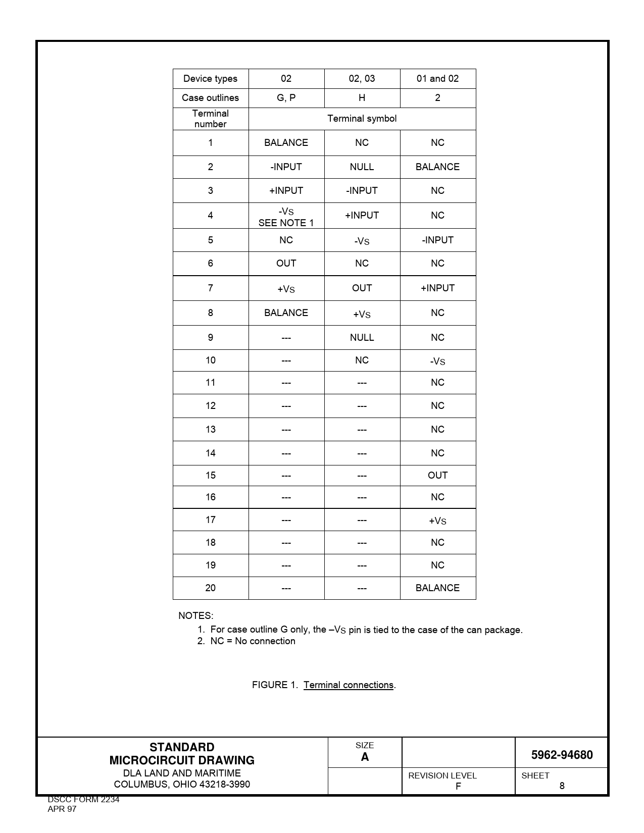Device types 02 02, 03 01 and 02 Case outlines G, P H 2 Terminal Terminal symbol number 1 BALANCE NC NC 2 -INPUT NULL BALANCE 3 +INPUT -INPUT NC 4 -VS +INPUT NC SEE NOTE 1 5 NC -VS -INPUT 6 OUT NC NC 7 +VS OUT +INPUT 8 BALANCE +VS NC 9 --- NULL NC 10 --- NC -VS 11 --- --- NC 12 --- --- NC 13 --- --- NC 14 --- --- NC 15 --- --- OUT 16 --- --- NC 17 --- --- +VS 18 --- --- NC 19 --- --- NC 20 --- --- BALANCE NOTES: 1. For case outline G only, the –VS pin is tied to the case of the can package. 2. NC = No connection FIGURE 1. Terminal connections.