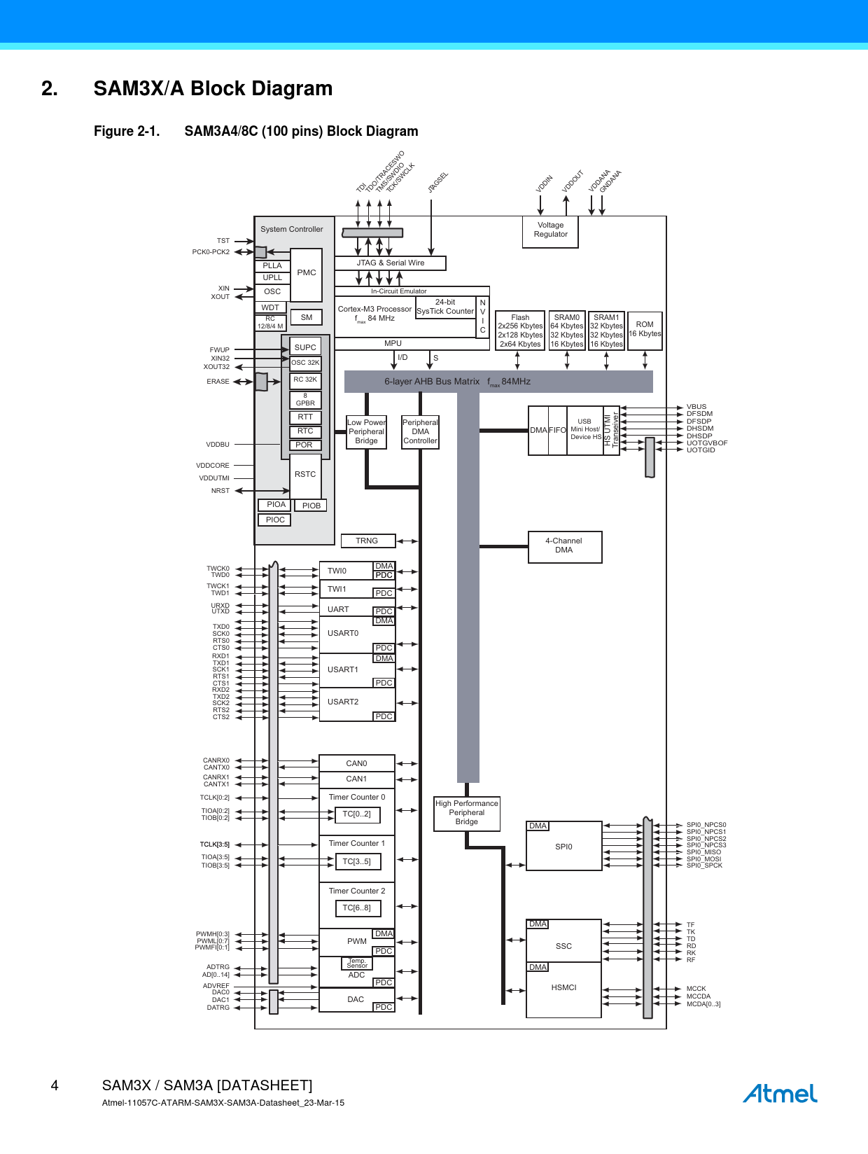 SAM3X/A Block Diagram. Figure 2-1. SAM3A4/8C (100 pins) Block Diagram