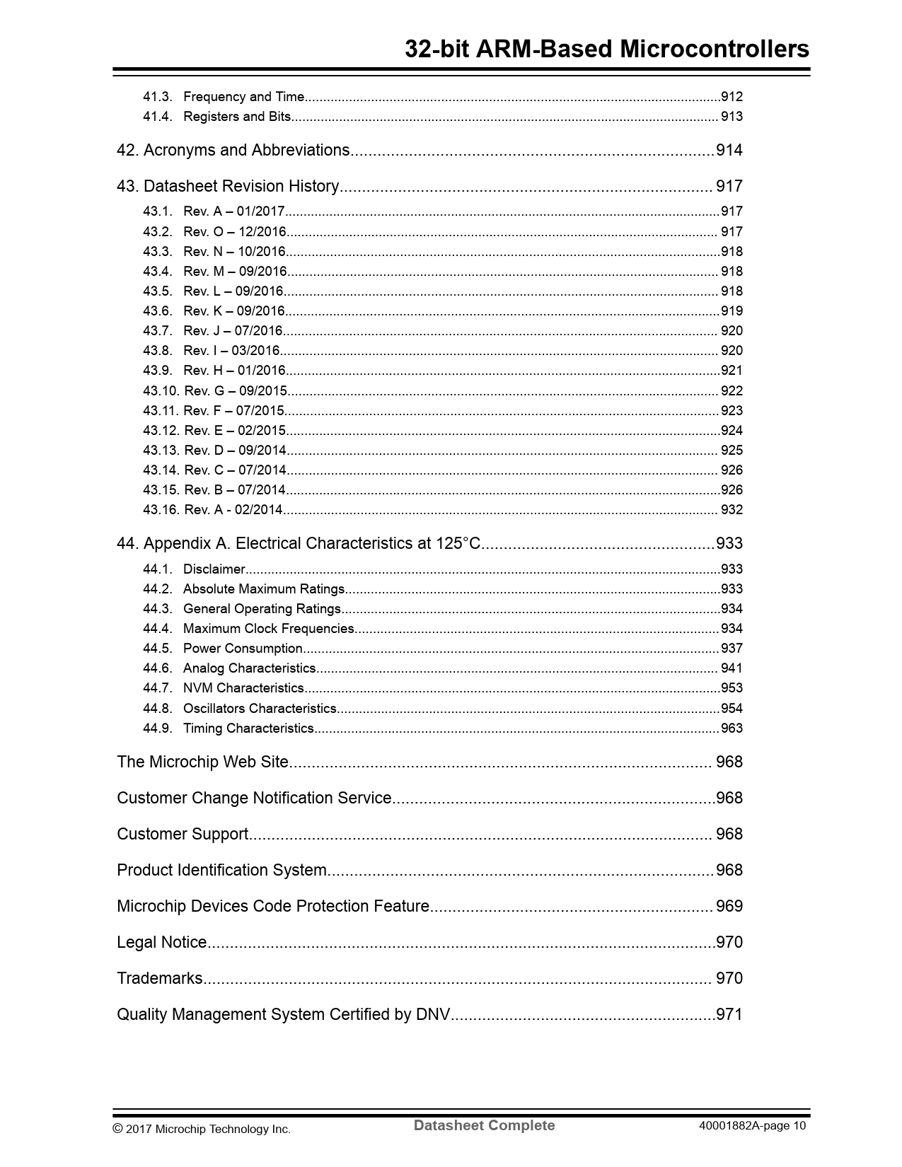 41.3. Frequency and Time...912 41.4. Registers and Bits.. 913 42. Acronyms and Abbreviations...914 43. Datasheet Revision History... 917 43.1. Rev. A – 01/2017..917 43.2. Rev. O – 12/2016... 917 43.3. Rev. N – 10/2016..918 43.4. Rev. M – 09/2016... 918 43.5. Rev. L – 09/2016.. 918 43.6. Rev. K – 09/2016..919 43.7. Rev. J – 07/2016.. 920 43.8. Rev. I – 03/2016... 920 43.9. Rev. H – 01/2016..921 43.10. Rev. G – 09/2015... 922 43.11. Rev. F – 07/2015.. 923 43.12. Rev. E – 02/2015..924 43.13. Rev. D – 09/2014... 925 43.14. Rev. C – 07/2014... 926 43.15. Rev. B – 07/2014..926 43.16. Rev. A - 02/2014.. 932 44. Appendix A. Electrical Characteristics at 125°C..933 44.1. Disclaimer...933 44.2. Absolute Maximum Ratings..933 44.3. General Operating Ratings...934 44.4. Maximum Clock Frequencies... 934 44.5. Power Consumption... 937 44.6. Analog Characteristics... 941 44.7. NVM Characteristics...953 44.8. Oscillators Characteristics..954 44.9. Timing Characteristics..963 The Microchip Web Site.. 968 Customer Change Notification Service..968 Customer Support... 968 Product Identification System..968 Microchip Devices Code Protection Feature... 969 Legal Notice...970 Trademarks... 970 Quality Management System Certified by DNV...971 © 2017 Microchip Technology Inc.