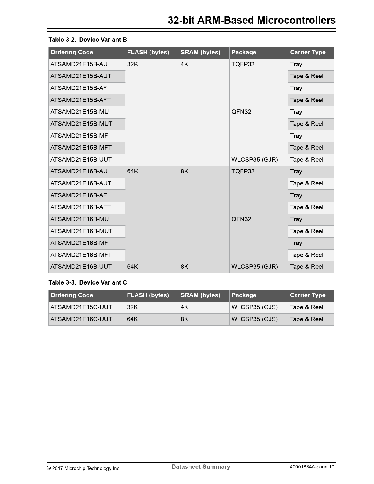 32-bit ARM-Based Microcontrollers. Table 3-2. Device Variant B. Ordering Code. FLASH (bytes). SRAM (bytes). Package. Carrier Type