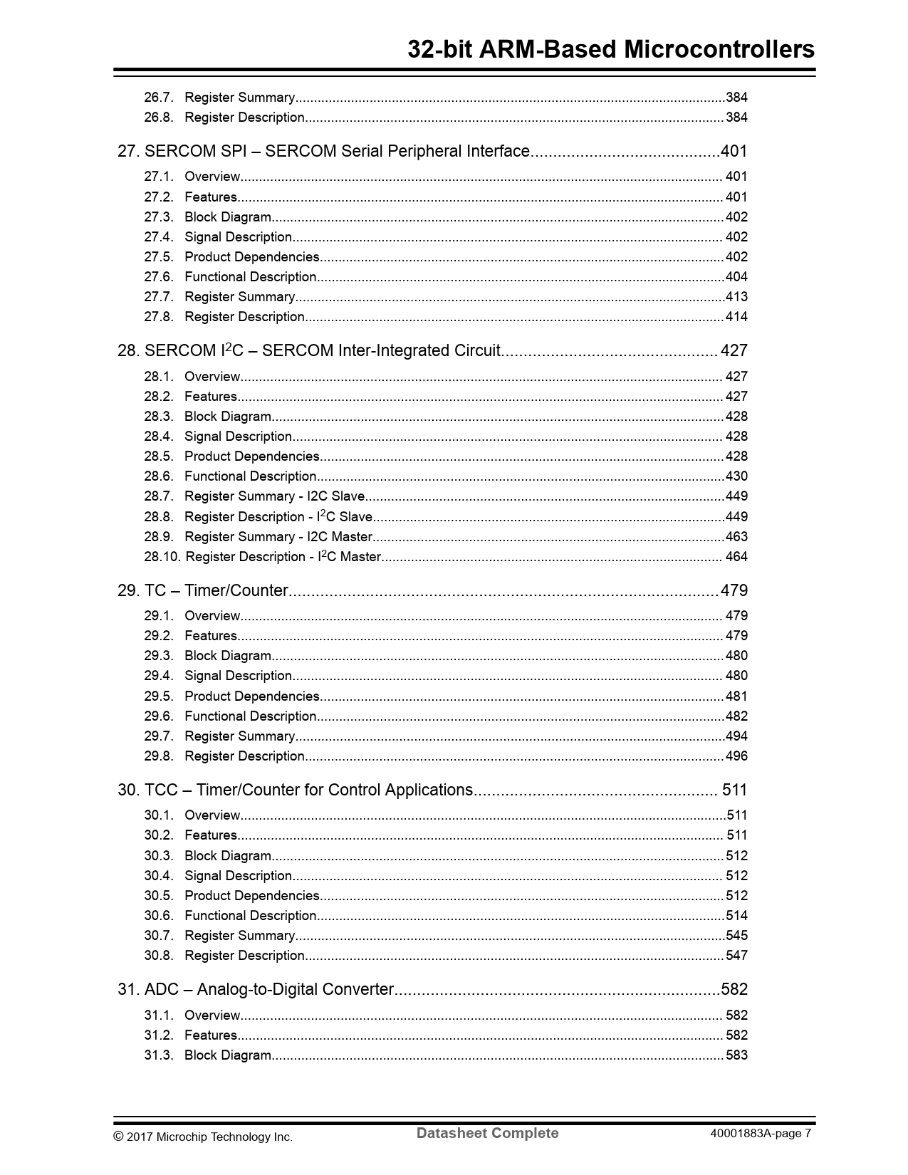 26.7. Register Summary..384 26.8. Register Description... 384 27. SERCOM SPI – SERCOM Serial Peripheral Interface..401 27.1. Overview.. 401 27.2. Features... 401 27.3. Block Diagram.. 402 27.4. Signal Description.. 402 27.5. Product Dependencies... 402 27.6. Functional Description..404 27.7. Register Summary..413 27.8. Register Description... 414 28. SERCOM I2C – SERCOM Inter-Integrated Circuit.. 427 28.1. Overview.. 427 28.2. Features... 427 28.3. Block Diagram.. 428 28.4. Signal Description.. 428 28.5. Product Dependencies... 428 28.6. Functional Description..430 28.7. Register Summary - I2C Slave...449 28.8. Register Description - I2C Slave...449 28.9. Register Summary - I2C Master...463 28.10. Register Description - I2C Master.. 464 29. TC – Timer/Counter...479 29.1. Overview.. 479 29.2. Features... 479 29.3. Block Diagram.. 480 29.4. Signal Description.. 480 29.5. Product Dependencies... 481 29.6. Functional Description..482 29.7. Register Summary..494 29.8. Register Description... 496 30. TCC – Timer/Counter for Control Applications.. 511 30.1. Overview...511 30.2. Features... 511 30.3. Block Diagram.. 512 30.4. Signal Description.. 512 30.5. Product Dependencies... 512 30.6. Functional Description..514 30.7. Register Summary..545 30.8. Register Description... 547 31. ADC – Analog-to-Digital Converter..582 31.1. Overview.. 582 31.2. Features... 582 31.3. Block Diagram.. 583 © 2017 Microchip Technology Inc.