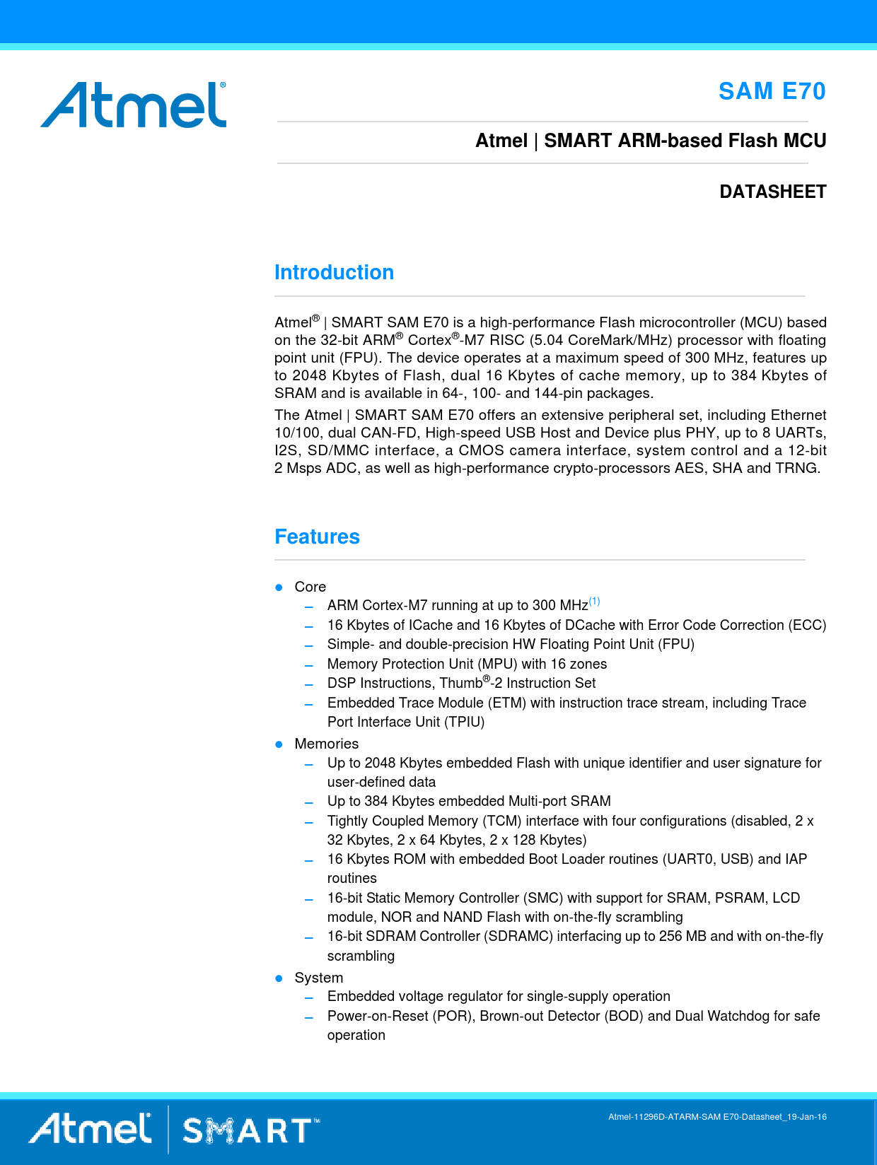 SAM E70. Atmel | SMART ARM-based Flash MCU. DATASHEET. Introduction. Features