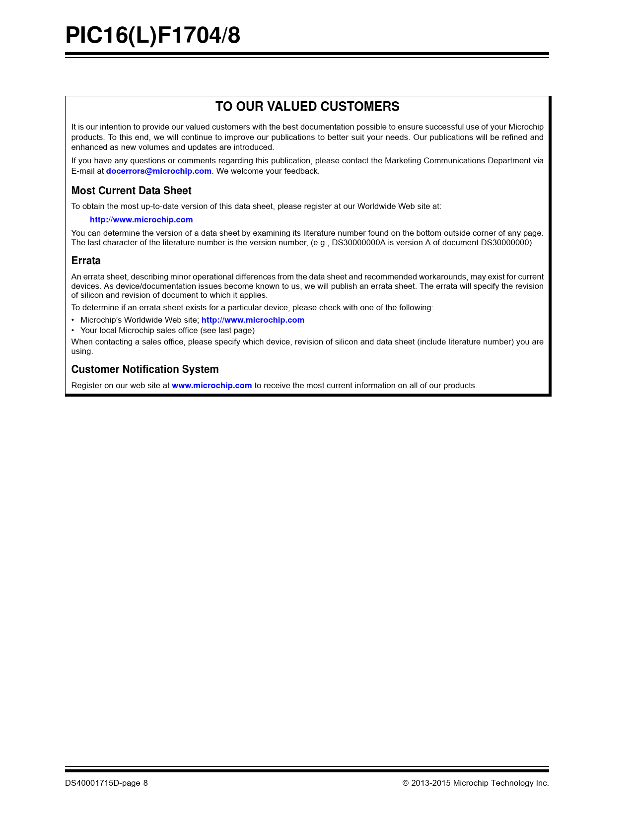 PIC16(L)F1704/8. TO OUR VALUED CUSTOMERS. docerrors@microchip.com. Most Current Data Sheet. http://www.microchip.com. Errata