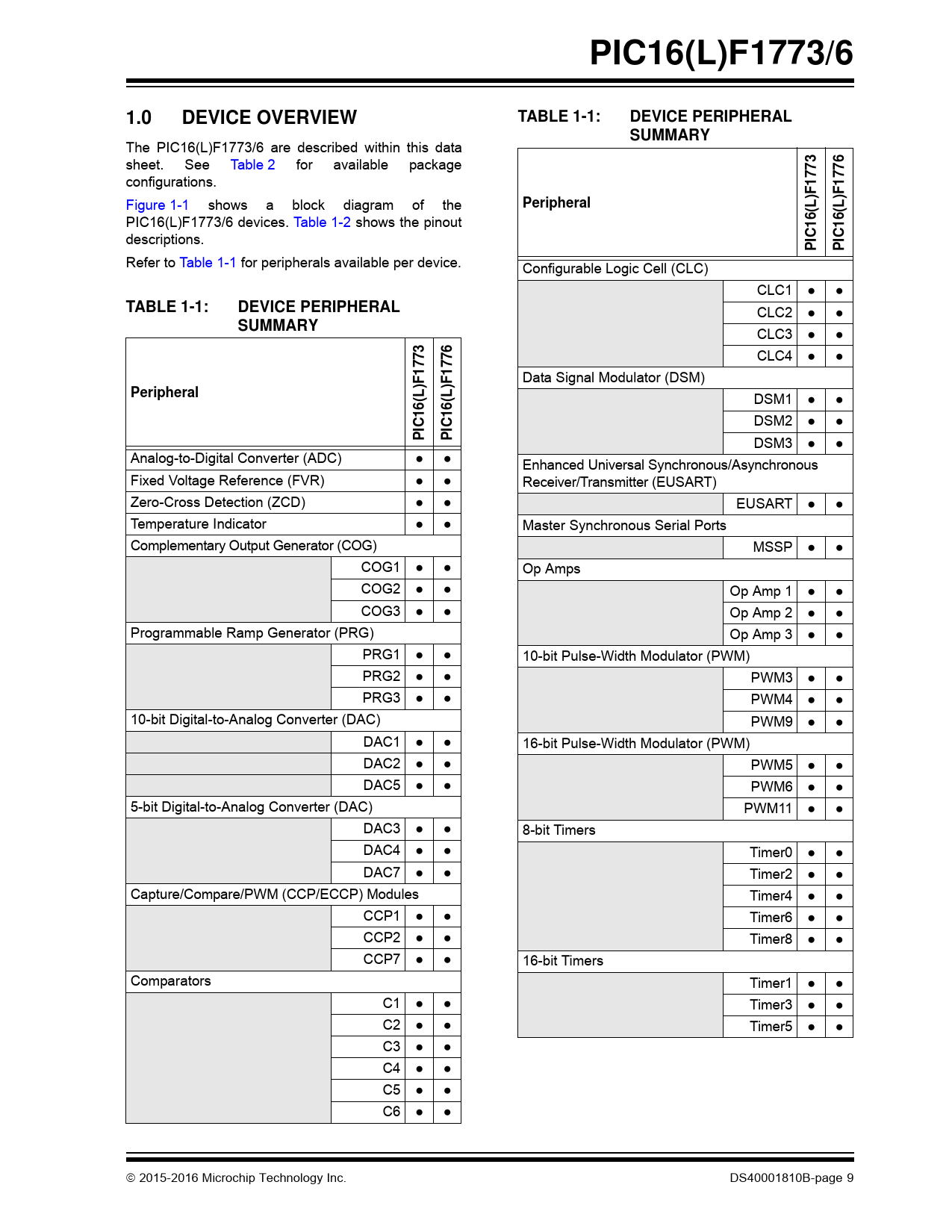 | Pages / Page | 578 / 9 — PIC16(L)F1773/6. 1.0. DEVICE OVERVIEW. TABLE 1-1:. DEVICE PERIPHERAL … |