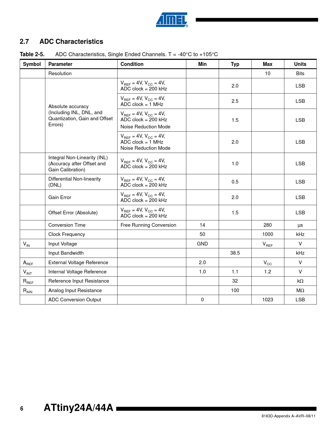 2.7. ADC Characteristics. Table 2-5. Symbol. Parameter. Condition. Min. Typ. Max. Units. ATtiny24A/44A