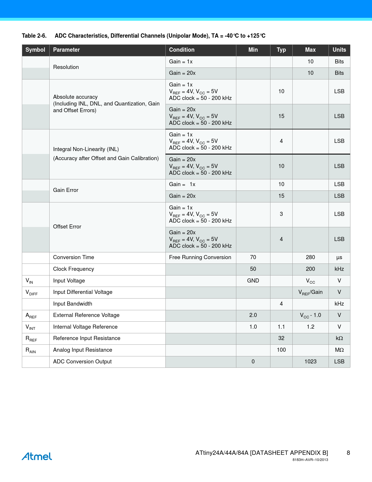 Table 2-6. ADC Characteristics, Differential Channels (Unipolar Mode), TA = -40°C to +125°C. Symbol. Parameter. Condition. Min. Typ
