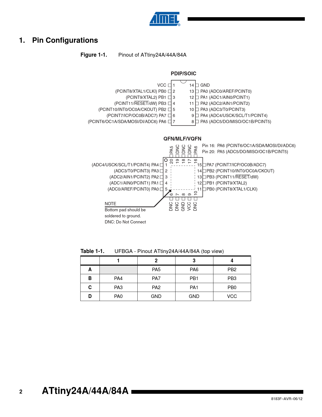 Pin Configurations. Figure 1-1. PDIP/SOIC. QFN/MLF/VQFN. Table 1-1. ATtiny24A/44A/84A