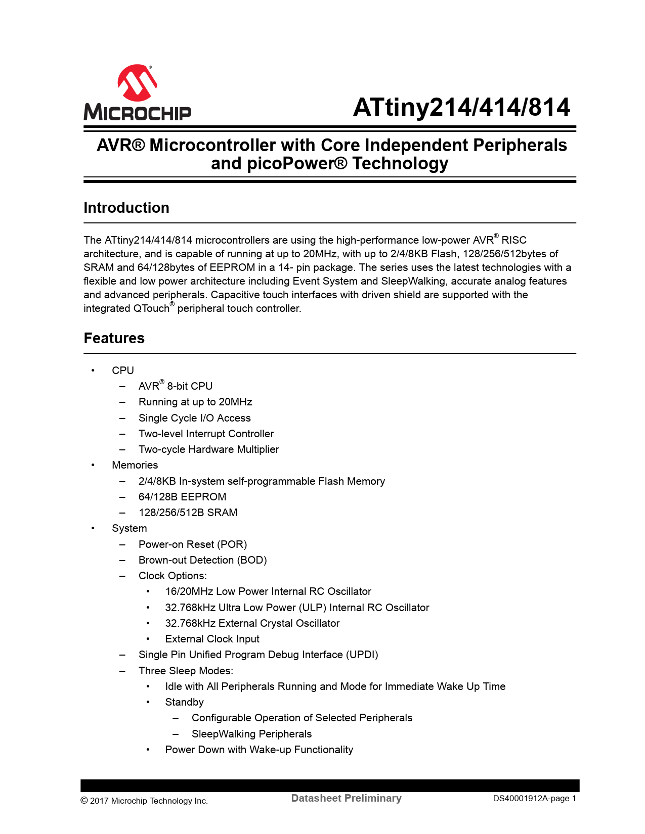 ATtiny214/414/814. AVR® Microcontroller with Core Independent Peripherals. and picoPower® Technology. Introduction. Features