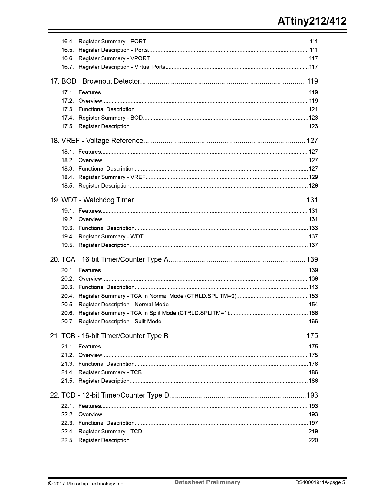 16.4. Register Summary - PORT... 111 16.5. Register Description - Ports..111 16.6. Register Summary - VPORT.. 117 16.7. Register Description - Virtual Ports...117 17. BOD - Brownout Detector.. 119 17.1. Features... 119 17.2. Overview...119 17.3. Functional Description..121 17.4. Register Summary - BOD...123 17.5. Register Description... 123 18. VREF - Voltage Reference.. 127 18.1. Features... 127 18.2. Overview.. 127 18.3. Functional Description..127 18.4. Register Summary - VREF...129 18.5. Register Description... 129 19. WDT - Watchdog Timer... 131 19.1. Features... 131 19.2. Overview.. 131 19.3. Functional Description..133 19.4. Register Summary - WDT.. 137 19.5. Register Description... 137 20. TCA - 16-bit Timer/Counter Type A... 139 20.1. Features... 139 20.2. Overview.. 139 20.3. Functional Description..143 20.4. Register Summary - TCA in Normal Mode (CTRLD.SPLITM=0)... 153 20.5. Register Description - Normal Mode.. 154 20.6. Register Summary - TCA in Split Mode (CTRLD.SPLITM=1)..166 20.7. Register Description - Split Mode...166 21. TCB - 16-bit Timer/Counter Type B... 175 21.1. Features... 175 21.2. Overview.. 175 21.3. Functional Description..178 21.4. Register Summary - TCB... 186 21.5. Register Description... 186 22. TCD - 12-bit Timer/Counter Type D...193 22.1. Features... 193 22.2. Overview.. 193 22.3. Functional Description..197 22.4. Register Summary - TCD... 219 22.5. Register Description... 220 © 2017 Microchip Technology Inc.
