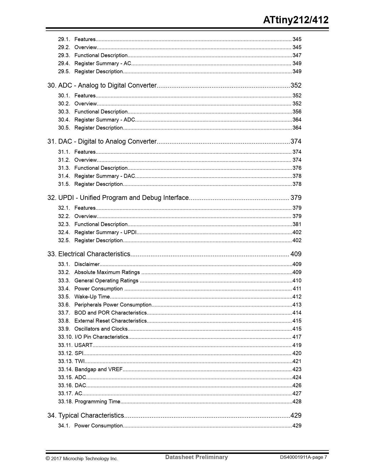 29.1. Features... 345 29.2. Overview.. 345 29.3. Functional Description..347 29.4. Register Summary - AC... 349 29.5. Register Description... 349 30. ADC - Analog to Digital Converter...352 30.1. Features... 352 30.2. Overview.. 352 30.3. Functional Description..356 30.4. Register Summary - ADC...364 30.5. Register Description... 364 31. DAC - Digital to Analog Converter...374 31.1. Features... 374 31.2. Overview.. 374 31.3. Functional Description..376 31.4. Register Summary - DAC...378 31.5. Register Description... 378 32. UPDI - Unified Program and Debug Interface... 379 32.1. Features... 379 32.2. Overview.. 379 32.3. Functional Description..381 32.4. Register Summary - UPDI..402 32.5. Register Description... 402 33. Electrical Characteristics... 409 33.1. Disclaimer...409 33.2. Absolute Maximum Ratings ...409 33.3. General Operating Ratings ..410 33.4. Power Consumption .. 411 33.5. Wake-Up Time..412 33.6. Peripherals Power Consumption..413 33.7. BOD and POR Characteristics... 414 33.8. External Reset Characteristics... 415 33.9. Oscillators and Clocks..415 33.10. I/O Pin Characteristics... 417 33.11. USART... 419 33.12. SPI... 420 33.13. TWI...421 33.14. Bandgap and VREF... 423 33.15. ADC..424 33.16. DAC..426 33.17. AC.. 427 33.18. Programming Time...428 34. Typical Characteristics...429 34.1. Power Consumption... 429 © 2017 Microchip Technology Inc.