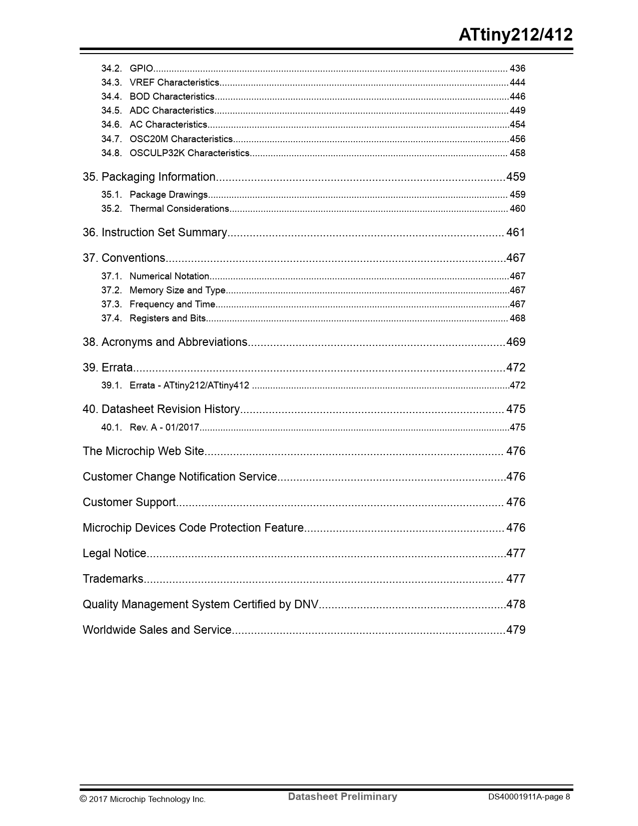 34.2. GPIO.. 436 34.3. VREF Characteristics... 444 34.4. BOD Characteristics...446 34.5. ADC Characteristics... 449 34.6. AC Characteristics..454 34.7. OSC20M Characteristics..456 34.8. OSCULP32K Characteristics... 458 35. Packaging Information...459 35.1. Package Drawings... 459 35.2. Thermal Considerations... 460 36. Instruction Set Summary... 461 37. Conventions...467 37.1. Numerical Notation...467 37.2. Memory Size and Type...467 37.3. Frequency and Time...467 37.4. Registers and Bits.. 468 38. Acronyms and Abbreviations...469 39. Errata...472 39.1. Errata - ATtiny212/ATtiny412 ...472 40. Datasheet Revision History... 475 40.1. Rev. A - 01/2017...475 The Microchip Web Site.. 476 Customer Change Notification Service..476 Customer Support... 476 Microchip Devices Code Protection Feature... 476 Legal Notice...477 Trademarks... 477 Quality Management System Certified by DNV...478 Worldwide Sales and Service..479 © 2017 Microchip Technology Inc.