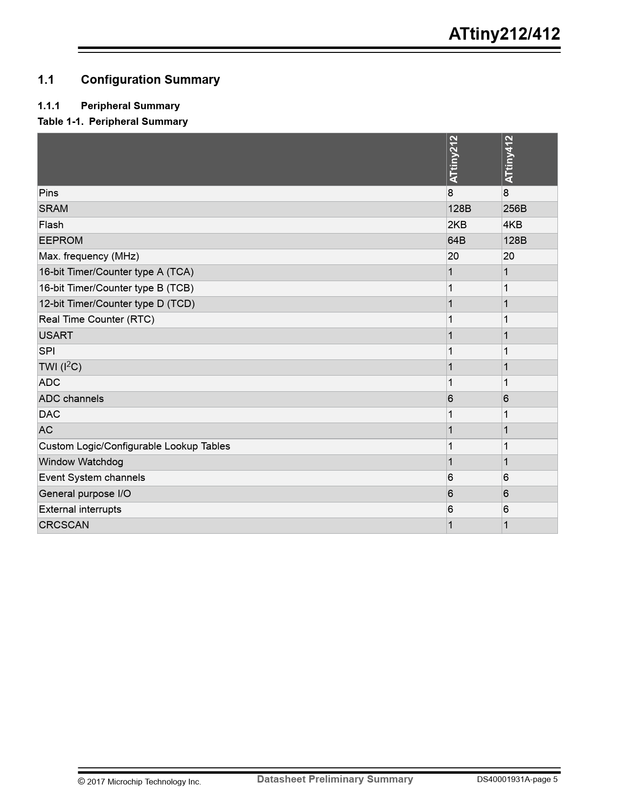 ATtiny212/412. 1.1. Configuration Summary. 1.1.1. Peripheral Summary. Table 1-1. Peripheral Summary. Ttiny212. Ttiny412