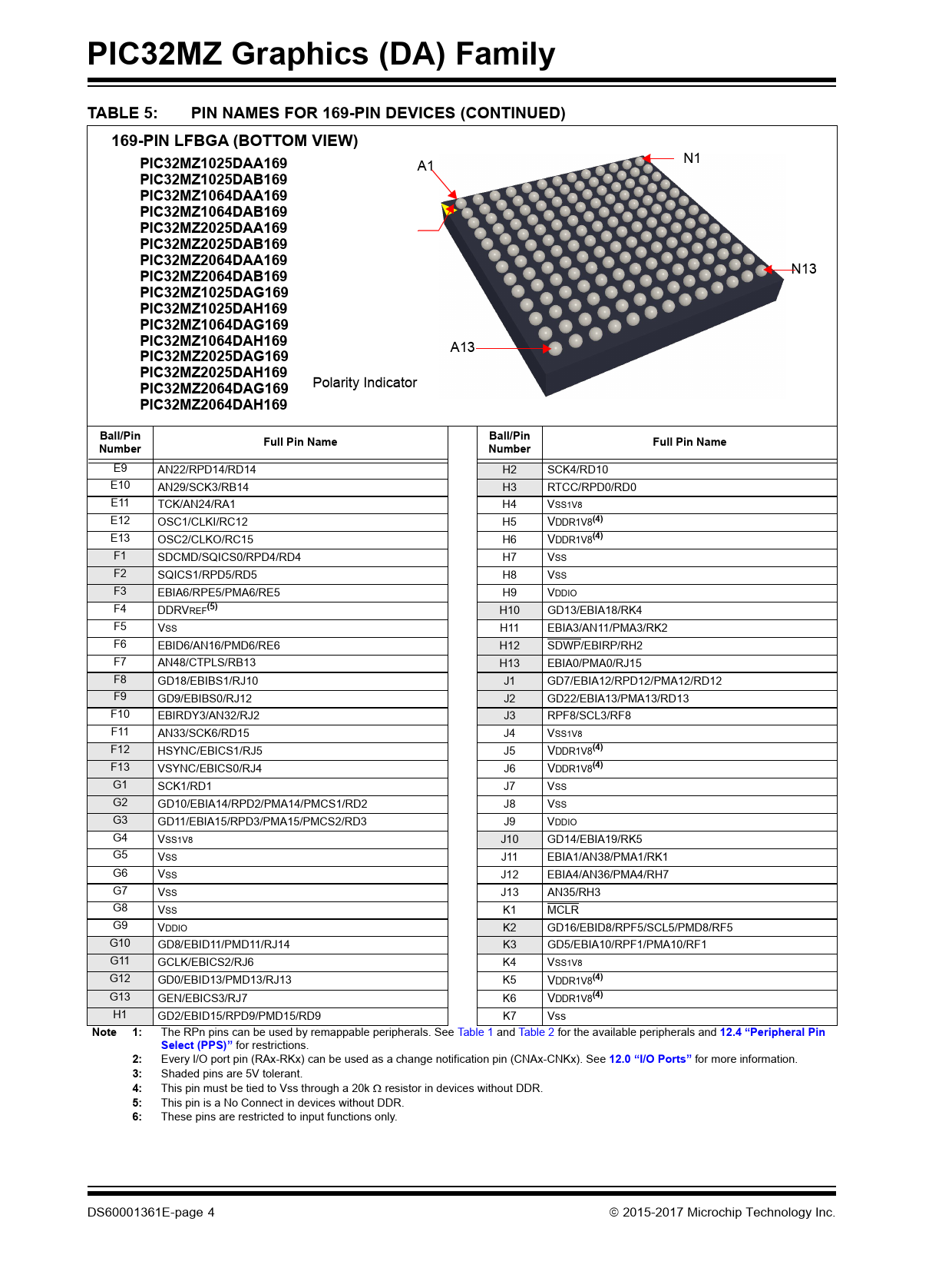 | Pages / Page | 808 / 4 — PIC32MZ Graphics (DA) Family. TABLE 5:. PIN NAMES FOR 169-PIN DEVICES … |