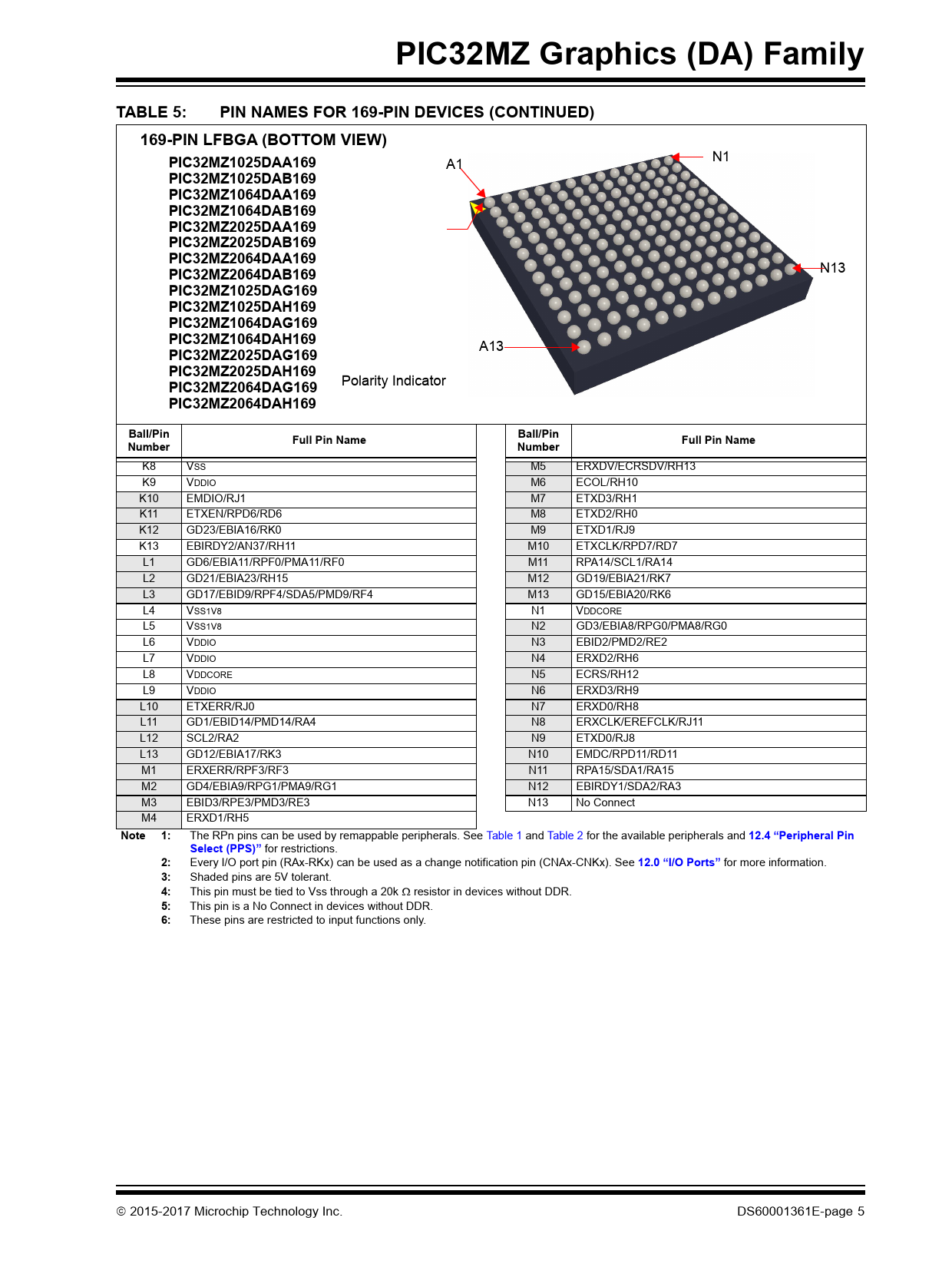 PIC32MZ Graphics (DA) Family. TABLE 5:. PIN NAMES FOR 169-PIN DEVICES (CONTINUED). 169-PIN LFBGA (BOTTOM VIEW)