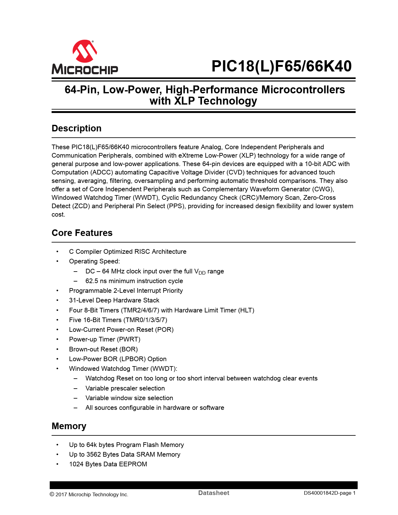 PIC18(L)F65/66K40. 64-Pin, Low-Power, High-Performance Microcontrollers. with XLP Technology. Description. Core Features. Memory