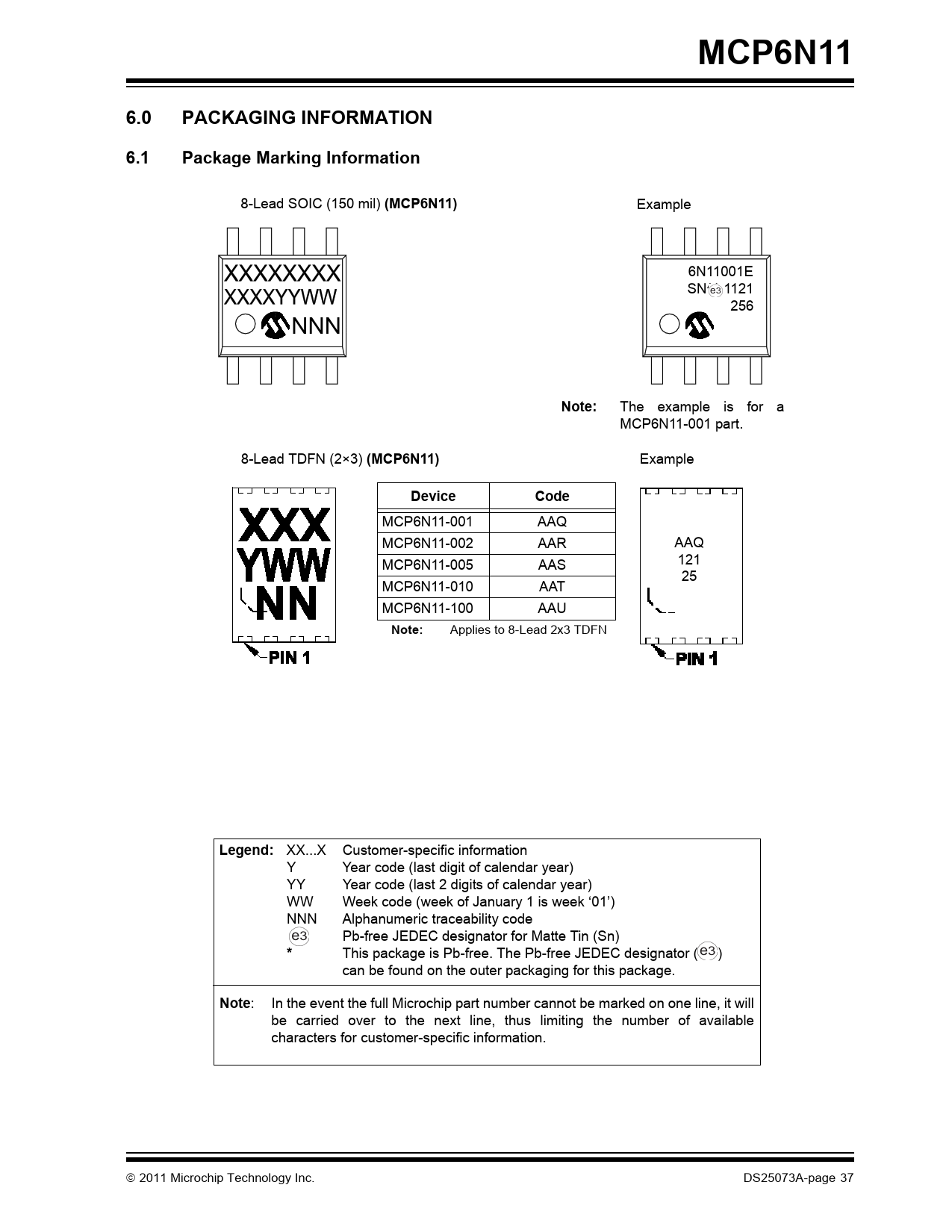 MCP6N11. 6.0. PACKAGING INFORMATION. 6.1. Package Marking Information. (MCP6N11). Note:. Device. Code. Legend:. Note