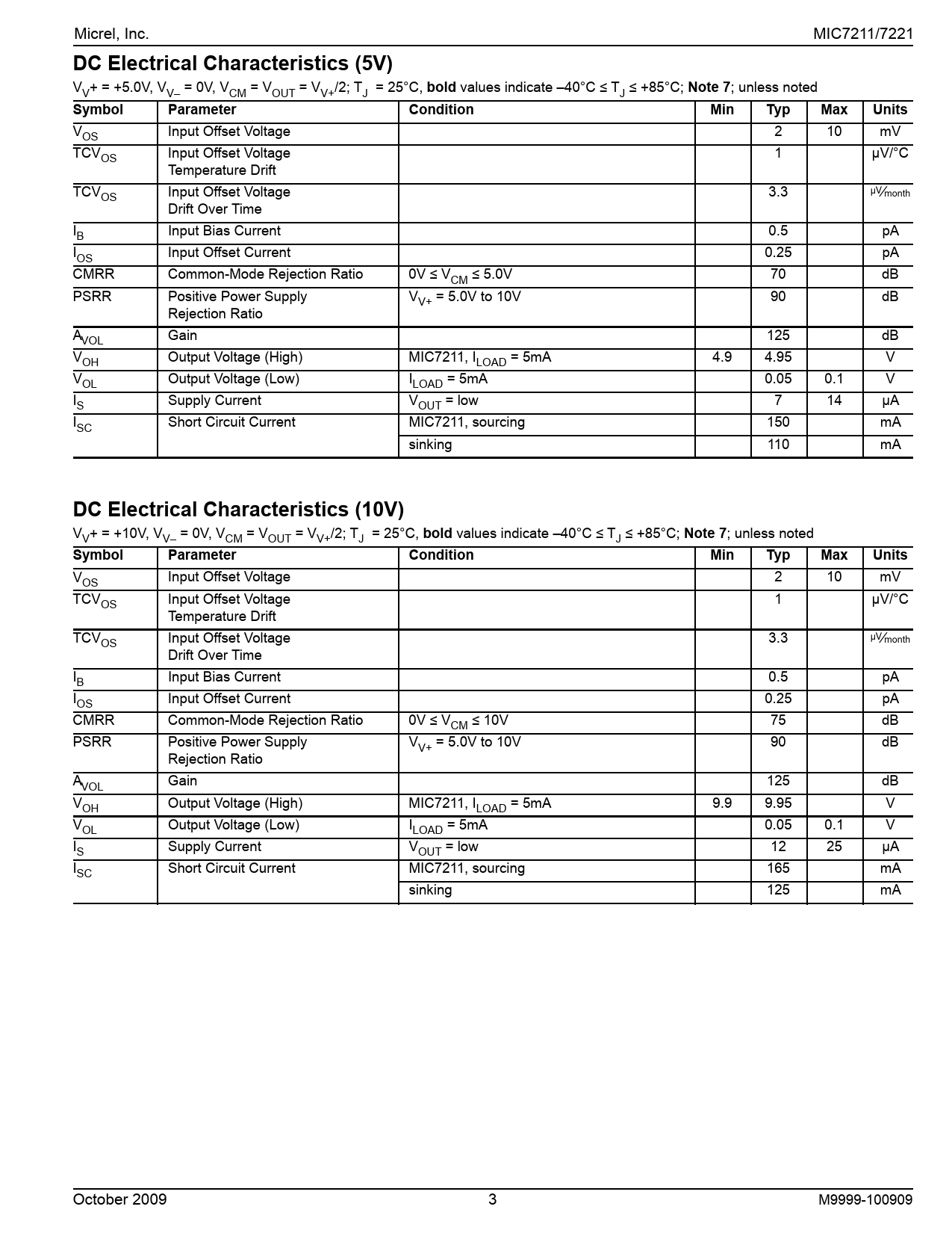 Micrel, Inc. MIC7211/7221 DC Electrical Characteristics (5V) VV+ = +5.0V, VV– = 0V, VCM = VOUT = VV+/2; TJ = 25°C, bold values indicate –40°C ≤ TJ ≤ +85°C; Note 7; unless noted Symbol Parameter VOS Input Offset Voltage Condition Min Typ Max Units 2 10 mV TCVOS Input Offset Voltage 1 Temperature Drift µV/°C TCVOS Input Offset Voltage 3.3 Drift Over Time µV⁄month IB Input Bias Current 0.5 pA IOS Input Offset Current 0.25 pA CMRR Common-Mode Rejection Ratio 70 dB PSRR Positive Power Supply Rejection Ratio 0V ≤ VCM ≤ 5.0V VV+ = 5.0V to 10V 90 dB AVOL Gain 125 dB VOL Output Voltage (Low) VOH Output Voltage (High) IS Supply Current ISC Short Circuit Current MIC7211, ILOAD = 5mA 4.95 V ILOAD = 5mA 4.9 0.05 0.1 V 7 14 MIC7211, sourcing 150 mA sinking 110 mA VOUT = low µA DC Electrical Characteristics (10V) VV+ = +10V, VV– = 0V, VCM = VOUT = VV+/2; TJ = 25°C, bold values indicate –40°C ≤ TJ ≤ +85°C; Note 7; unless noted Symbol Parameter Condition Min Typ Max 2 10 Units VOS Input Offset Voltage TCVOS Input Offset Voltage 1 Temperature Drift µV/°C TCVOS Input Offset Voltage 3.3 Drift Over Time µV⁄month IB mV Input Bias Current 0.5 pA IOS Input Offset Current 0.25 pA CMRR Common-Mode Rejection Ratio dB Positive Power Supply Rejection Ratio 0V ≤ VCM ≤ 10V 75 PSRR 90 dB AVOL VV+ = 5.0V to 10V Gain 125 dB VOH Output Voltage (High) 9.95 V IS Supply Current VOL ISC Output Voltage (Low) Short Circuit Current October 2009 MIC7211, ILOAD = 5mA 9.9 ILOAD = 5mA VOUT = low 0.05 0.1 V 12 25 µA MIC7211, sourcing 165 mA sinking 125 mA 3 M9999-100909