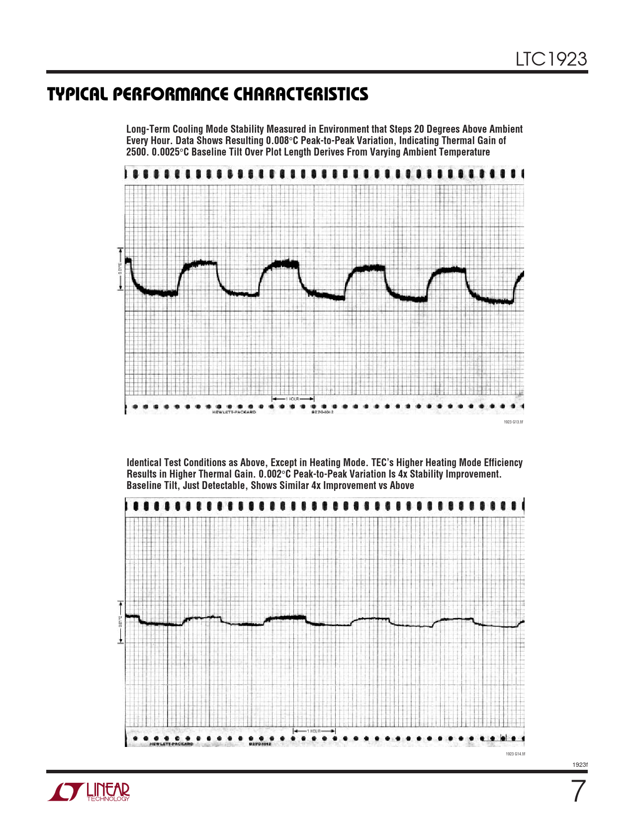 LTC1923 WUTYPICAL PERFOR A CE CHARACTERISTICSLong-Term Cooling Mode Stability Measured in Environment that Steps 20 Degrees Above Ambient Every Hour. Data Shows Resulting 0.008 ° C Peak-to-Peak Variation, Indicating Thermal Gain of 2500. 0.0025 ° C Baseline Tilt Over Plot Length Derives From Varying Ambient Temperature 1923 G13.tif Identical Test Conditions as Above, Except in Heating Mode. TEC’s Higher Heating Mode Efficiency Results in Higher Thermal Gain. 0.002 ° C Peak-to-Peak Variation Is 4x Stability Improvement. Baseline Tilt, Just Detectable, Shows Similar 4x Improvement vs Above 1923 G14.tif 1923f 7