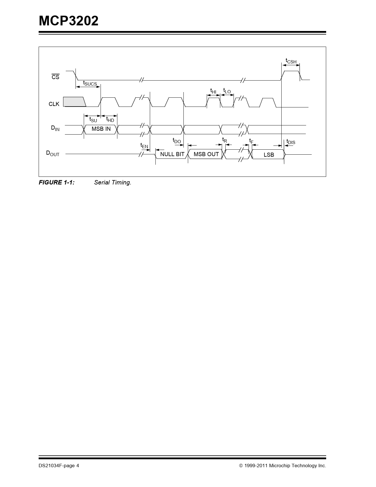MCP3202 tCSH CS tSUCS tHI tLO CLK tSU tHD DIN MSB IN tDO tR t t t F DIS EN DOUT NULL BIT MSB OUT LSB FIGURE 1-1: Serial Timing. DS21034F-page 4 1999-2011 Microchip Technology Inc. Document Outline MCP3202 - 2.7V Dual Channel 12-Bit A/D Converter with SPI Serial Interface Functional Block Diagram Package Types 1.0 Electrical Characteristics Absolute Maximum Ratings † FIGURE 1-1: Serial Timing. FIGURE 1-2: Test Circuits. 2.0 Typical Performance Characteristics FIGURE 2-1: Integral Nonlinearity (INL) vs. Sample Rate. FIGURE 2-2: Integral Nonlinearity (INL) vs. VDD. FIGURE 2-3: Integral Nonlinearity (INL) vs. Code (Representative Part). FIGURE 2-4: Integral Nonlinearity (INL) vs. Sample Rate (VDD = 2.7V). FIGURE 2-5: Integral Nonlinearity (INL) vs. VDD. FIGURE 2-6: Integral Nonlinearity (INL) vs. Code (Representative Part, VDD = 2.7V). FIGURE 2-7: Integral Nonlinearity (INL) vs. Temperature. FIGURE 2-8: Differential Nonlinearity (DNL) vs. Sample Rate. FIGURE 2-9: Differential Nonlinearity (DNL) vs. VDD. FIGURE 2-10: Integral Nonlinearity (INL) vs. Temperature (VDD = 2.7V). FIGURE 2-11: Differential Nonlinearity (DNL) vs. Sample Rate (VDD = 2.7V). FIGURE 2-12: Differential Nonlinearity (DNL) vs. VDD. FIGURE 2-13: Differential Nonlinearity (DNL) vs. Code (Representative Part). FIGURE 2-14: Differential Nonlinearity (DNL) vs. Temperature. FIGURE 2-15: Gain Error vs. VDD. FIGURE 2-16: Differential Nonlinearity (DNL) vs. Code (Representative Part, VDD = 2.7V). FIGURE 2-17: Differential Nonlinearity (DNL) vs. Temperature (VDD = 2.7V). FIGURE 2-18: Offset Error vs. VDD. FIGURE 2-19: Gain Error vs. Temperature. FIGURE 2-20: Signal-to-Noise Ratio (SNR) vs. Input Frequency. FIGURE 2-21: Total Harmonic Distortion (THD) vs. Input Frequency. FIGURE 2-22: Offset Error vs. Temperature. FIGURE 2-23: Signal-to-Noise and Distortion (SINAD) vs. Input Frequency. FIGURE 2-24: Signal-to-Noise and Distortion (SINAD) vs. Signal Level. FIGURE 2-25: Effective Number of Bits (ENOB) vs. VDD. FIGURE 2-26: Spurious Free Dynamic Range (SFDR) vs. Input Frequency. FIGURE 2-27: Frequency Spectrum of 10 kHz input (Representative Part). FIGURE 2-28: Effective Number of Bits (ENOB) vs. Input Frequency. FIGURE 2-29: Power Supply Rejection (PSR) vs. Ripple Frequency. FIGURE 2-30: Frequency Spectrum of 1 kHz input (Representative Part, VDD = 2.7V). FIGURE 2-31: IDD vs. VDD. FIGURE 2-32: IDD vs. Clock Frequency. FIGURE 2-33: IDD vs. Temperature. FIGURE 2-34: IDDS vs. VDD. FIGURE 2-35: IDDS vs. Temperature. FIGURE 2-36: Analog Input leakage current vs. Temperature. 3.0 Pin Descriptions TABLE 3-1: Pin Function Table 3.1 Analog Inputs (CH0/CH1) 3.2 Chip Select/Shutdown (CS/SHDN) 3.3 Serial Clock (CLK) 3.4 Serial Data Input (DIN) 3.5 Serial Data Output (DOUT) 4.0 Device Operation 4.1 Analog Inputs 4.2 Digital Output Code EQUATION 4-1: FIGURE 4-1: Analog Input Model. FIGURE 4-2: Maximum Clock Frequency vs. Input Resistance (RS) to maintain less than a 0.1 LSB deviation in INL from nominal conditions. 5.0 Serial Communications 5.1 Overview TABLE 5-1: Configuration Bits for the MCP3202 FIGURE 5-1: Communication with the MCP3202 using MSB first format only. FIGURE 5-2: Communication with MCP3202 using LSB first format. 6.0 Applications Information 6.1 Using the MCP3202 with Microcontroller (MCU) SPI Ports FIGURE 6-1: SPI Communication using 8-bit segments (Mode 0,0: SCLK idles low). FIGURE 6-2: SPI Communication using 8-bit segments (Mode 1,1: SCLK idles high). 6.2 Maintaining Minimum Clock Speed 6.3 Buffering/Filtering the Analog Inputs FIGURE 6-3: The MCP601 Operational Amplifier is used to implement a 2nd order anti- aliasing filter for the signal being converted by the MCP3202. 6.4 Layout Considerations FIGURE 6-4: VDD traces arranged in a ‘Star’ configuration in order to reduce errors caused by current return paths. 7.0 Packaging Information 7.1 Package Marking Information Appendix A: Revision History Worldwide Sales and Service
