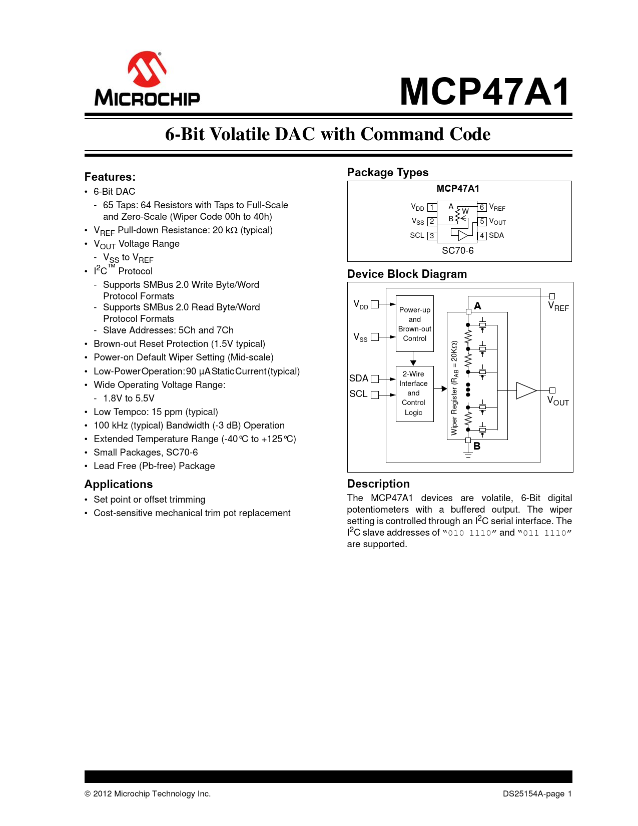 | Pages / Page | 70 / 1 — MCP47A1. 6-Bit Volatile DAC with Command Code. Features:. Package Types. … |