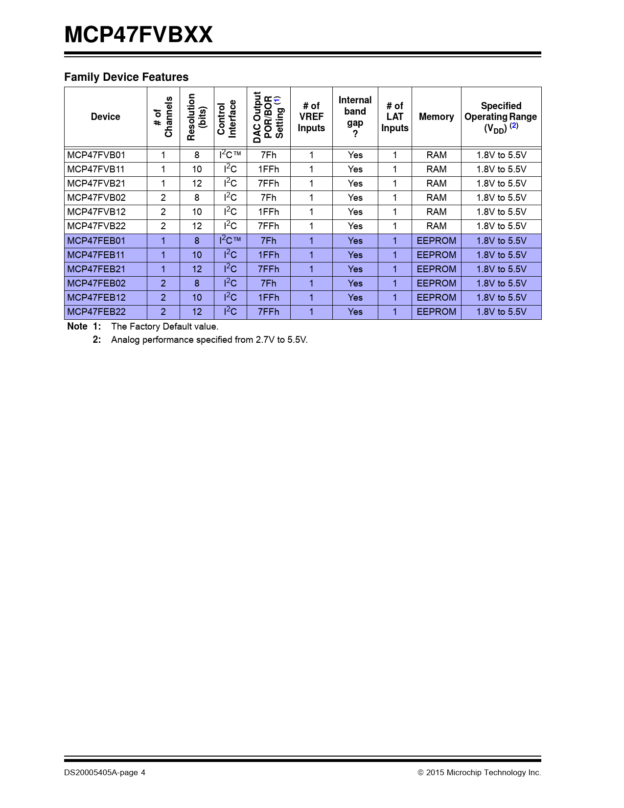 | Pages / Page | 92 / 4 — MCP47FVBXX. Family Device Features. Internal. # of. Specified. band. … |
