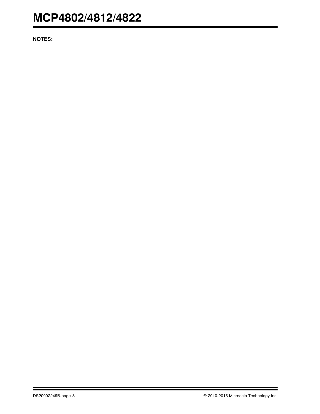 MCP4802/4812/4822NOTES: DS20002249B-page 8 2010-2015 Microchip Technology Inc. Document Outline 1.0 Electrical Characteristics FIGURE 1-1: SPI Input Timing Data. 2.0 Typical Performance Curves FIGURE 2-1: DNL vs. Code (MCP4822). FIGURE 2-2: DNL vs. Code and Temperature (MCP4822). FIGURE 2-3: Absolute DNL vs. Temperature (MCP4822). FIGURE 2-4: INL vs. Code and Temperature (MCP4822). FIGURE 2-5: Absolute INL vs. Temperature (MCP4822). FIGURE 2-6: INL vs. Code (MCP4822). FIGURE 2-7: DNL vs. Code and Temperature (MCP4812). FIGURE 2-8: INL vs. Code and Temperature (MCP4812). FIGURE 2-9: DNL vs. Code and Temperature (MCP4802). FIGURE 2-10: INL vs. Code and Temperature (MCP4802). FIGURE 2-11: Full-Scale VOUTA vs. Ambient Temperature and VDD. Gain = 1x. FIGURE 2-12: Full-Scale VOUTA vs. Ambient Temperature and VDD. Gain = 2x. FIGURE 2-13: Output Noise Voltage Density (VREF Noise Density) vs. Frequency. Gain = 1x. FIGURE 2-14: Output Noise Voltage (VREF Noise Voltage) vs. Bandwidth. Gain = 1x. FIGURE 2-15: IDD vs. Temperature and VDD. FIGURE 2-16: IDD Histogram (VDD = 2.7V). FIGURE 2-17: IDD Histogram (VDD = 5.0V). FIGURE 2-18: Software Shutdown Current vs. Temperature and VDD. FIGURE 2-19: Offset Error vs. Temperature and VDD. FIGURE 2-20: Gain Error vs. Temperature and VDD. FIGURE 2-21: VIN High Threshold vs. Temperature and VDD. FIGURE 2-22: VIN Low Threshold vs. Temperature and VDD. FIGURE 2-23: Input Hysteresis vs. Temperature and VDD. FIGURE 2-24: VOUT High Limit vs.Temperature and VDD. FIGURE 2-25: VOUT Low Limit vs. Temperature and VDD. FIGURE 2-26: IOUT High Short vs. Temperature and VDD. FIGURE 2-27: IOUT vs. VOUT. Gain = 2x. FIGURE 2-28: VOUT Rise Time. FIGURE 2-29: VOUT Fall Time. FIGURE 2-30: VOUT Rise Time. FIGURE 2-31: VOUT Rise Time. FIGURE 2-32: VOUT Rise Time Exit Shutdown. FIGURE 2-33: PSRR vs. Frequency. 3.0 Pin descriptions TABLE 3-1: Pin Function Table for MCP4802/4812/4822 3.1 Supply Voltage Pins (VDD, VSS) 3.2 Chip Select (CS) 3.3 Serial Clock Input (SCK) 3.4 Serial Data Input (SDI) 3.5 Latch DAC Input (LDAC) 3.6 Analog Outputs (VOUTA, VOUTB) 4.0 General Overview TABLE 4-1: LSb of each device FIGURE 4-1: Example for INL Error. FIGURE 4-2: Example for DNL Error. 4.1 Circuit Descriptions FIGURE 4-3: Typical Transient Response. FIGURE 4-4: Output Stage for Shutdown Mode. 5.0 Serial Interface 5.1 Overview 5.2 Write Command FIGURE 5-1: Write Command for MCP4822 (12-bit DAC). FIGURE 5-2: Write Command for MCP4812 (10-bit DAC). FIGURE 5-3: Write Command for MCP4802 (8-bit DAC). 6.0 Typical Applications 6.1 Digital Interface 6.2 Power Supply Considerations 6.3 Output Noise Considerations FIGURE 6-1: Typical Connection Diagram. 6.4 Layout Considerations 6.5 Single-Supply Operation 6.6 Bipolar Operation 6.7 Selectable Gain and Offset Bipolar Voltage Output Using a Dual Output DAC 6.8 Designing a Double-Precision DAC Using a Dual DAC 6.9 Building Programmable Current Source 7.0 Development support 7.1 Evaluation and Demonstration Boards 8.0 Packaging Information 8.1 Package Marking Information AMERICAS Corporate Office Atlanta Austin, TX Boston Chicago Cleveland Dallas Detroit Houston, TX Indianapolis Los Angeles New York, NY San Jose, CA Canada - Toronto ASIA/PACIFIC Asia Pacific Office Hong Kong Australia - Sydney China - Beijing China - Chengdu China - Chongqing China - Dongguan China - Hangzhou China - Hong Kong SAR China - Nanjing China - Qingdao China - Shanghai China - Shenyang China - Shenzhen China - Wuhan China - Xian ASIA/PACIFIC China - Xiamen China - Zhuhai India - Bangalore India - New Delhi India - Pune Japan - Osaka Japan - Tokyo Korea - Daegu Korea - Seoul Malaysia - Kuala Lumpur Malaysia - Penang Philippines - Manila Singapore Taiwan - Hsin Chu Taiwan - Kaohsiung Taiwan - Taipei Thailand - Bangkok EUROPE Austria - Wels Denmark - Copenhagen France - Paris Germany - Dusseldorf Germany - Munich Germany - Pforzheim Italy - Milan Italy - Venice Netherlands - Drunen Poland - Warsaw Spain - Madrid Sweden - Stockholm UK - Wokingham Worldwide Sales and Service