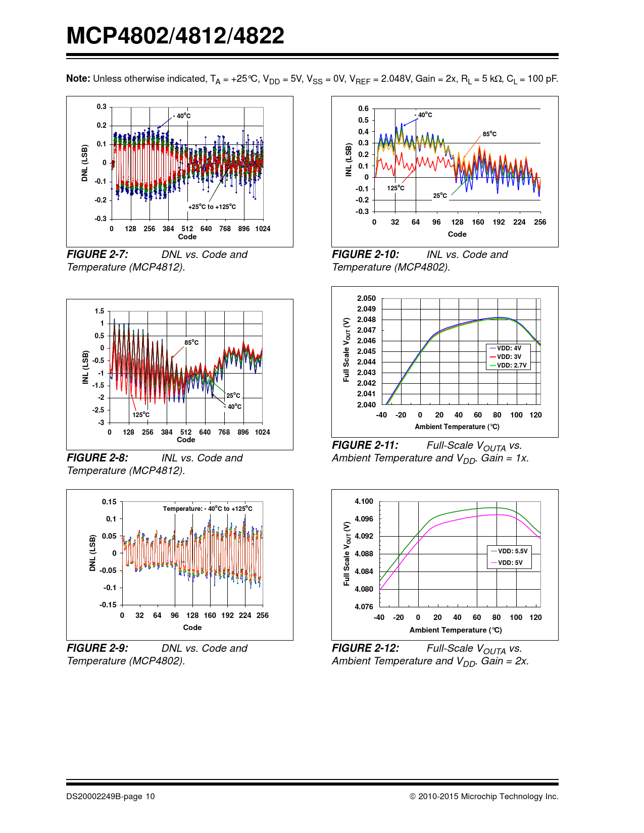 Full-Scale VOUTA vs. Temperature (MCP4802). Ambient Temperature and VDD. Gain = 2x. DS20002249B-page 10  2010-2015 Microchip Technology Inc. Document Outline 1.0 Electrical Characteristics FIGURE 1-1: SPI Input Timing Data. 2.0 Typical Performance Curves FIGURE 2-1: DNL vs. Code (MCP4822). FIGURE 2-2: DNL vs. Code and Temperature (MCP4822). FIGURE 2-3: Absolute DNL vs. Temperature (MCP4822). FIGURE 2-4: INL vs. Code and Temperature (MCP4822). FIGURE 2-5: Absolute INL vs. Temperature (MCP4822). FIGURE 2-6: INL vs. Code (MCP4822). FIGURE 2-7: DNL vs. Code and Temperature (MCP4812). FIGURE 2-8: INL vs. Code and Temperature (MCP4812). FIGURE 2-9: DNL vs. Code and Temperature (MCP4802). FIGURE 2-10: INL vs. Code and Temperature (MCP4802). FIGURE 2-11: Full-Scale VOUTA vs. Ambient Temperature and VDD. Gain = 1x. FIGURE 2-12: Full-Scale VOUTA vs. Ambient Temperature and VDD. Gain = 2x. FIGURE 2-13: Output Noise Voltage Density (VREF Noise Density) vs. Frequency. Gain = 1x. FIGURE 2-14: Output Noise Voltage (VREF Noise Voltage) vs. Bandwidth. Gain = 1x. FIGURE 2-15: IDD vs. Temperature and VDD. FIGURE 2-16: IDD Histogram (VDD = 2.7V). FIGURE 2-17: IDD Histogram (VDD = 5.0V). FIGURE 2-18: Software Shutdown Current vs. Temperature and VDD. FIGURE 2-19: Offset Error vs. Temperature and VDD. FIGURE 2-20: Gain Error vs. Temperature and VDD. FIGURE 2-21: VIN High Threshold vs. Temperature and VDD. FIGURE 2-22: VIN Low Threshold vs. Temperature and VDD. FIGURE 2-23: Input Hysteresis vs. Temperature and VDD. FIGURE 2-24: VOUT High Limit vs.Temperature and VDD. FIGURE 2-25: VOUT Low Limit vs. Temperature and VDD. FIGURE 2-26: IOUT High Short vs. Temperature and VDD. FIGURE 2-27: IOUT vs. VOUT. Gain = 2x. FIGURE 2-28: VOUT Rise Time. FIGURE 2-29: VOUT Fall Time. FIGURE 2-30: VOUT Rise Time. FIGURE 2-31: VOUT Rise Time. FIGURE 2-32: VOUT Rise Time Exit Shutdown. FIGURE 2-33: PSRR vs. Frequency. 3.0 Pin descriptions TABLE 3-1: Pin Function Table for MCP4802/4812/4822 3.1 Supply Voltage Pins (VDD, VSS) 3.2 Chip Select (CS) 3.3 Serial Clock Input (SCK) 3.4 Serial Data Input (SDI) 3.5 Latch DAC Input (LDAC) 3.6 Analog Outputs (VOUTA, VOUTB) 4.0 General Overview TABLE 4-1: LSb of each device FIGURE 4-1: Example for INL Error. FIGURE 4-2: Example for DNL Error. 4.1 Circuit Descriptions FIGURE 4-3: Typical Transient Response. FIGURE 4-4: Output Stage for Shutdown Mode. 5.0 Serial Interface 5.1 Overview 5.2 Write Command FIGURE 5-1: Write Command for MCP4822 (12-bit DAC). FIGURE 5-2: Write Command for MCP4812 (10-bit DAC). FIGURE 5-3: Write Command for MCP4802 (8-bit DAC). 6.0 Typical Applications 6.1 Digital Interface 6.2 Power Supply Considerations 6.3 Output Noise Considerations FIGURE 6-1: Typical Connection Diagram. 6.4 Layout Considerations 6.5 Single-Supply Operation 6.6 Bipolar Operation 6.7 Selectable Gain and Offset Bipolar Voltage Output Using a Dual Output DAC 6.8 Designing a Double-Precision DAC Using a Dual DAC 6.9 Building Programmable Current Source 7.0 Development support 7.1 Evaluation and Demonstration Boards 8.0 Packaging Information 8.1 Package Marking Information AMERICAS Corporate Office Atlanta Austin, TX Boston Chicago Cleveland Dallas Detroit Houston, TX Indianapolis Los Angeles New York, NY San Jose, CA Canada - Toronto ASIA/PACIFIC Asia Pacific Office Hong Kong Australia - Sydney China - Beijing China - Chengdu China - Chongqing China - Dongguan China - Hangzhou China - Hong Kong SAR China - Nanjing China - Qingdao China - Shanghai China - Shenyang China - Shenzhen China - Wuhan China - Xian ASIA/PACIFIC China - Xiamen China - Zhuhai India - Bangalore India - New Delhi India - Pune Japan - Osaka Japan - Tokyo Korea - Daegu Korea - Seoul Malaysia - Kuala Lumpur Malaysia - Penang Philippines - Manila Singapore Taiwan - Hsin Chu Taiwan - Kaohsiung Taiwan - Taipei Thailand - Bangkok EUROPE Austria - Wels Denmark - Copenhagen France - Paris Germany - Dusseldorf Germany - Munich Germany - Pforzheim Italy - Milan Italy - Venice Netherlands - Drunen Poland - Warsaw Spain - Madrid Sweden - Stockholm UK - Wokingham Worldwide Sales and Service
