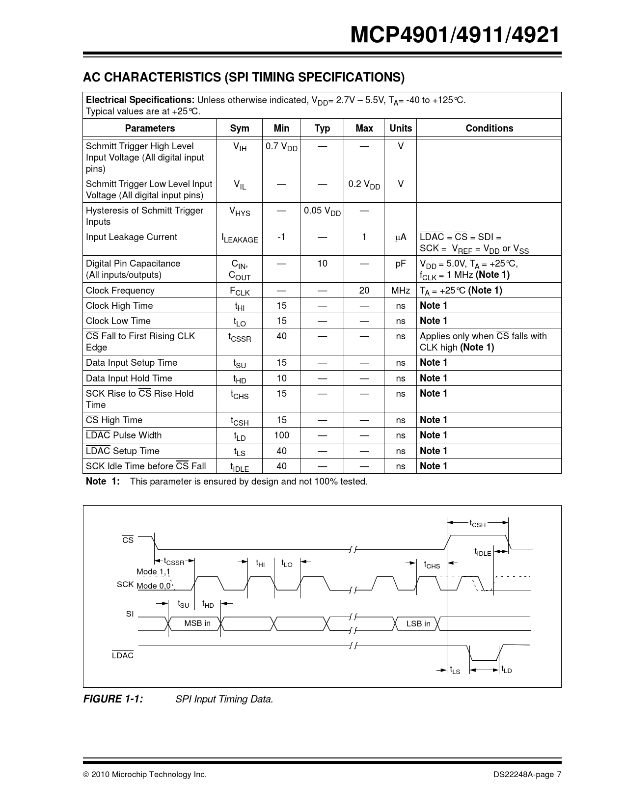link to page 7 link to page 7 link to page 7 link to page 7 link to page 7 link to page 7 link to page 7 link to page 7 link to page 7 link to page 7 link to page 7 link to page 7 MCP4901/4911/4921AC CHARACTERISTICS (SPI TIMING SPECIFICATIONS)Electrical Specifications: Unless otherwise indicated, VDD= 2.7V – 5.5V, TA= -40 to +125°C. Typical values are at +25°C. ParametersSymMinTypMaxUnitsConditions Schmitt Trigger High Level VIH 0.7 VDD — — V Input Voltage (All digital input pins) Schmitt Trigger Low Level Input VIL — — 0.2 VDD V Voltage (All digital input pins) Hysteresis of Schmitt Trigger VHYS — 0.05 VDD — Inputs Input Leakage Current ILEAKAGE -1 — 1 A LDAC = CS = SDI = SCK = VREF = VDD or VSS Digital Pin Capacitance CIN, — 10 — pF VDD = 5.0V, TA = +25°C, (All inputs/outputs) COUT fCLK = 1 MHz (Note 1) Clock Frequency FCLK — — 20 MHz TA = +25°C (Note 1) Clock High Time tHI 15 — — ns Note 1 Clock Low Time tLO 15 — — ns Note 1 CS Fall to First Rising CLK tCSSR 40 — — ns Applies only when CS falls with Edge CLK high (Note 1) Data Input Setup Time tSU 15 — — ns Note 1 Data Input Hold Time tHD 10 — — ns Note 1 SCK Rise to CS Rise Hold tCHS 15 — — ns Note 1 Time CS High Time tCSH 15 — — ns Note 1 LDAC Pulse Width tLD 100 — — ns Note 1 LDAC Setup Time tLS 40 — — ns Note 1 SCK Idle Time before CS Fall tIDLE 40 — — ns Note 1Note 1: This parameter is ensured by design and not 100% tested. tCSH CS tIDLE tCSSR t t HI LO tCHS Mode 1,1 SCK Mode 0,0 t t SU HD SI MSB in LSB in LDAC t t LS LD FIGURE 1-1: SPI Input Timing Data. 2010 Microchip Technology Inc. DS22248A-page 7 Document Outline 1.0 Electrical Characteristics FIGURE 1-1: SPI Input Timing Data. 2.0 Typical Performance Curves FIGURE 2-1: DNL vs. Code (MCP4921). FIGURE 2-2: DNL vs. Code and Temperature (MCP4921). FIGURE 2-3: DNL vs. Code and VREF, Gain=1 (MCP4921). FIGURE 2-4: Absolute DNL vs. Temperature (MCP4921). FIGURE 2-5: Absolute DNL vs. Voltage Reference (MCP4921). FIGURE 2-6: INL vs. Code and Temperature (MCP4921). FIGURE 2-7: Absolute INL vs. Temperature (MCP4921). FIGURE 2-8: Absolute INL vs. VREF (MCP4921). FIGURE 2-9: INL vs. Code and VREF (MCP4921). FIGURE 2-10: INL vs. Code (MCP4921). FIGURE 2-11: DNL vs. Code and Temperature (MCP4911). FIGURE 2-12: INL vs. Code and Temperature (MCP4911). FIGURE 2-13: DNL vs. Code and Temperature (MCP4901). FIGURE 2-14: INL vs. Code and Temperature (MCP4901). FIGURE 2-15: IDD vs. Temperature and VDD. FIGURE 2-16: IDD Histogram (VDD = 2.7V). FIGURE 2-17: IDD Histogram (VDD = 5.0V). FIGURE 2-18: Shutdown Current vs. Temperature and VDD. FIGURE 2-19: Offset Error vs.Temperature and VDD. FIGURE 2-20: Gain Error vs. Temperature and VDD. FIGURE 2-21: VIN High Threshold vs. Temperature and VDD. FIGURE 2-22: VIN Low Threshold vs. Temperature and VDD. FIGURE 2-23: Input Hysteresis vs. Temperature and VDD. FIGURE 2-24: VREF Input Impedance vs. Temperature and VDD. FIGURE 2-25: VOUT High Limit vs. Temperature and VDD. FIGURE 2-26: VOUT Low Limit vs. Temperature and VDD. FIGURE 2-27: IOUT High Short vs. Temperature and VDD. FIGURE 2-28: IOUT vs. VOUT. Gain = 1. FIGURE 2-29: VOUT Rise Time FIGURE 2-30: VOUT Fall Time. FIGURE 2-31: VOUT Rise Time FIGURE 2-32: VOUT Rise Time FIGURE 2-33: VOUT Rise Time Exit Shutdown. FIGURE 2-34: PSRR vs. Frequency. FIGURE 2-35: Multiplier Mode Bandwidth. FIGURE 2-36: -3 db Bandwidth vs. Worst Codes. FIGURE 2-37: Phase Shift. 3.0 Pin Descriptions TABLE 3-1: Pin Function Table 3.1 Supply Voltage Pins (VDD, VSS) 3.2 Chip Select (CS) 3.3 Serial Clock Input (SCK) 3.4 Serial Data Input (SDI) 3.5 Latch DAC Input (LDAC) 3.6 Analog Output (VOUT) 3.7 Voltage Reference Input (VREF) 3.8 Exposed Thermal Pad (EP) 4.0 General Overview TABLE 4-1: LSb of each device 4.1 DC Accuracy FIGURE 4-1: Example for INL Error. FIGURE 4-2: Example for DNL Accuracy. 4.2 Circuit Descriptions FIGURE 4-3: Typical Transient Response. FIGURE 4-4: Output Stage for Shutdown Mode. 5.0 Serial Interface 5.1 Overview 5.2 Write Command FIGURE 5-1: Write Command for MCP4921 (12-bit DAC). FIGURE 5-2: Write Command for MCP4911 (10-bit DAC). Note: X are don’t care bits. FIGURE 5-3: Write Command for MCP4901(8-bit DAC). Note: X are don’t care bits. 6.0 Typical Applications 6.1 Digital Interface 6.2 Power Supply Considerations FIGURE 6-1: Typical Connection Diagram. 6.3 Layout Considerations 6.4 Single-Supply Operation 6.5 Bipolar Operation 6.6 Selectable Gain and Offset Bipolar Voltage Output Using DAC Devices 6.7 Designing a Double-Precision DAC 6.8 Building Programmable Current Source 6.9 Using Multiplier Mode 7.0 Development support 7.1 Evaluation & Demonstration Boards 8.0 Packaging Information 8.1 Package Marking Information Corporate Office Atlanta Boston Chicago Cleveland Fax: 216-447-0643 Dallas Detroit Kokomo Toronto Fax: 852-2401-3431 Australia - Sydney China - Beijing China - Shanghai India - Bangalore Korea - Daegu Korea - Seoul Singapore Taiwan - Taipei Fax: 43-7242-2244-393 Denmark - Copenhagen France - Paris Germany - Munich Italy - Milan Spain - Madrid UK - Wokingham Worldwide Sales and Service